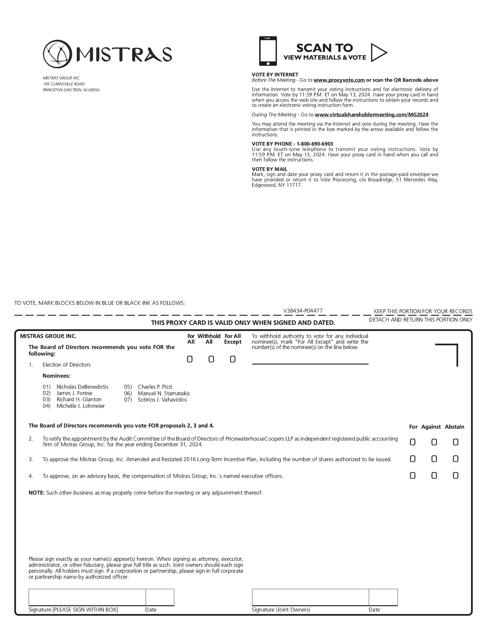 • | FOR the ratification of the appointment by the Audit Committee of the Board of Directors of PricewaterhouseCoopers LLP as our independent registered public accounting firm of Mistras Group, Inc for the year ending December 31, 2024 (Item 2); |
