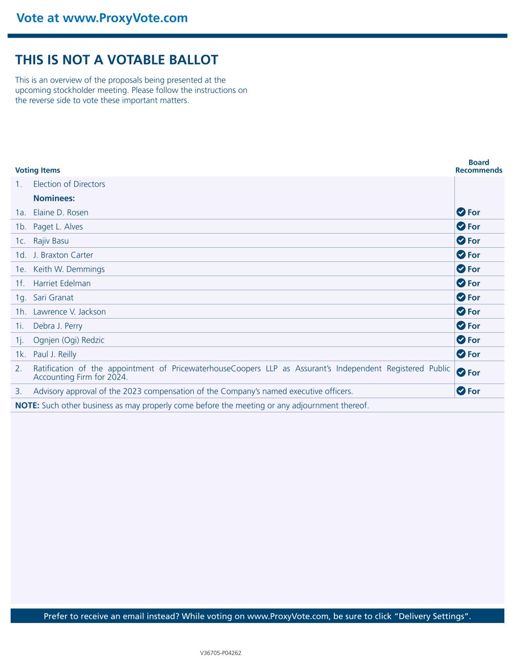Vote at www.ProxyVote.com Prefer to receive an email instead? While voting on www.ProxyVote.com, be sure to click “Delivery Settings”. Voting Items Board Recommends V36705-P04262 THIS IS NOT A VOTABLE BALLOT This is an overview of the proposals being presented at the upcoming stockholder meeting. Please follow the instructions on the reverse side to vote these important matters. 1. Election of Directors Nominees: 1a. Elaine D. Rosen For 1b. Paget L. Alves For 1c. Rajiv Basu For 1d. J. Braxton Carter For 1e. Keith W. Demmings For 1f. Harriet Edelman For 1g. Sari Granat For 1h. Lawrence V. Jackson For 1i. Debra J. Perry For 1j. Ognjen (Ogi) Redzic For 1k. Paul J. Reilly For 2. Ratification of the appointment of PricewaterhouseCoopers LLP as Assurant’s Independent Registered Public Accounting Firm for 2024. For 3. Advisory approval of the 2023 compensation of the Company’s named executive officers. For NOTE: Such other business as may properly come before the meeting or any adjournment thereof.