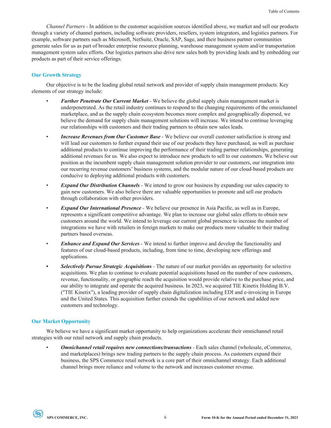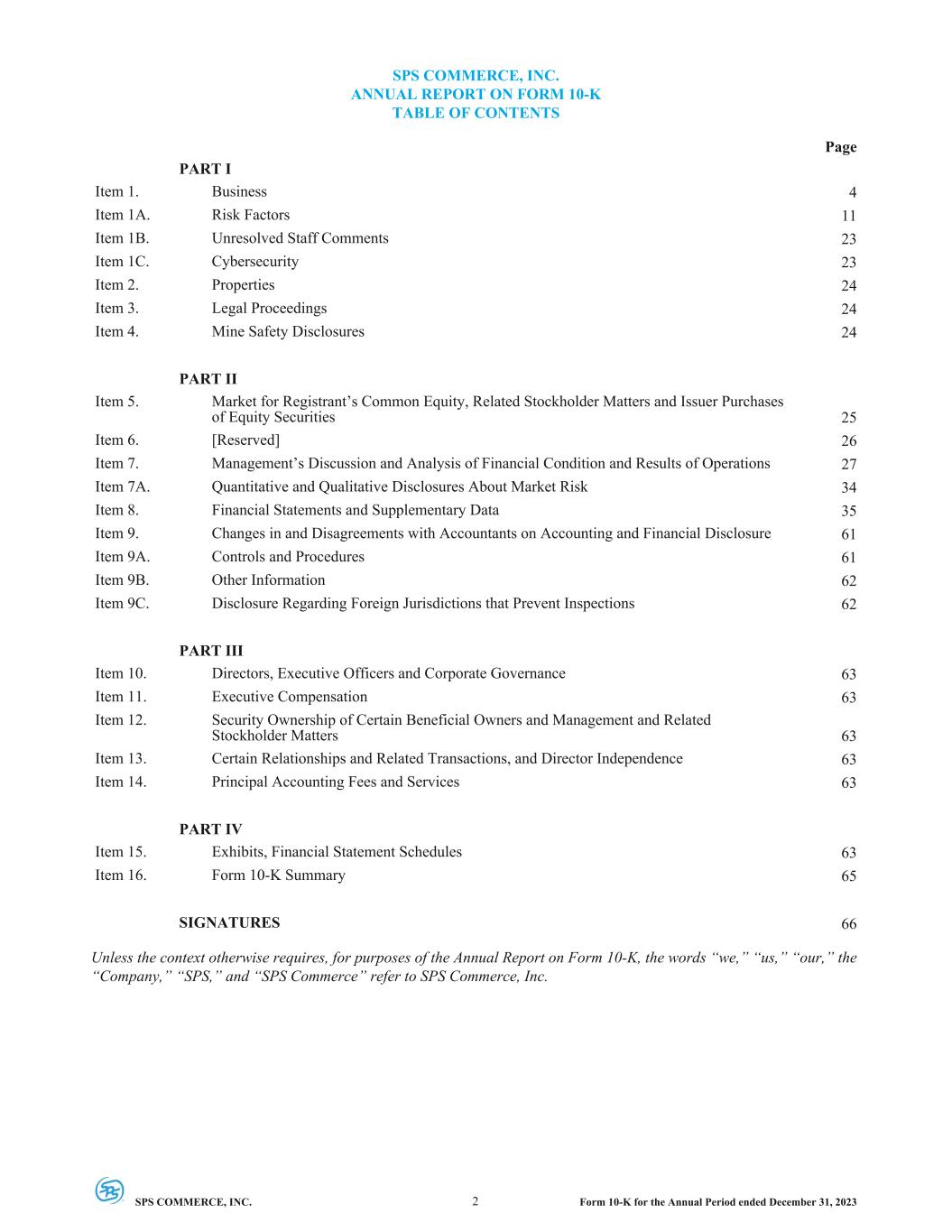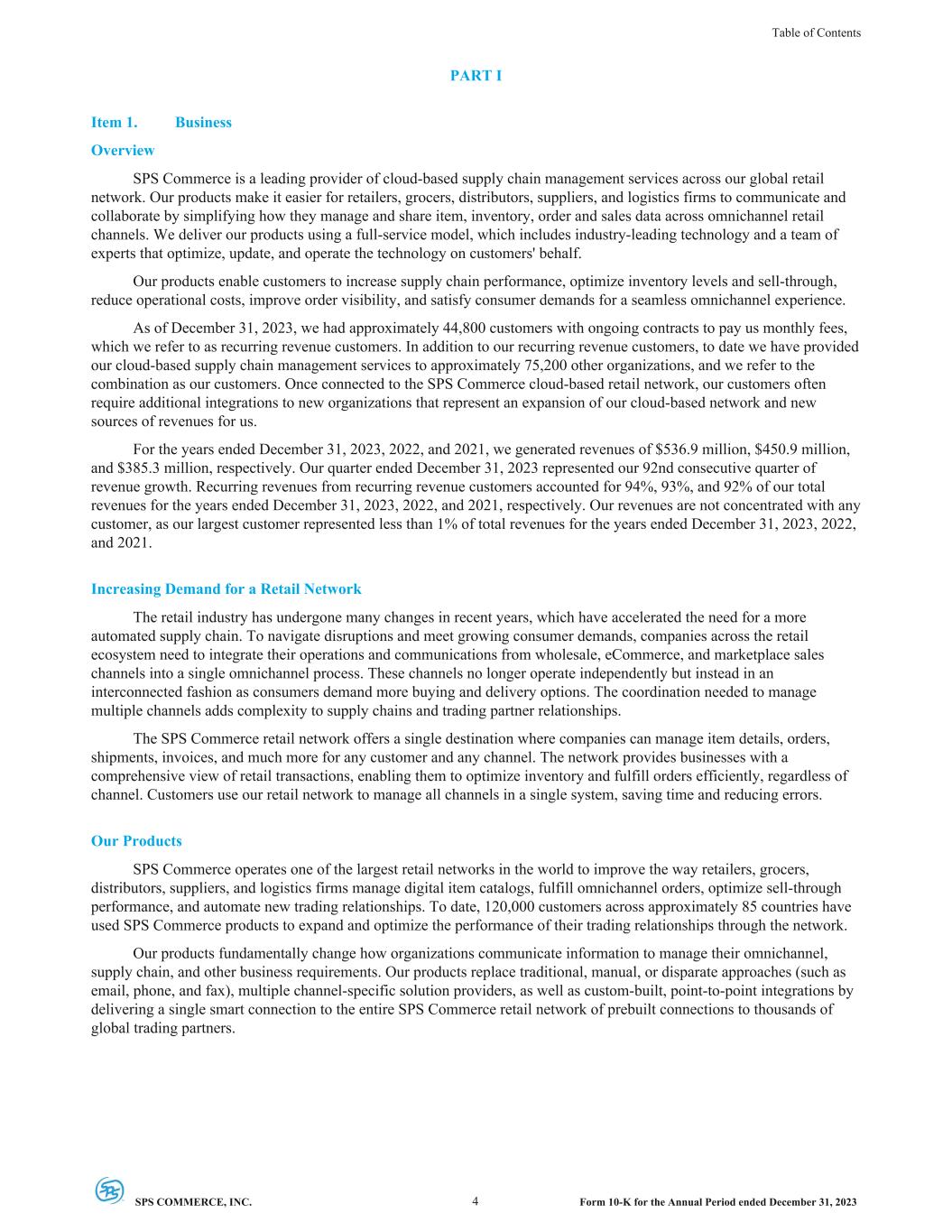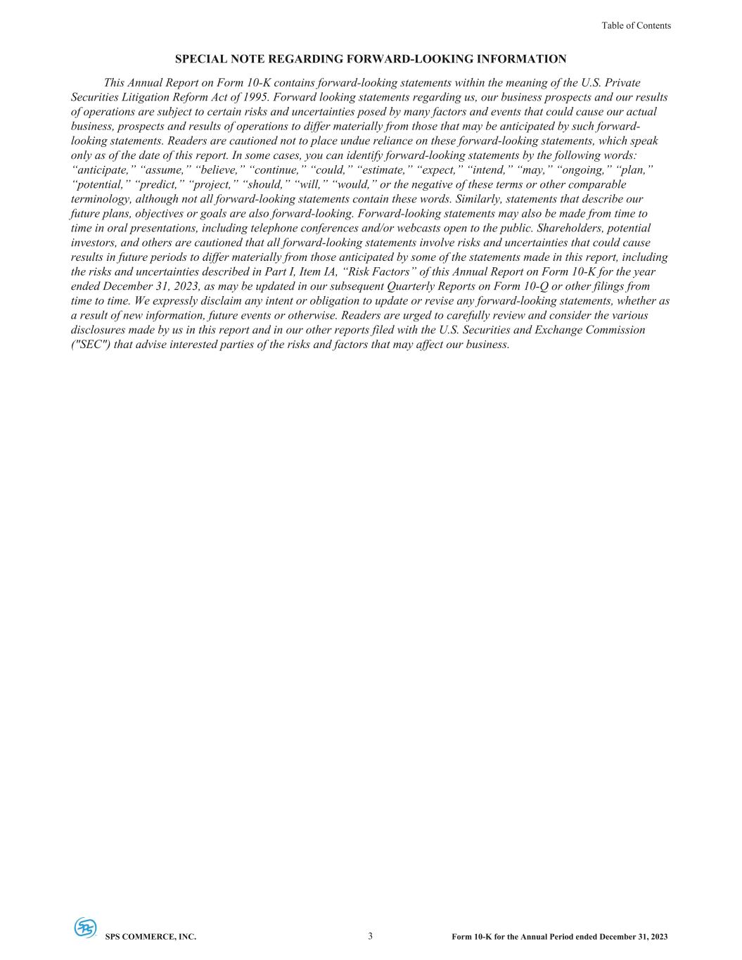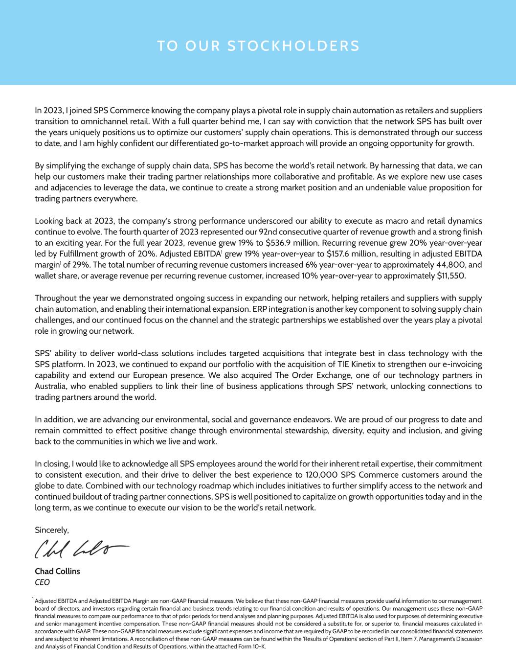 T O O U R S T O C K H O L D E R S In 2023, I joined SPS Commerce knowing the company plays a pivotal role in supply chain automation as retailers and suppliers transition to omnichannel retail. With a full quarter behind me, I can say with conviction that the network SPS has built over the years uniquely positions us to optimize our customers’ supply chain operations. This is demonstrated through our success to date, and I am highly confident our differentiated go-to-market approach will provide an ongoing opportunity for growth. By simplifying the exchange of supply chain data, SPS has become the world’s retail network. By harnessing that data, we can help our customers make their trading partner relationships more collaborative and profitable. As we explore new use cases and adjacencies to leverage the data, we continue to create a strong market position and an undeniable value proposition for trading partners everywhere. Looking back at 2023, the company’s strong performance underscored our ability to execute as macro and retail dynamics continue to evolve. The fourth quarter of 2023 represented our 92nd consecutive quarter of revenue growth and a strong finish to an exciting year. For the full year 2023, revenue grew 19% to $536.9 million. Recurring revenue grew 20% year-over-year led by Fulfillment growth of 20%. Adjusted EBITDA1 grew 19% year-over-year to $157.6 million, resulting in adjusted EBITDA margin1 of 29%. The total number of recurring revenue customers increased 6% year-over-year to approximately 44,800, and wallet share, or average revenue per recurring revenue customer, increased 10% year-over-year to approximately $11,550. Throughout the year we demonstrated ongoing success in expanding our network, helping retailers and suppliers with supply chain automation, and enabling their international expansion. ERP integration is another key component to solving supply chain challenges, and our continued focus on the channel and the strategic partnerships we established over the years play a pivotal role in growing our network. SPS’ ability to deliver world-class solutions includes targeted acquisitions that integrate best in class technology with the SPS platform. In 2023, we continued to expand our portfolio with the acquisition of TIE Kinetix to strengthen our e-invoicing capability and extend our European presence. We also acquired The Order Exchange, one of our technology partners in Australia, who enabled suppliers to link their line of business applications through SPS’ network, unlocking connections to trading partners around the world. In addition, we are advancing our environmental, social and governance endeavors. We are proud of our progress to date and remain committed to effect positive change through environmental stewardship, diversity, equity and inclusion, and giving back to the communities in which we live and work. In closing, I would like to acknowledge all SPS employees around the world for their inherent retail expertise, their commitment to consistent execution, and their drive to deliver the best experience to 120,000 SPS Commerce customers around the globe to date. Combined with our technology roadmap which includes initiatives to further simplify access to the network and continued buildout of trading partner connections, SPS is well positioned to capitalize on growth opportunities today and in the long term, as we continue to execute our vision to be the world’s retail network. Sincerely, Chad Collins CEO 1 Adjusted EBITDA and Adjusted EBITDA Margin are non-GAAP financial measures. We believe that these non-GAAP financial measures provide useful information to our management, board of directors, and investors regarding certain financial and business trends relating to our financial condition and results of operations. Our management uses these non-GAAP financial measures to compare our performance to that of prior periods for trend analyses and planning purposes. Adjusted EBITDA is also used for purposes of determining executive and senior management incentive compensation. These non-GAAP financial measures should not be considered a substitute for, or superior to, financial measures calculated in accordance with GAAP. These non-GAAP financial measures exclude significant expenses and income that are required by GAAP to be recorded in our consolidated financial statements and are subject to inherent limitations. A reconciliation of these non-GAAP measures can be found within the ‘Results of Operations’ section of Part II, Item 7, Management’s Discussion and Analysis of Financial Condition and Results of Operations, within the attached Form 10-K.