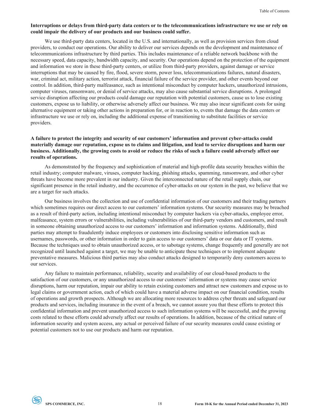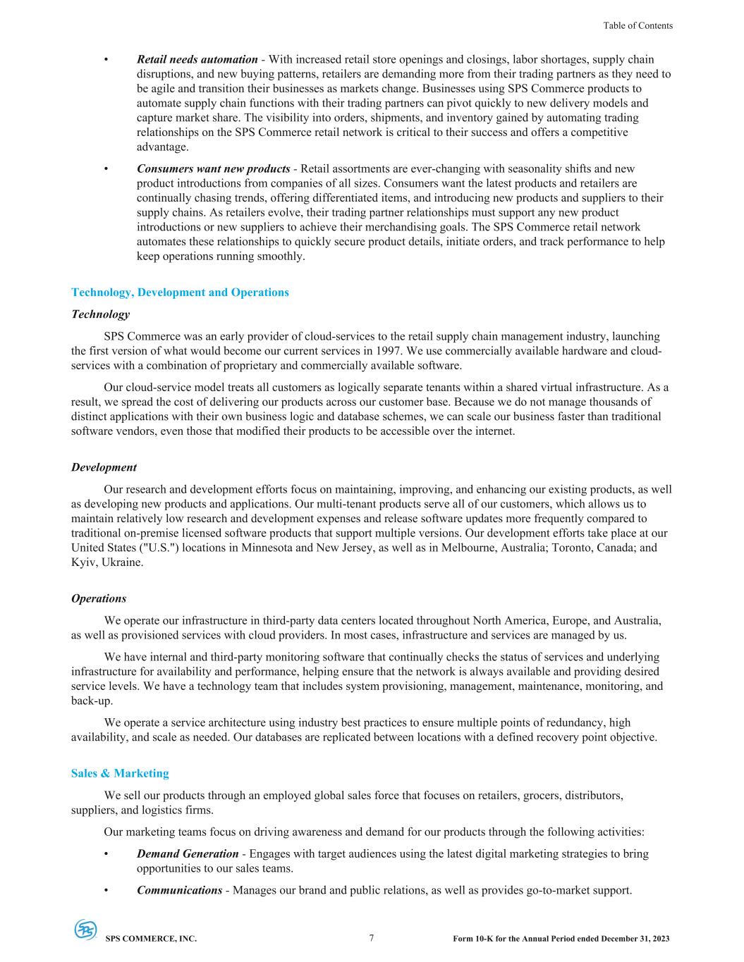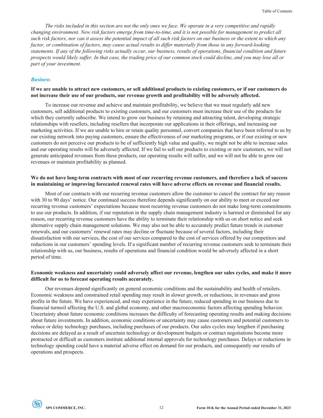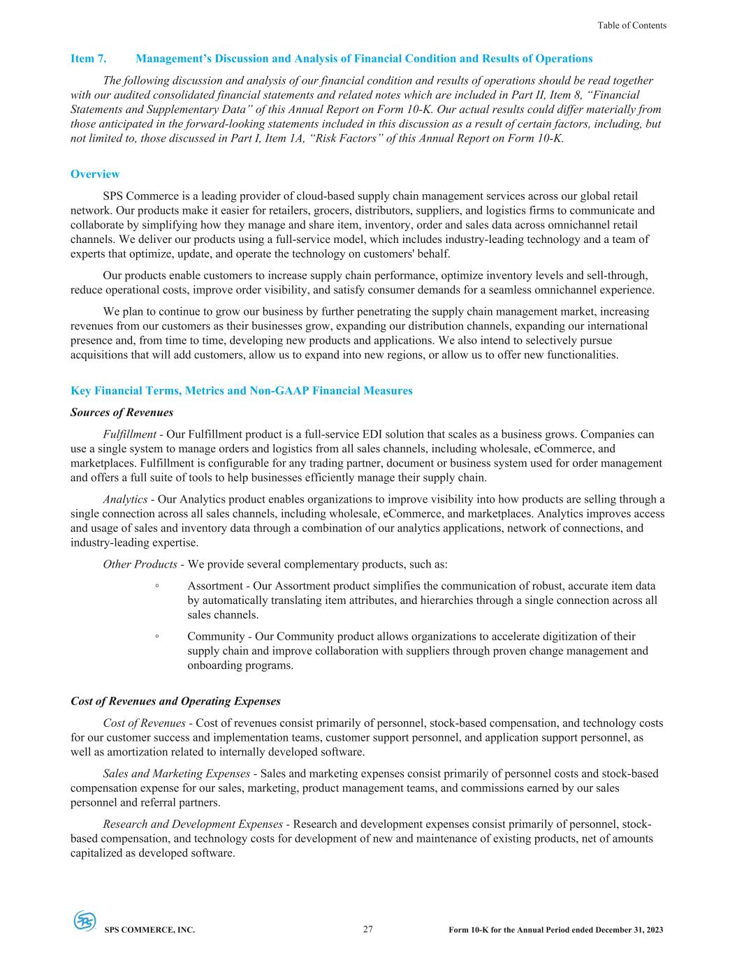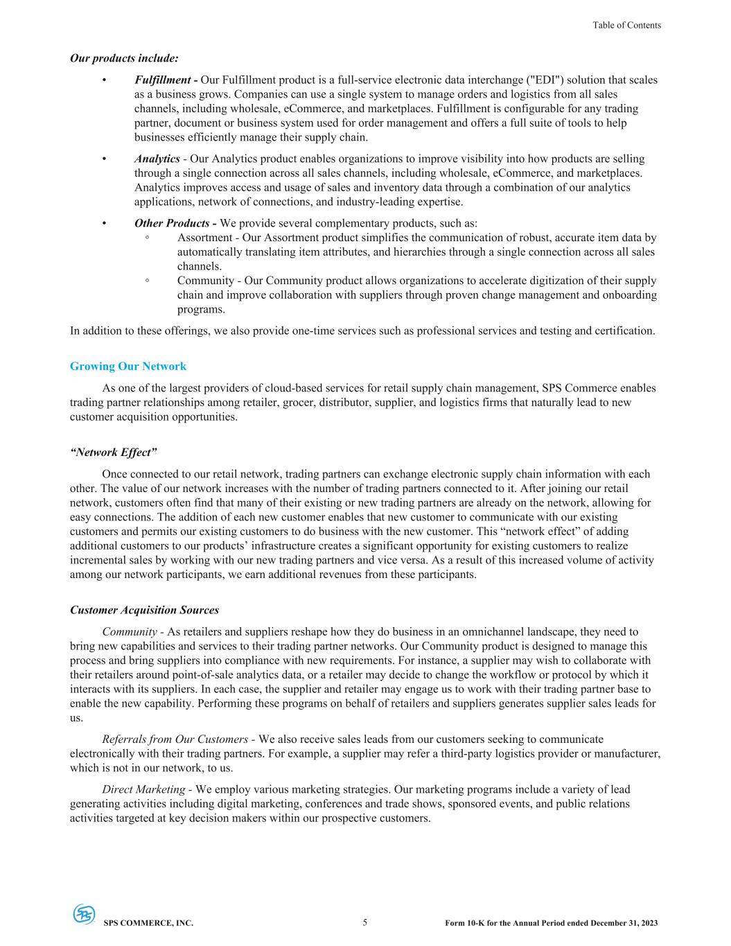 T O O U R S T O C K H O L D E R S In 2023, I joined SPS Commerce knowing the company plays a pivotal role in supply chain automation as retailers and suppliers transition to omnichannel retail. With a full quarter behind me, I can say with conviction that the network SPS has built over the years uniquely positions us to optimize our customers’ supply chain operations. This is demonstrated through our success to date, and I am highly confident our differentiated go-to-market approach will provide an ongoing opportunity for growth. By simplifying the exchange of supply chain data, SPS has become the world’s retail network. By harnessing that data, we can help our customers make their trading partner relationships more collaborative and profitable. As we explore new use cases and adjacencies to leverage the data, we continue to create a strong market position and an undeniable value proposition for trading partners everywhere. Looking back at 2023, the company’s strong performance underscored our ability to execute as macro and retail dynamics continue to evolve. The fourth quarter of 2023 represented our 92nd consecutive quarter of revenue growth and a strong finish to an exciting year. For the full year 2023, revenue grew 19% to $536.9 million. Recurring revenue grew 20% year-over-year led by Fulfillment growth of 20%. Adjusted EBITDA1 grew 19% year-over-year to $157.6 million, resulting in adjusted EBITDA margin1 of 29%. The total number of recurring revenue customers increased 6% year-over-year to approximately 44,800, and wallet share, or average revenue per recurring revenue customer, increased 10% year-over-year to approximately $11,550. Throughout the year we demonstrated ongoing success in expanding our network, helping retailers and suppliers with supply chain automation, and enabling their international expansion. ERP integration is another key component to solving supply chain challenges, and our continued focus on the channel and the strategic partnerships we established over the years play a pivotal role in growing our network. SPS’ ability to deliver world-class solutions includes targeted acquisitions that integrate best in class technology with the SPS platform. In 2023, we continued to expand our portfolio with the acquisition of TIE Kinetix to strengthen our e-invoicing capability and extend our European presence. We also acquired The Order Exchange, one of our technology partners in Australia, who enabled suppliers to link their line of business applications through SPS’ network, unlocking connections to trading partners around the world. In addition, we are advancing our environmental, social and governance endeavors. We are proud of our progress to date and remain committed to effect positive change through environmental stewardship, diversity, equity and inclusion, and giving back to the communities in which we live and work. In closing, I would like to acknowledge all SPS employees around the world for their inherent retail expertise, their commitment to consistent execution, and their drive to deliver the best experience to 120,000 SPS Commerce customers around the globe to date. Combined with our technology roadmap which includes initiatives to further simplify access to the network and continued buildout of trading partner connections, SPS is well positioned to capitalize on growth opportunities today and in the long term, as we continue to execute our vision to be the world’s retail network. Sincerely, Chad Collins CEO 1 Adjusted EBITDA and Adjusted EBITDA Margin are non-GAAP financial measures. We believe that these non-GAAP financial measures provide useful information to our management, board of directors, and investors regarding certain financial and business trends relating to our financial condition and results of operations. Our management uses these non-GAAP financial measures to compare our performance to that of prior periods for trend analyses and planning purposes. Adjusted EBITDA is also used for purposes of determining executive and senior management incentive compensation. These non-GAAP financial measures should not be considered a substitute for, or superior to, financial measures calculated in accordance with GAAP. These non-GAAP financial measures exclude significant expenses and income that are required by GAAP to be recorded in our consolidated financial statements and are subject to inherent limitations. A reconciliation of these non-GAAP measures can be found within the ‘Results of Operations’ section of Part II, Item 7, Management’s Discussion and Analysis of Financial Condition and Results of Operations, within the attached Form 10-K.