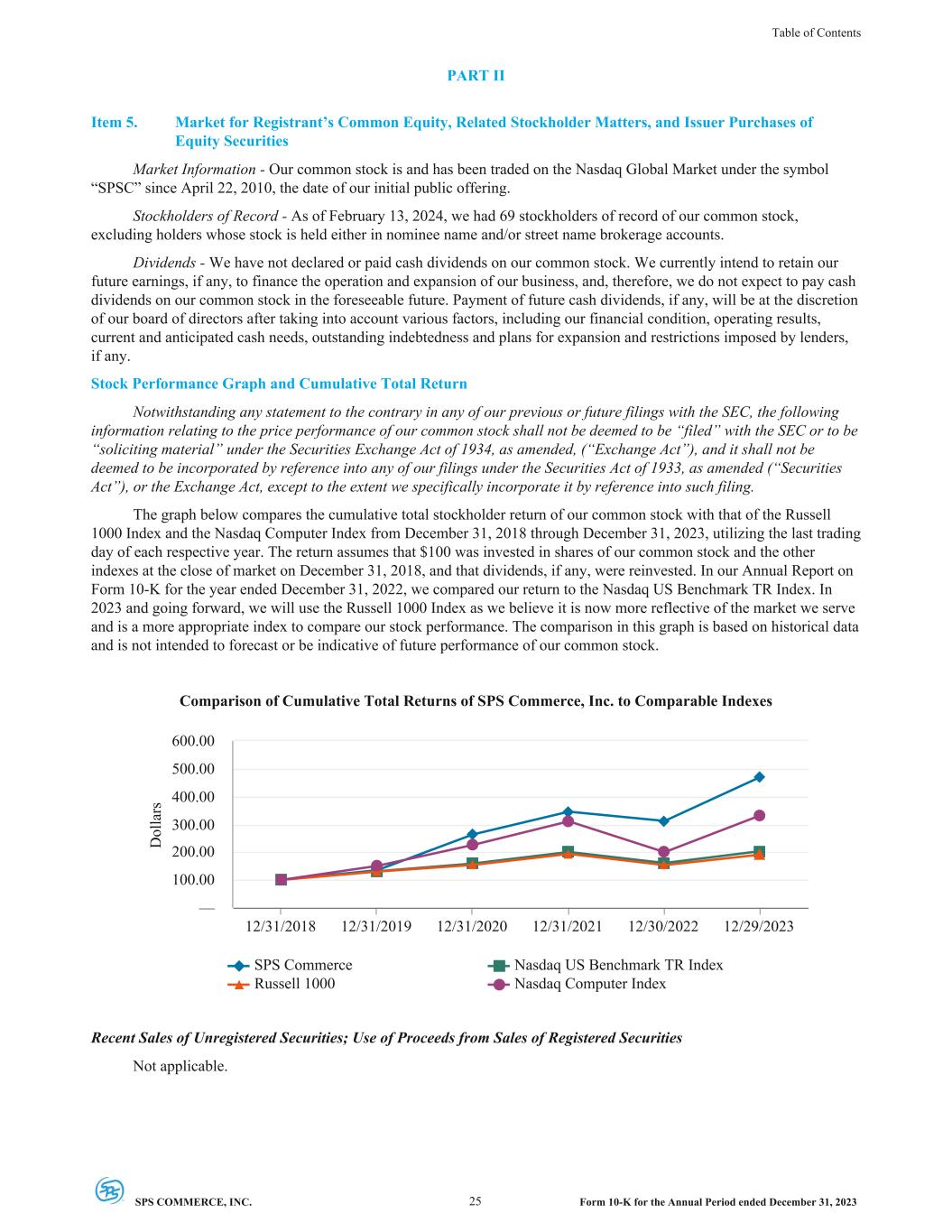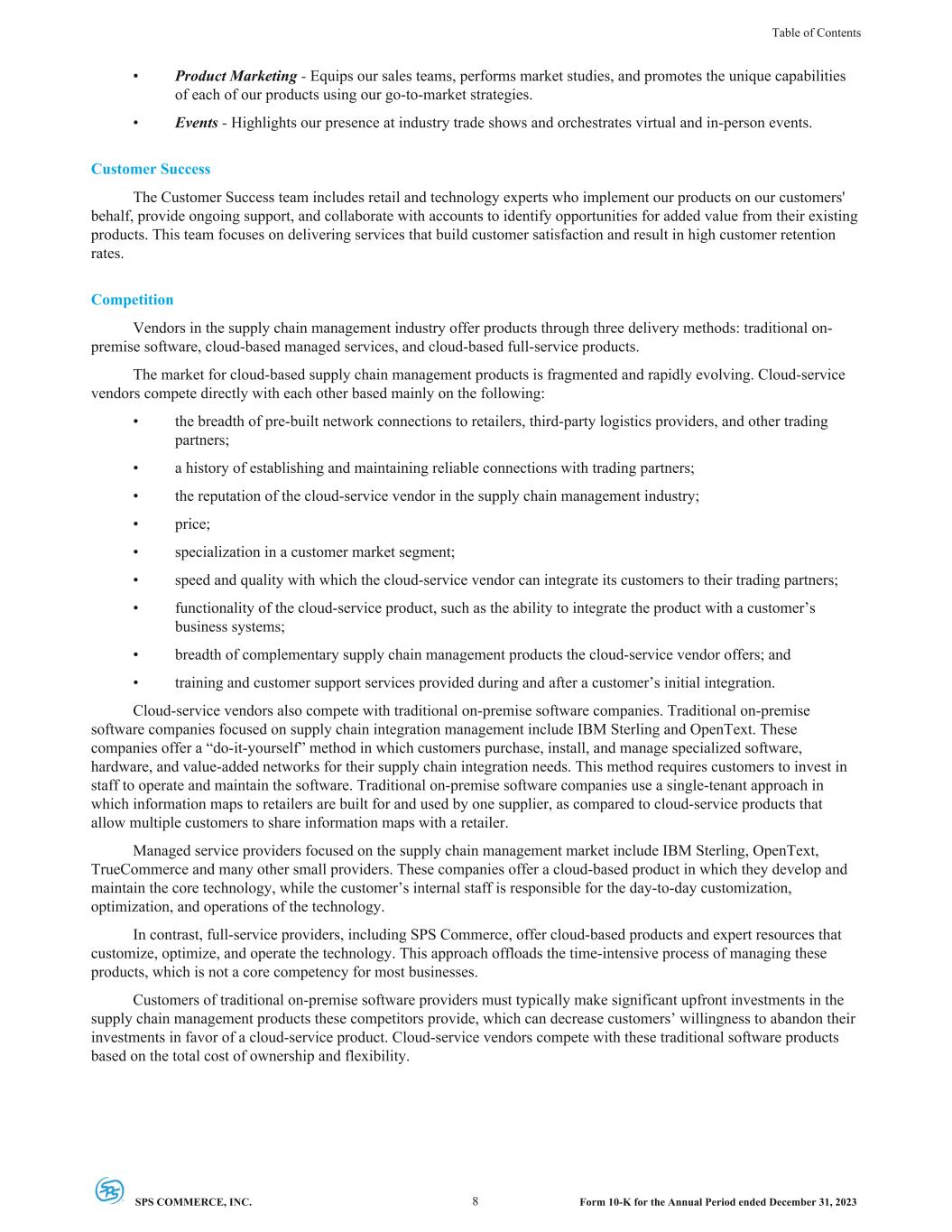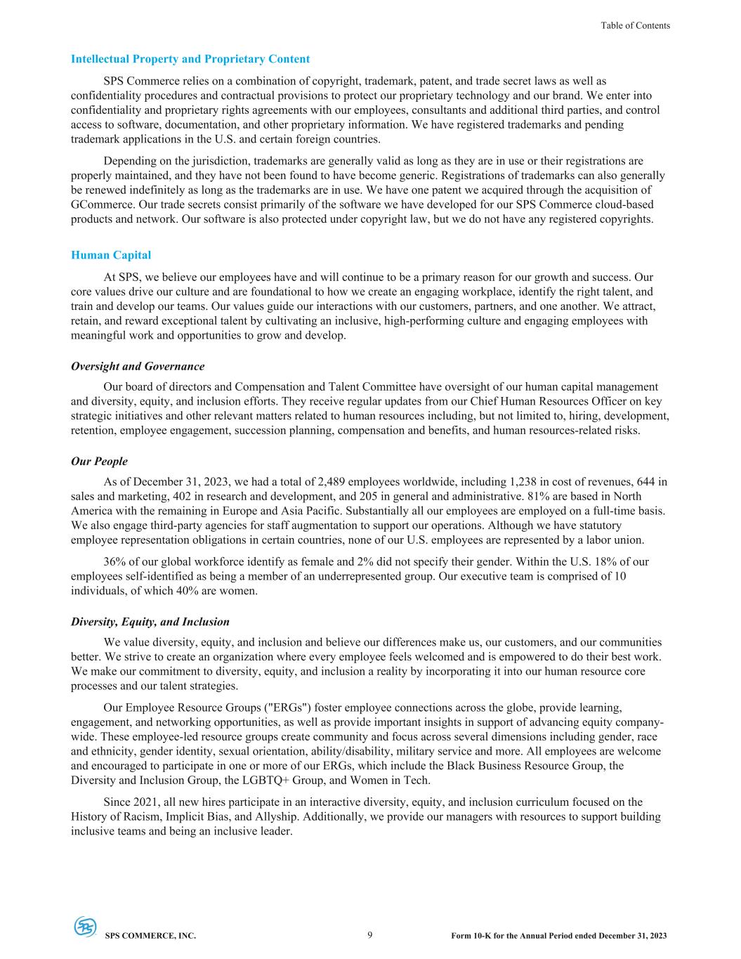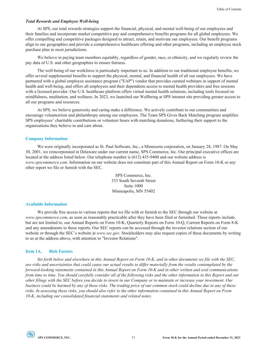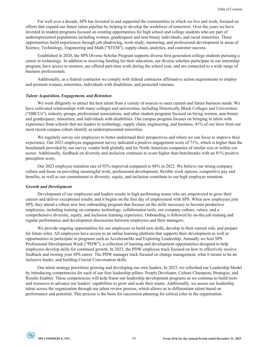 T O O U R S T O C K H O L D E R S In 2023, I joined SPS Commerce knowing the company plays a pivotal role in supply chain automation as retailers and suppliers transition to omnichannel retail. With a full quarter behind me, I can say with conviction that the network SPS has built over the years uniquely positions us to optimize our customers’ supply chain operations. This is demonstrated through our success to date, and I am highly confident our differentiated go-to-market approach will provide an ongoing opportunity for growth. By simplifying the exchange of supply chain data, SPS has become the world’s retail network. By harnessing that data, we can help our customers make their trading partner relationships more collaborative and profitable. As we explore new use cases and adjacencies to leverage the data, we continue to create a strong market position and an undeniable value proposition for trading partners everywhere. Looking back at 2023, the company’s strong performance underscored our ability to execute as macro and retail dynamics continue to evolve. The fourth quarter of 2023 represented our 92nd consecutive quarter of revenue growth and a strong finish to an exciting year. For the full year 2023, revenue grew 19% to $536.9 million. Recurring revenue grew 20% year-over-year led by Fulfillment growth of 20%. Adjusted EBITDA1 grew 19% year-over-year to $157.6 million, resulting in adjusted EBITDA margin1 of 29%. The total number of recurring revenue customers increased 6% year-over-year to approximately 44,800, and wallet share, or average revenue per recurring revenue customer, increased 10% year-over-year to approximately $11,550. Throughout the year we demonstrated ongoing success in expanding our network, helping retailers and suppliers with supply chain automation, and enabling their international expansion. ERP integration is another key component to solving supply chain challenges, and our continued focus on the channel and the strategic partnerships we established over the years play a pivotal role in growing our network. SPS’ ability to deliver world-class solutions includes targeted acquisitions that integrate best in class technology with the SPS platform. In 2023, we continued to expand our portfolio with the acquisition of TIE Kinetix to strengthen our e-invoicing capability and extend our European presence. We also acquired The Order Exchange, one of our technology partners in Australia, who enabled suppliers to link their line of business applications through SPS’ network, unlocking connections to trading partners around the world. In addition, we are advancing our environmental, social and governance endeavors. We are proud of our progress to date and remain committed to effect positive change through environmental stewardship, diversity, equity and inclusion, and giving back to the communities in which we live and work. In closing, I would like to acknowledge all SPS employees around the world for their inherent retail expertise, their commitment to consistent execution, and their drive to deliver the best experience to 120,000 SPS Commerce customers around the globe to date. Combined with our technology roadmap which includes initiatives to further simplify access to the network and continued buildout of trading partner connections, SPS is well positioned to capitalize on growth opportunities today and in the long term, as we continue to execute our vision to be the world’s retail network. Sincerely, Chad Collins CEO 1 Adjusted EBITDA and Adjusted EBITDA Margin are non-GAAP financial measures. We believe that these non-GAAP financial measures provide useful information to our management, board of directors, and investors regarding certain financial and business trends relating to our financial condition and results of operations. Our management uses these non-GAAP financial measures to compare our performance to that of prior periods for trend analyses and planning purposes. Adjusted EBITDA is also used for purposes of determining executive and senior management incentive compensation. These non-GAAP financial measures should not be considered a substitute for, or superior to, financial measures calculated in accordance with GAAP. These non-GAAP financial measures exclude significant expenses and income that are required by GAAP to be recorded in our consolidated financial statements and are subject to inherent limitations. A reconciliation of these non-GAAP measures can be found within the ‘Results of Operations’ section of Part II, Item 7, Management’s Discussion and Analysis of Financial Condition and Results of Operations, within the attached Form 10-K.