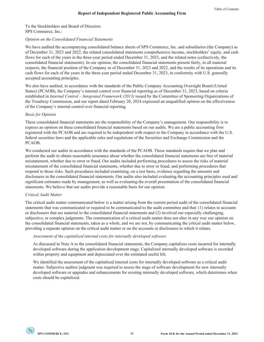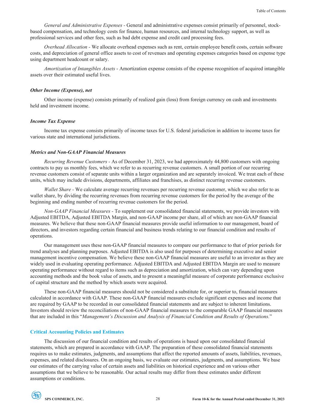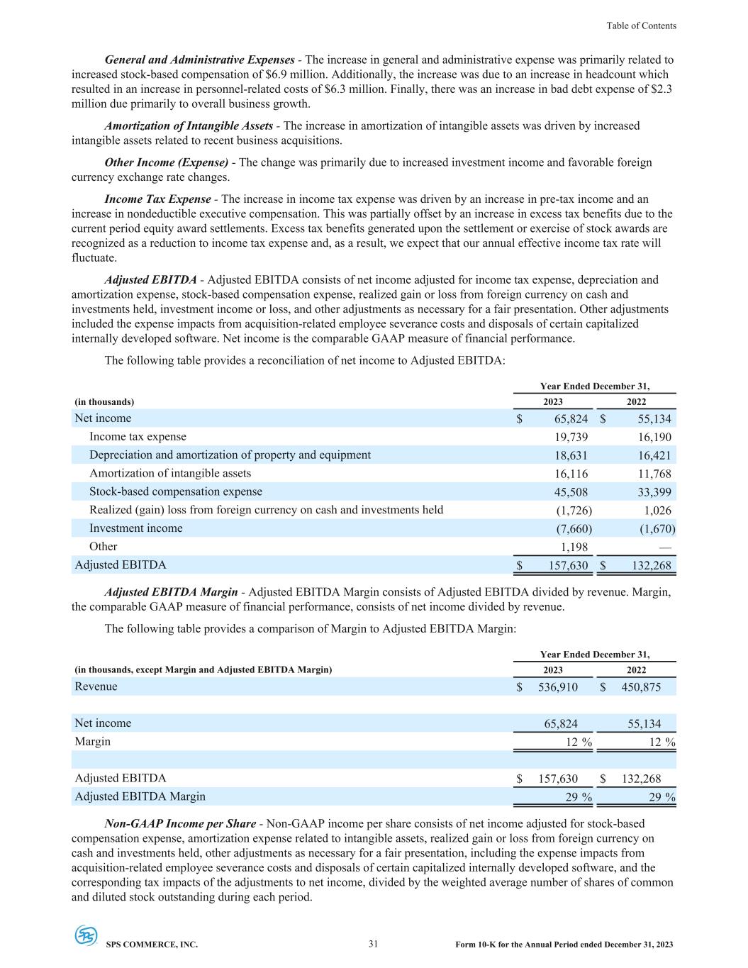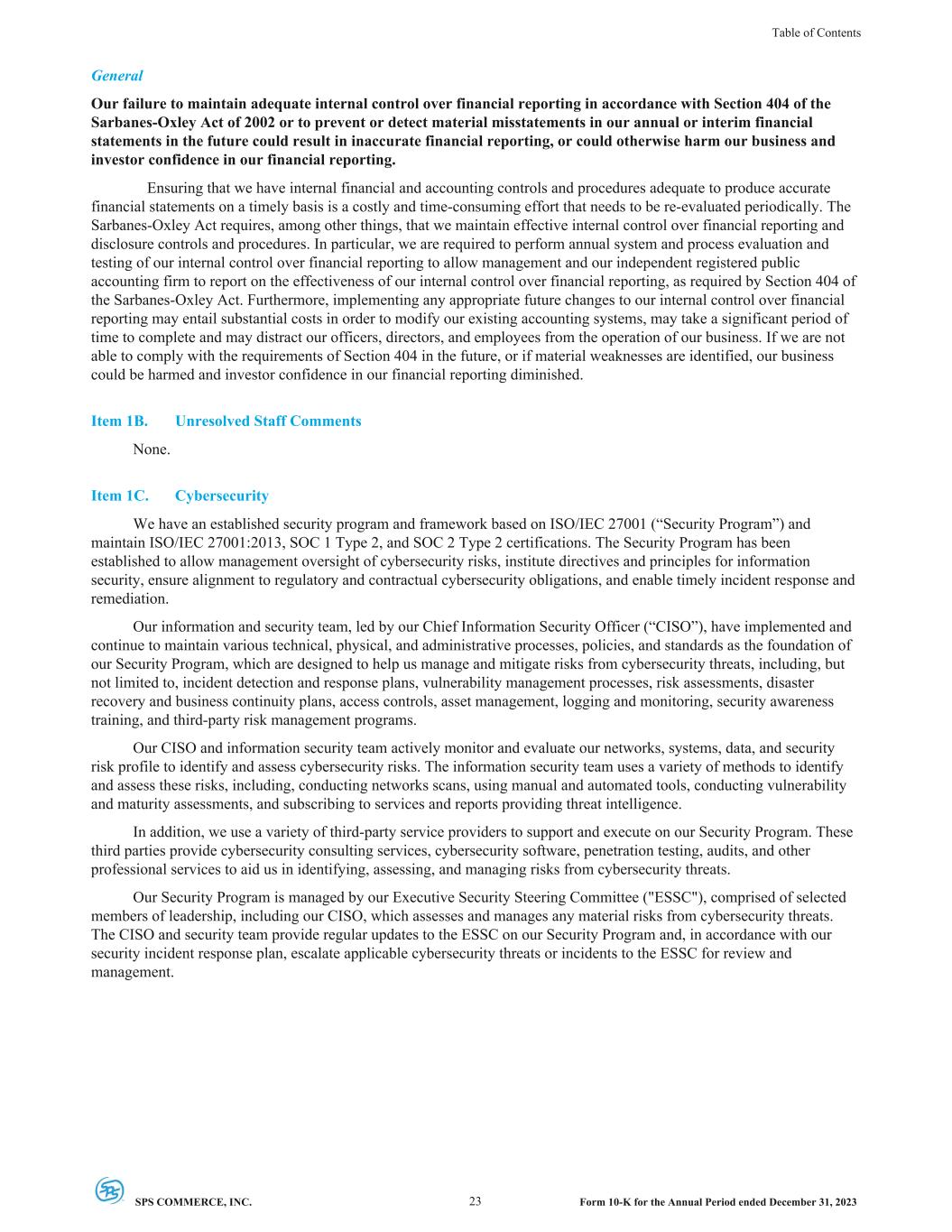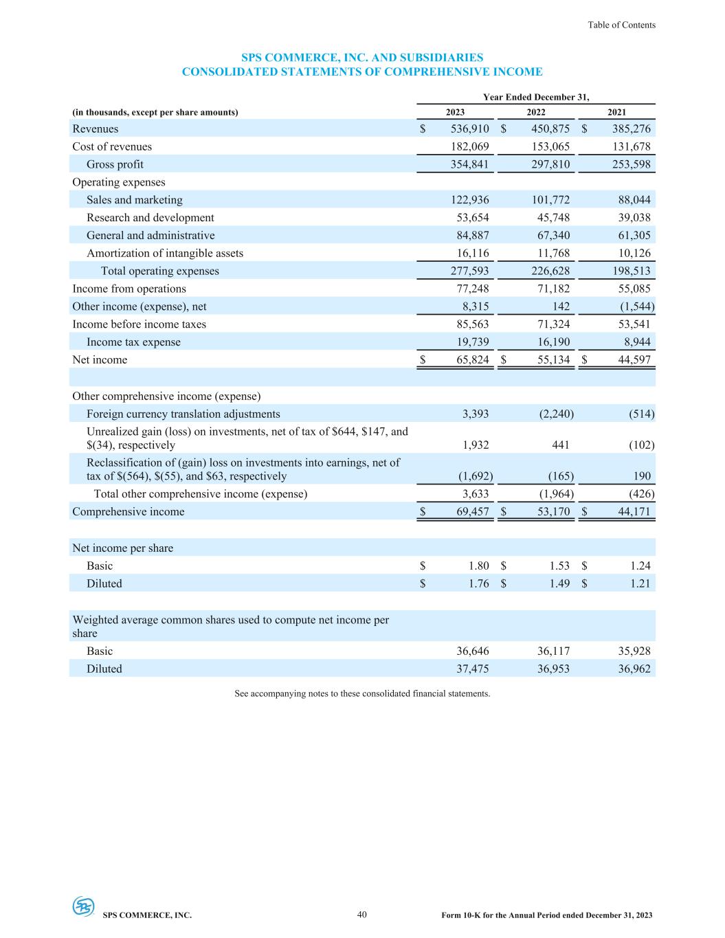 T O O U R S T O C K H O L D E R S In 2023, I joined SPS Commerce knowing the company plays a pivotal role in supply chain automation as retailers and suppliers transition to omnichannel retail. With a full quarter behind me, I can say with conviction that the network SPS has built over the years uniquely positions us to optimize our customers’ supply chain operations. This is demonstrated through our success to date, and I am highly confident our differentiated go-to-market approach will provide an ongoing opportunity for growth. By simplifying the exchange of supply chain data, SPS has become the world’s retail network. By harnessing that data, we can help our customers make their trading partner relationships more collaborative and profitable. As we explore new use cases and adjacencies to leverage the data, we continue to create a strong market position and an undeniable value proposition for trading partners everywhere. Looking back at 2023, the company’s strong performance underscored our ability to execute as macro and retail dynamics continue to evolve. The fourth quarter of 2023 represented our 92nd consecutive quarter of revenue growth and a strong finish to an exciting year. For the full year 2023, revenue grew 19% to $536.9 million. Recurring revenue grew 20% year-over-year led by Fulfillment growth of 20%. Adjusted EBITDA1 grew 19% year-over-year to $157.6 million, resulting in adjusted EBITDA margin1 of 29%. The total number of recurring revenue customers increased 6% year-over-year to approximately 44,800, and wallet share, or average revenue per recurring revenue customer, increased 10% year-over-year to approximately $11,550. Throughout the year we demonstrated ongoing success in expanding our network, helping retailers and suppliers with supply chain automation, and enabling their international expansion. ERP integration is another key component to solving supply chain challenges, and our continued focus on the channel and the strategic partnerships we established over the years play a pivotal role in growing our network. SPS’ ability to deliver world-class solutions includes targeted acquisitions that integrate best in class technology with the SPS platform. In 2023, we continued to expand our portfolio with the acquisition of TIE Kinetix to strengthen our e-invoicing capability and extend our European presence. We also acquired The Order Exchange, one of our technology partners in Australia, who enabled suppliers to link their line of business applications through SPS’ network, unlocking connections to trading partners around the world. In addition, we are advancing our environmental, social and governance endeavors. We are proud of our progress to date and remain committed to effect positive change through environmental stewardship, diversity, equity and inclusion, and giving back to the communities in which we live and work. In closing, I would like to acknowledge all SPS employees around the world for their inherent retail expertise, their commitment to consistent execution, and their drive to deliver the best experience to 120,000 SPS Commerce customers around the globe to date. Combined with our technology roadmap which includes initiatives to further simplify access to the network and continued buildout of trading partner connections, SPS is well positioned to capitalize on growth opportunities today and in the long term, as we continue to execute our vision to be the world’s retail network. Sincerely, Chad Collins CEO 1 Adjusted EBITDA and Adjusted EBITDA Margin are non-GAAP financial measures. We believe that these non-GAAP financial measures provide useful information to our management, board of directors, and investors regarding certain financial and business trends relating to our financial condition and results of operations. Our management uses these non-GAAP financial measures to compare our performance to that of prior periods for trend analyses and planning purposes. Adjusted EBITDA is also used for purposes of determining executive and senior management incentive compensation. These non-GAAP financial measures should not be considered a substitute for, or superior to, financial measures calculated in accordance with GAAP. These non-GAAP financial measures exclude significant expenses and income that are required by GAAP to be recorded in our consolidated financial statements and are subject to inherent limitations. A reconciliation of these non-GAAP measures can be found within the ‘Results of Operations’ section of Part II, Item 7, Management’s Discussion and Analysis of Financial Condition and Results of Operations, within the attached Form 10-K.