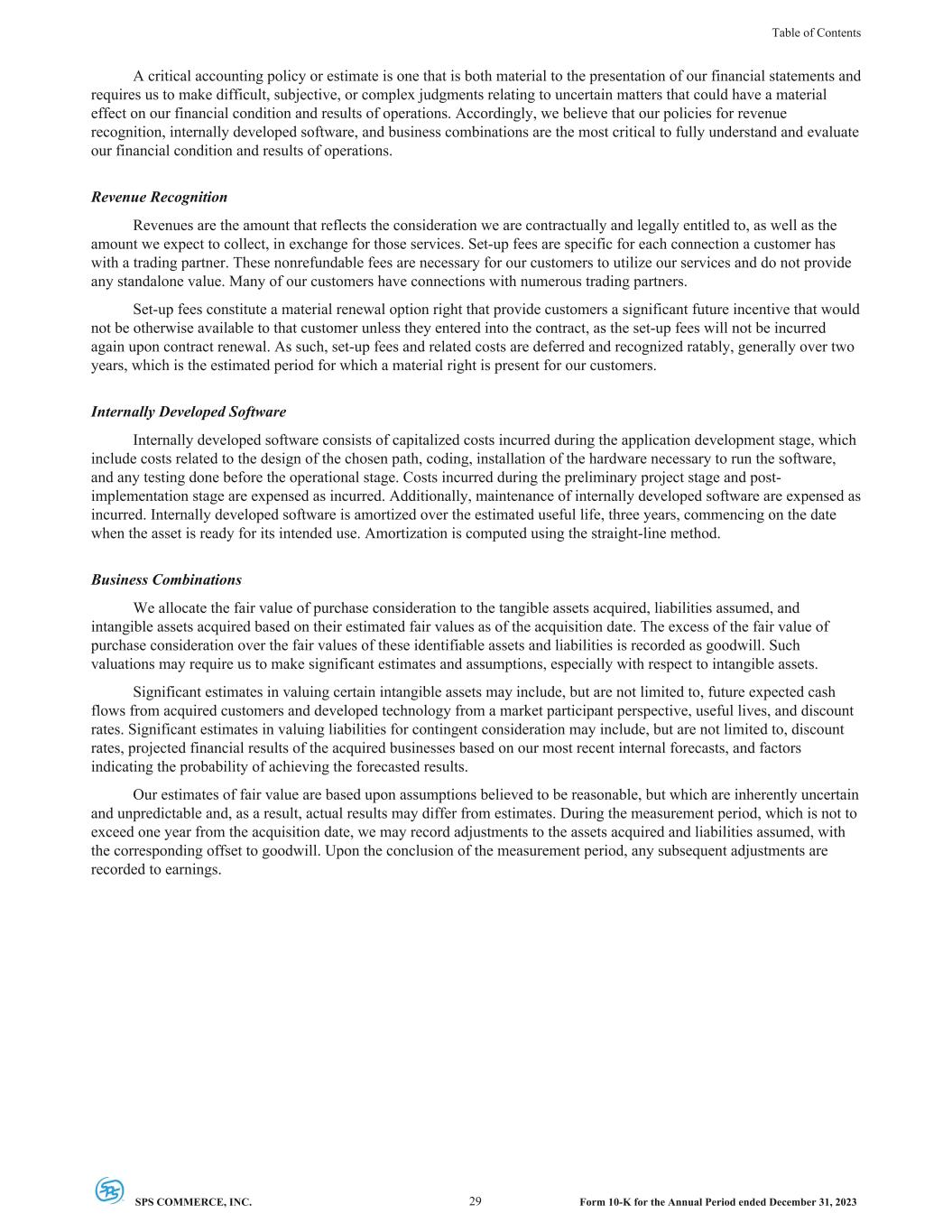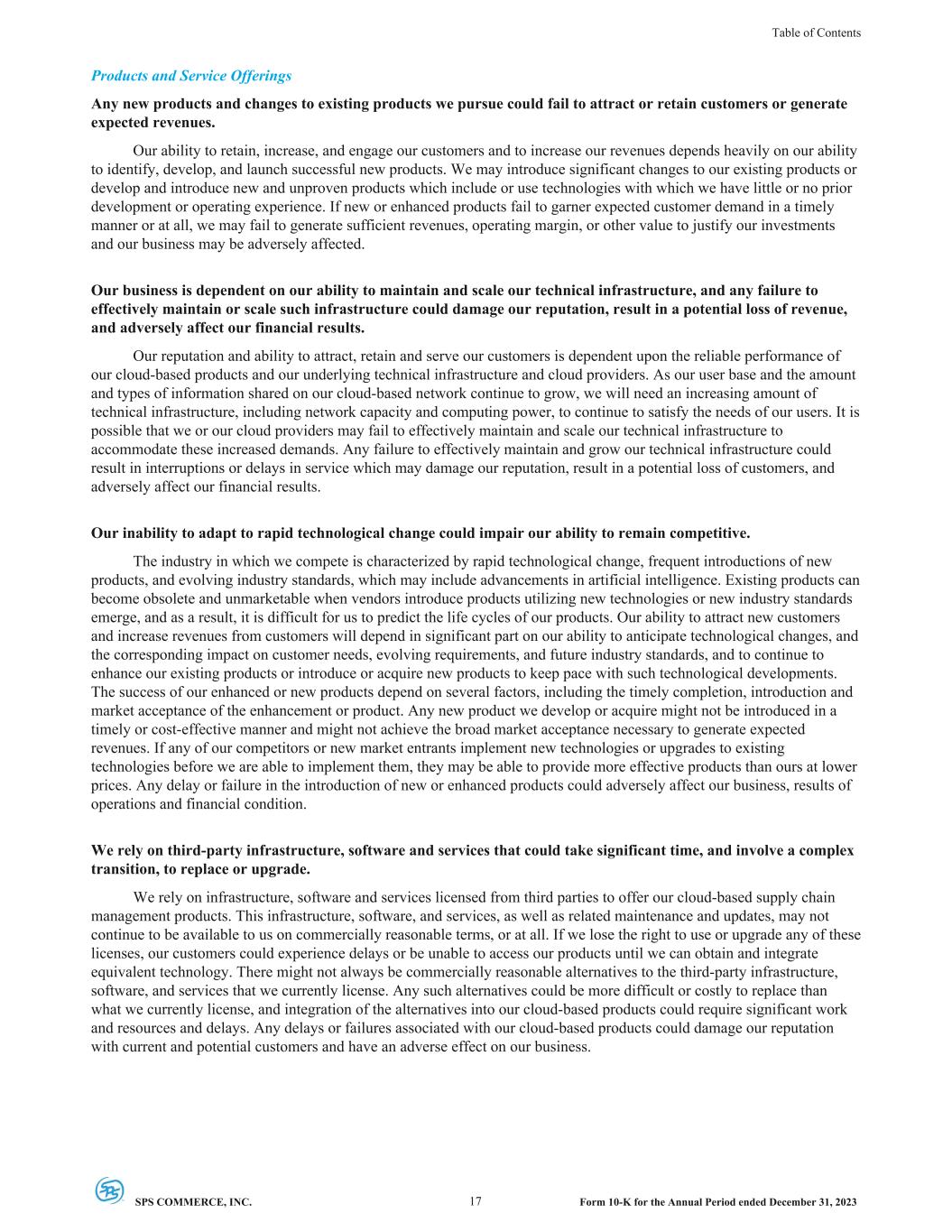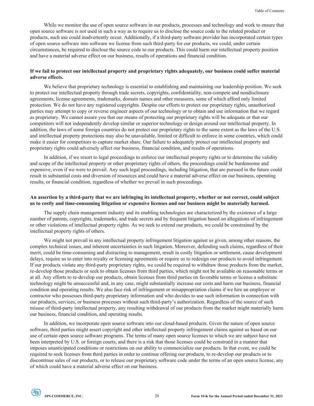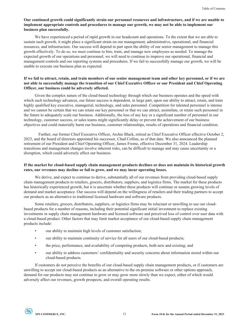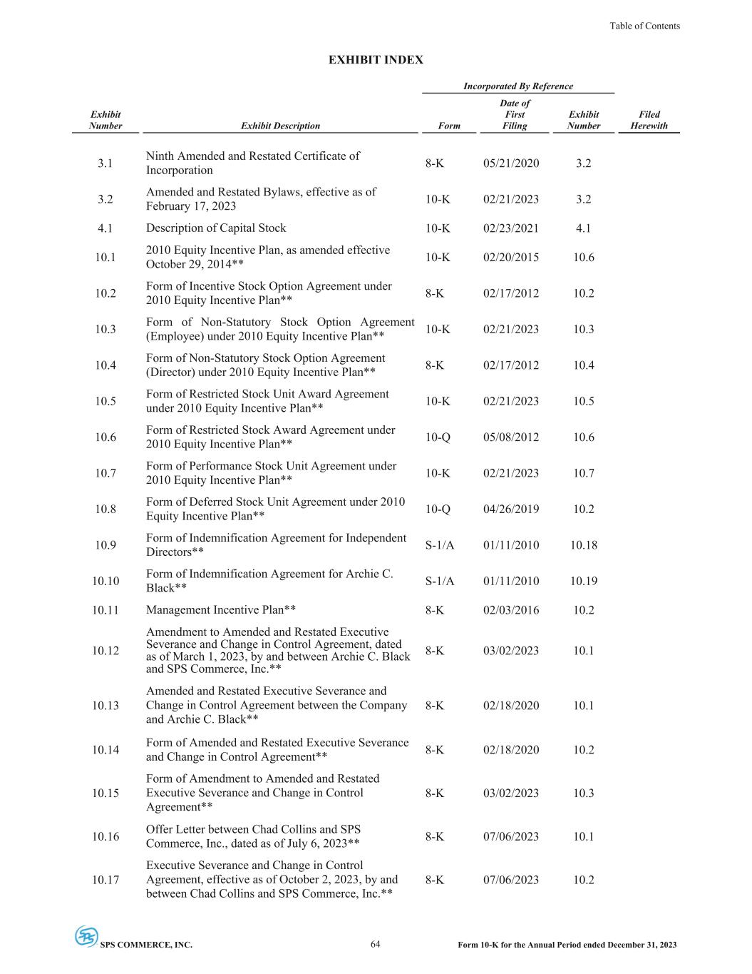 T O O U R S T O C K H O L D E R S In 2023, I joined SPS Commerce knowing the company plays a pivotal role in supply chain automation as retailers and suppliers transition to omnichannel retail. With a full quarter behind me, I can say with conviction that the network SPS has built over the years uniquely positions us to optimize our customers’ supply chain operations. This is demonstrated through our success to date, and I am highly confident our differentiated go-to-market approach will provide an ongoing opportunity for growth. By simplifying the exchange of supply chain data, SPS has become the world’s retail network. By harnessing that data, we can help our customers make their trading partner relationships more collaborative and profitable. As we explore new use cases and adjacencies to leverage the data, we continue to create a strong market position and an undeniable value proposition for trading partners everywhere. Looking back at 2023, the company’s strong performance underscored our ability to execute as macro and retail dynamics continue to evolve. The fourth quarter of 2023 represented our 92nd consecutive quarter of revenue growth and a strong finish to an exciting year. For the full year 2023, revenue grew 19% to $536.9 million. Recurring revenue grew 20% year-over-year led by Fulfillment growth of 20%. Adjusted EBITDA1 grew 19% year-over-year to $157.6 million, resulting in adjusted EBITDA margin1 of 29%. The total number of recurring revenue customers increased 6% year-over-year to approximately 44,800, and wallet share, or average revenue per recurring revenue customer, increased 10% year-over-year to approximately $11,550. Throughout the year we demonstrated ongoing success in expanding our network, helping retailers and suppliers with supply chain automation, and enabling their international expansion. ERP integration is another key component to solving supply chain challenges, and our continued focus on the channel and the strategic partnerships we established over the years play a pivotal role in growing our network. SPS’ ability to deliver world-class solutions includes targeted acquisitions that integrate best in class technology with the SPS platform. In 2023, we continued to expand our portfolio with the acquisition of TIE Kinetix to strengthen our e-invoicing capability and extend our European presence. We also acquired The Order Exchange, one of our technology partners in Australia, who enabled suppliers to link their line of business applications through SPS’ network, unlocking connections to trading partners around the world. In addition, we are advancing our environmental, social and governance endeavors. We are proud of our progress to date and remain committed to effect positive change through environmental stewardship, diversity, equity and inclusion, and giving back to the communities in which we live and work. In closing, I would like to acknowledge all SPS employees around the world for their inherent retail expertise, their commitment to consistent execution, and their drive to deliver the best experience to 120,000 SPS Commerce customers around the globe to date. Combined with our technology roadmap which includes initiatives to further simplify access to the network and continued buildout of trading partner connections, SPS is well positioned to capitalize on growth opportunities today and in the long term, as we continue to execute our vision to be the world’s retail network. Sincerely, Chad Collins CEO 1 Adjusted EBITDA and Adjusted EBITDA Margin are non-GAAP financial measures. We believe that these non-GAAP financial measures provide useful information to our management, board of directors, and investors regarding certain financial and business trends relating to our financial condition and results of operations. Our management uses these non-GAAP financial measures to compare our performance to that of prior periods for trend analyses and planning purposes. Adjusted EBITDA is also used for purposes of determining executive and senior management incentive compensation. These non-GAAP financial measures should not be considered a substitute for, or superior to, financial measures calculated in accordance with GAAP. These non-GAAP financial measures exclude significant expenses and income that are required by GAAP to be recorded in our consolidated financial statements and are subject to inherent limitations. A reconciliation of these non-GAAP measures can be found within the ‘Results of Operations’ section of Part II, Item 7, Management’s Discussion and Analysis of Financial Condition and Results of Operations, within the attached Form 10-K.
