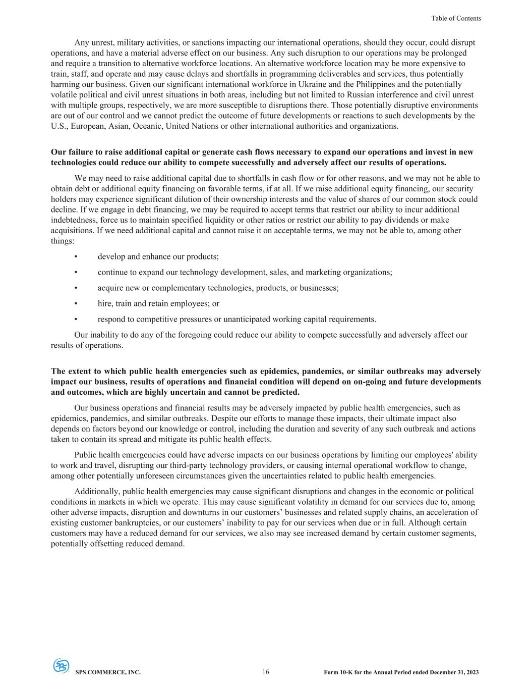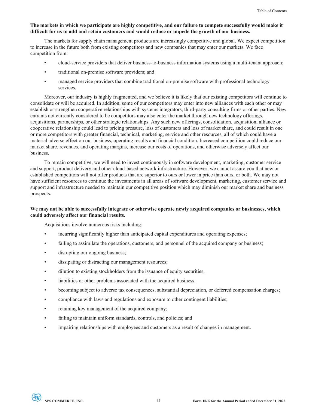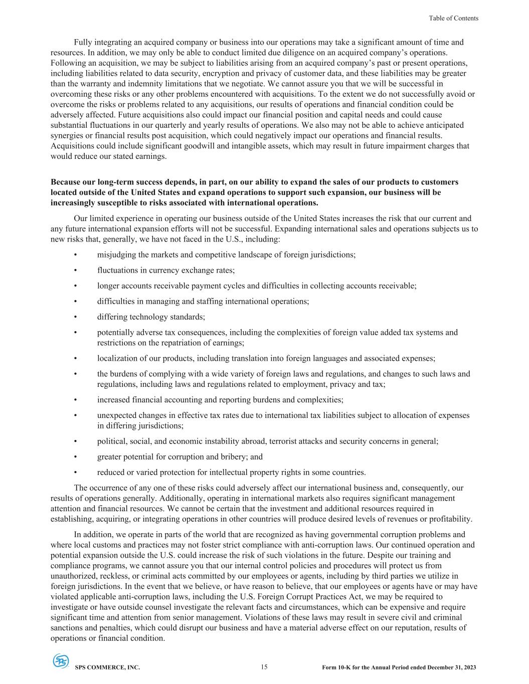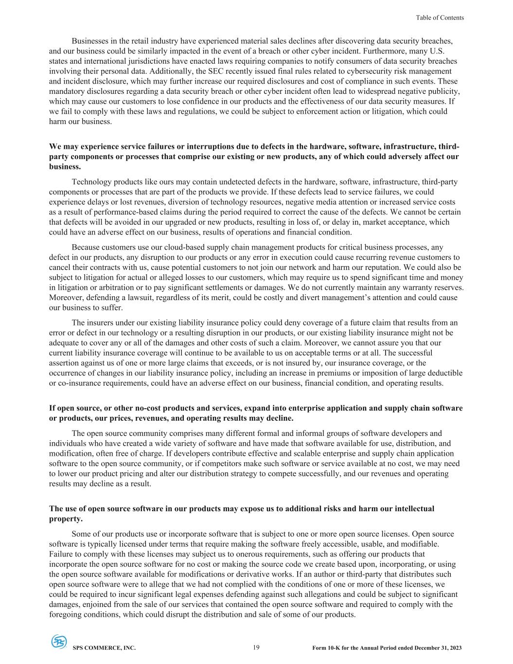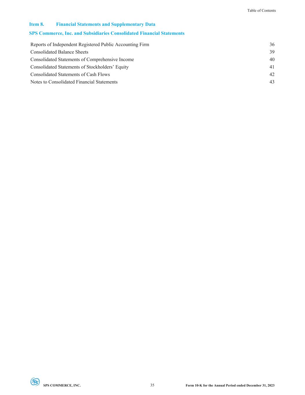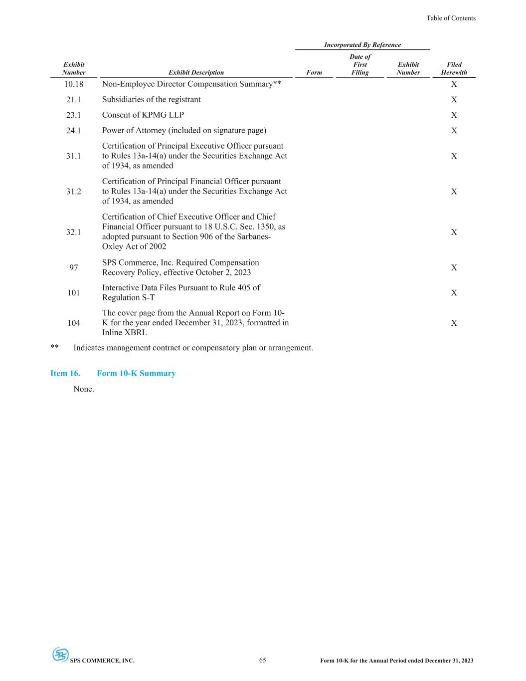T O O U R S T O C K H O L D E R S In 2023, I joined SPS Commerce knowing the company plays a pivotal role in supply chain automation as retailers and suppliers transition to omnichannel retail. With a full quarter behind me, I can say with conviction that the network SPS has built over the years uniquely positions us to optimize our customers’ supply chain operations. This is demonstrated through our success to date, and I am highly confident our differentiated go-to-market approach will provide an ongoing opportunity for growth. By simplifying the exchange of supply chain data, SPS has become the world’s retail network. By harnessing that data, we can help our customers make their trading partner relationships more collaborative and profitable. As we explore new use cases and adjacencies to leverage the data, we continue to create a strong market position and an undeniable value proposition for trading partners everywhere. Looking back at 2023, the company’s strong performance underscored our ability to execute as macro and retail dynamics continue to evolve. The fourth quarter of 2023 represented our 92nd consecutive quarter of revenue growth and a strong finish to an exciting year. For the full year 2023, revenue grew 19% to $536.9 million. Recurring revenue grew 20% year-over-year led by Fulfillment growth of 20%. Adjusted EBITDA1 grew 19% year-over-year to $157.6 million, resulting in adjusted EBITDA margin1 of 29%. The total number of recurring revenue customers increased 6% year-over-year to approximately 44,800, and wallet share, or average revenue per recurring revenue customer, increased 10% year-over-year to approximately $11,550. Throughout the year we demonstrated ongoing success in expanding our network, helping retailers and suppliers with supply chain automation, and enabling their international expansion. ERP integration is another key component to solving supply chain challenges, and our continued focus on the channel and the strategic partnerships we established over the years play a pivotal role in growing our network. SPS’ ability to deliver world-class solutions includes targeted acquisitions that integrate best in class technology with the SPS platform. In 2023, we continued to expand our portfolio with the acquisition of TIE Kinetix to strengthen our e-invoicing capability and extend our European presence. We also acquired The Order Exchange, one of our technology partners in Australia, who enabled suppliers to link their line of business applications through SPS’ network, unlocking connections to trading partners around the world. In addition, we are advancing our environmental, social and governance endeavors. We are proud of our progress to date and remain committed to effect positive change through environmental stewardship, diversity, equity and inclusion, and giving back to the communities in which we live and work. In closing, I would like to acknowledge all SPS employees around the world for their inherent retail expertise, their commitment to consistent execution, and their drive to deliver the best experience to 120,000 SPS Commerce customers around the globe to date. Combined with our technology roadmap which includes initiatives to further simplify access to the network and continued buildout of trading partner connections, SPS is well positioned to capitalize on growth opportunities today and in the long term, as we continue to execute our vision to be the world’s retail network. Sincerely, Chad Collins CEO 1 Adjusted EBITDA and Adjusted EBITDA Margin are non-GAAP financial measures. We believe that these non-GAAP financial measures provide useful information to our management, board of directors, and investors regarding certain financial and business trends relating to our financial condition and results of operations. Our management uses these non-GAAP financial measures to compare our performance to that of prior periods for trend analyses and planning purposes. Adjusted EBITDA is also used for purposes of determining executive and senior management incentive compensation. These non-GAAP financial measures should not be considered a substitute for, or superior to, financial measures calculated in accordance with GAAP. These non-GAAP financial measures exclude significant expenses and income that are required by GAAP to be recorded in our consolidated financial statements and are subject to inherent limitations. A reconciliation of these non-GAAP measures can be found within the ‘Results of Operations’ section of Part II, Item 7, Management’s Discussion and Analysis of Financial Condition and Results of Operations, within the attached Form 10-K.