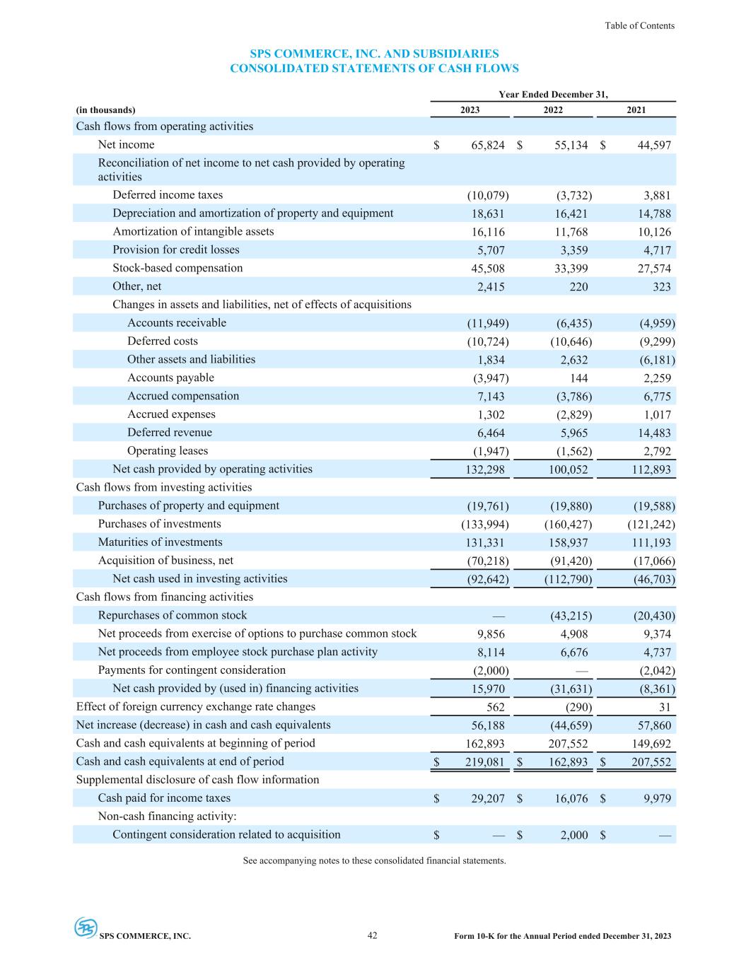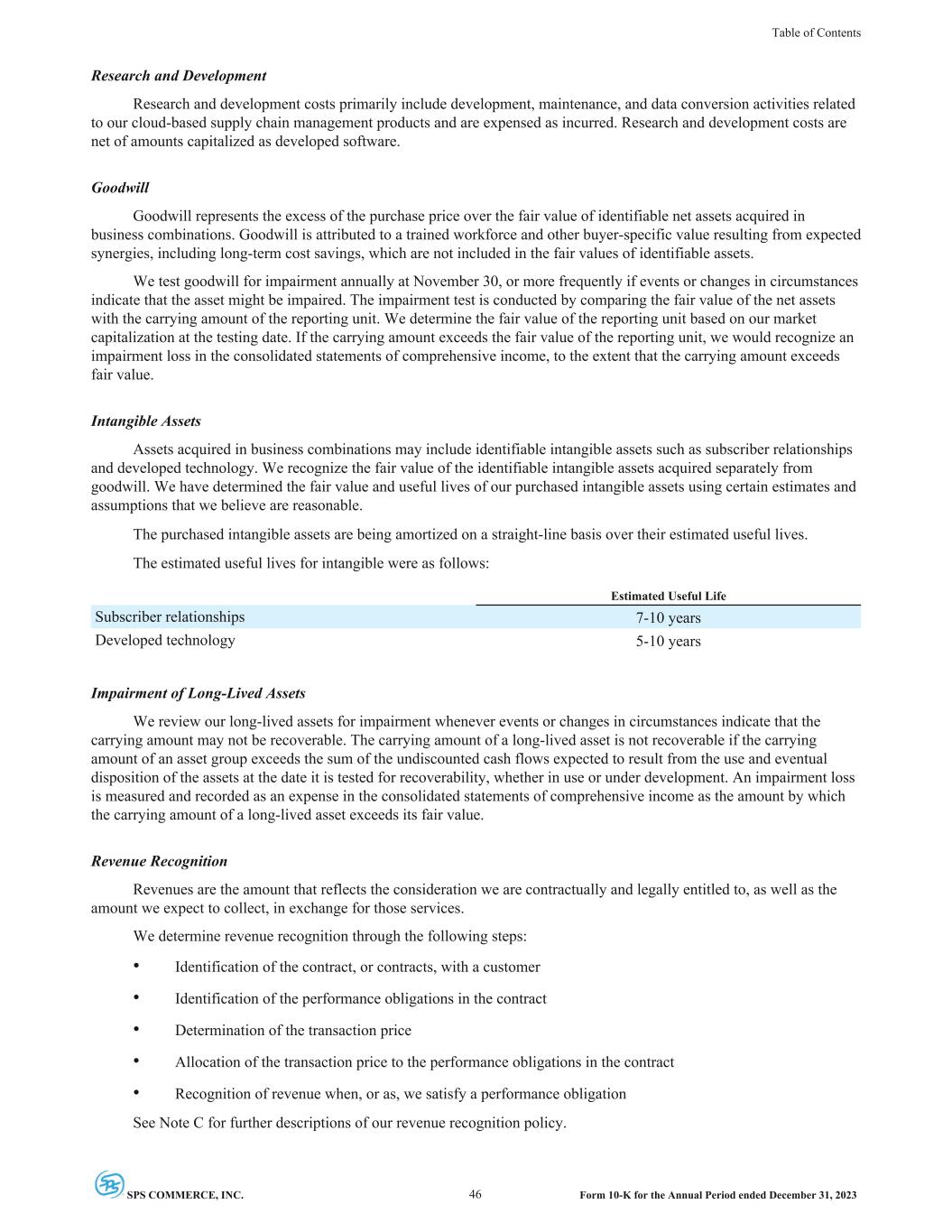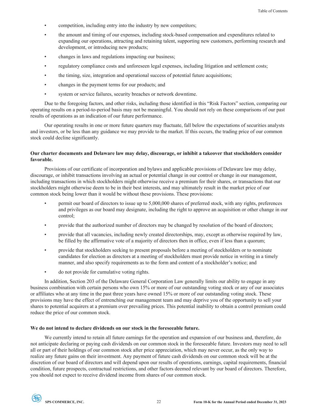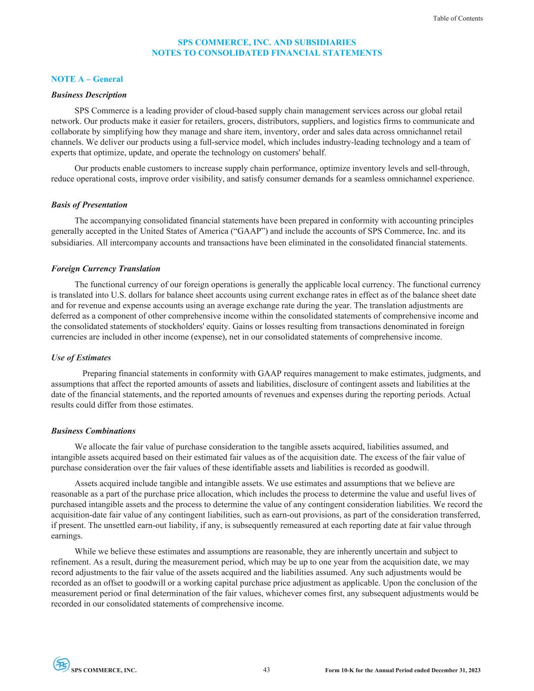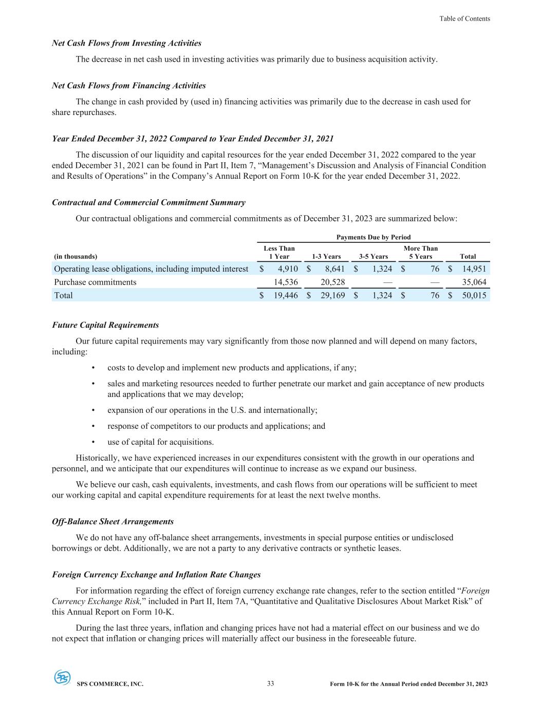 T O O U R S T O C K H O L D E R S In 2023, I joined SPS Commerce knowing the company plays a pivotal role in supply chain automation as retailers and suppliers transition to omnichannel retail. With a full quarter behind me, I can say with conviction that the network SPS has built over the years uniquely positions us to optimize our customers’ supply chain operations. This is demonstrated through our success to date, and I am highly confident our differentiated go-to-market approach will provide an ongoing opportunity for growth. By simplifying the exchange of supply chain data, SPS has become the world’s retail network. By harnessing that data, we can help our customers make their trading partner relationships more collaborative and profitable. As we explore new use cases and adjacencies to leverage the data, we continue to create a strong market position and an undeniable value proposition for trading partners everywhere. Looking back at 2023, the company’s strong performance underscored our ability to execute as macro and retail dynamics continue to evolve. The fourth quarter of 2023 represented our 92nd consecutive quarter of revenue growth and a strong finish to an exciting year. For the full year 2023, revenue grew 19% to $536.9 million. Recurring revenue grew 20% year-over-year led by Fulfillment growth of 20%. Adjusted EBITDA1 grew 19% year-over-year to $157.6 million, resulting in adjusted EBITDA margin1 of 29%. The total number of recurring revenue customers increased 6% year-over-year to approximately 44,800, and wallet share, or average revenue per recurring revenue customer, increased 10% year-over-year to approximately $11,550. Throughout the year we demonstrated ongoing success in expanding our network, helping retailers and suppliers with supply chain automation, and enabling their international expansion. ERP integration is another key component to solving supply chain challenges, and our continued focus on the channel and the strategic partnerships we established over the years play a pivotal role in growing our network. SPS’ ability to deliver world-class solutions includes targeted acquisitions that integrate best in class technology with the SPS platform. In 2023, we continued to expand our portfolio with the acquisition of TIE Kinetix to strengthen our e-invoicing capability and extend our European presence. We also acquired The Order Exchange, one of our technology partners in Australia, who enabled suppliers to link their line of business applications through SPS’ network, unlocking connections to trading partners around the world. In addition, we are advancing our environmental, social and governance endeavors. We are proud of our progress to date and remain committed to effect positive change through environmental stewardship, diversity, equity and inclusion, and giving back to the communities in which we live and work. In closing, I would like to acknowledge all SPS employees around the world for their inherent retail expertise, their commitment to consistent execution, and their drive to deliver the best experience to 120,000 SPS Commerce customers around the globe to date. Combined with our technology roadmap which includes initiatives to further simplify access to the network and continued buildout of trading partner connections, SPS is well positioned to capitalize on growth opportunities today and in the long term, as we continue to execute our vision to be the world’s retail network. Sincerely, Chad Collins CEO 1 Adjusted EBITDA and Adjusted EBITDA Margin are non-GAAP financial measures. We believe that these non-GAAP financial measures provide useful information to our management, board of directors, and investors regarding certain financial and business trends relating to our financial condition and results of operations. Our management uses these non-GAAP financial measures to compare our performance to that of prior periods for trend analyses and planning purposes. Adjusted EBITDA is also used for purposes of determining executive and senior management incentive compensation. These non-GAAP financial measures should not be considered a substitute for, or superior to, financial measures calculated in accordance with GAAP. These non-GAAP financial measures exclude significant expenses and income that are required by GAAP to be recorded in our consolidated financial statements and are subject to inherent limitations. A reconciliation of these non-GAAP measures can be found within the ‘Results of Operations’ section of Part II, Item 7, Management’s Discussion and Analysis of Financial Condition and Results of Operations, within the attached Form 10-K.