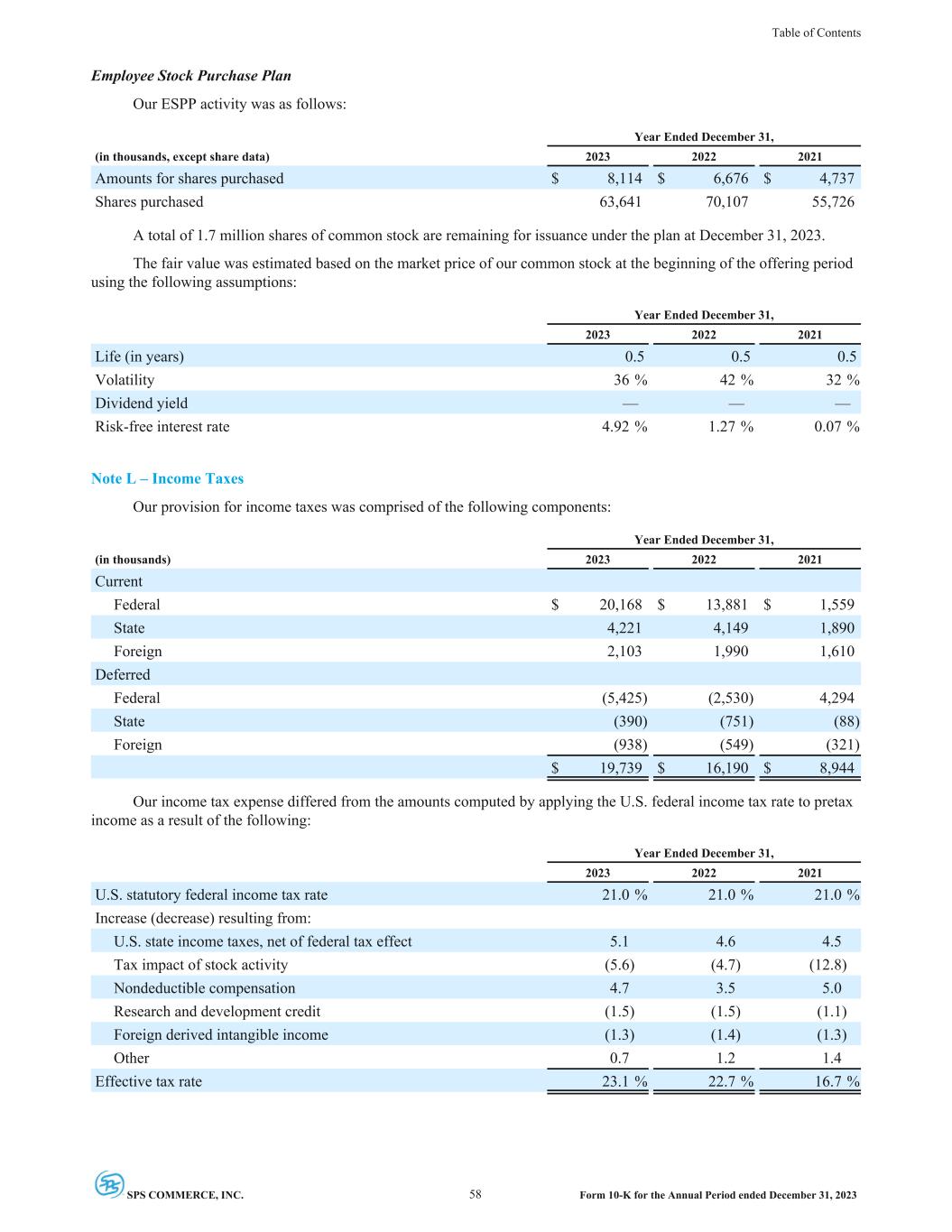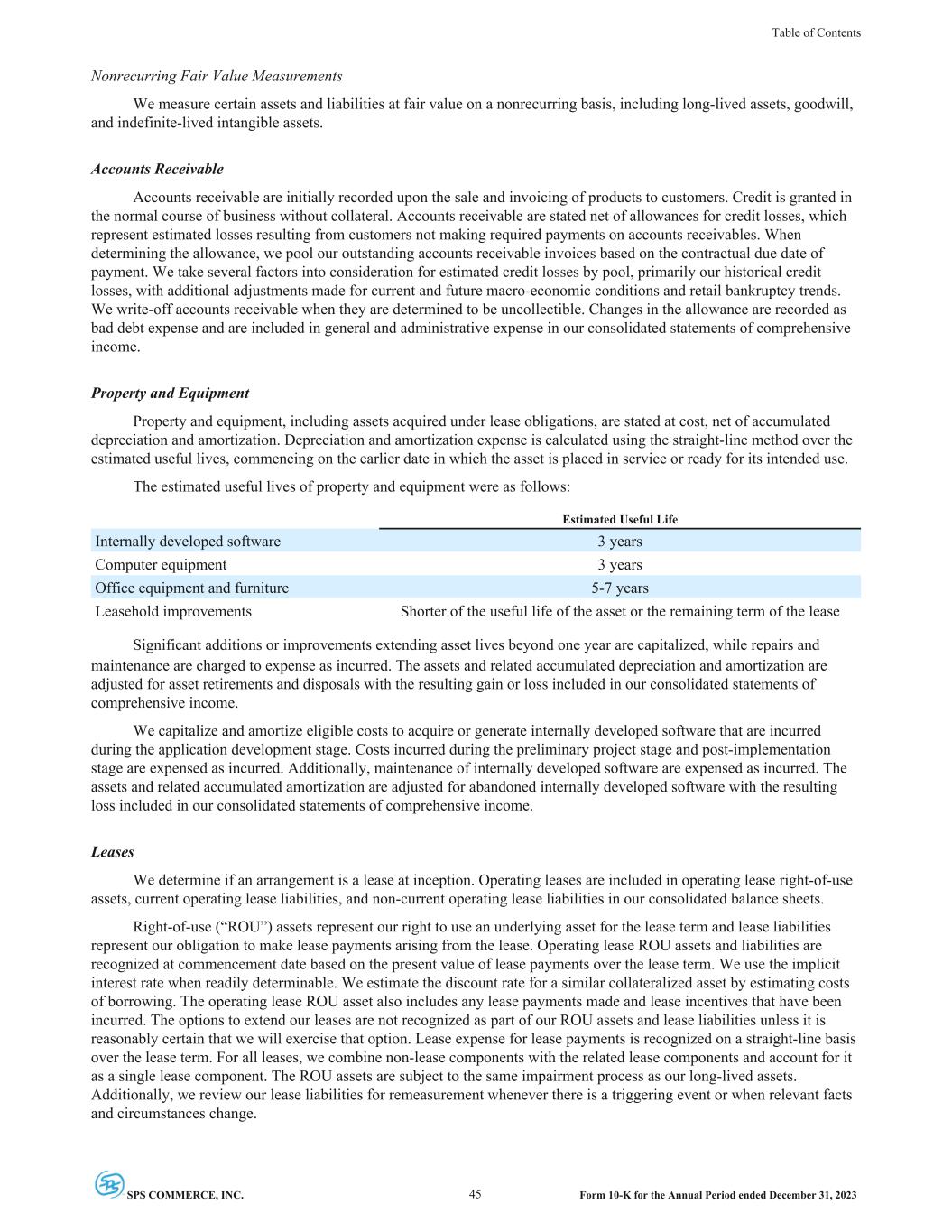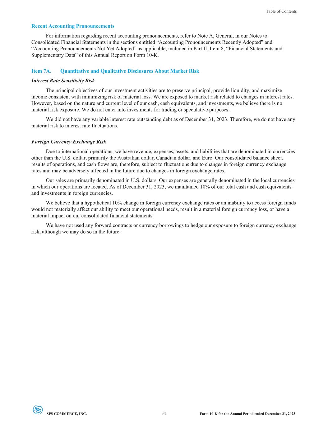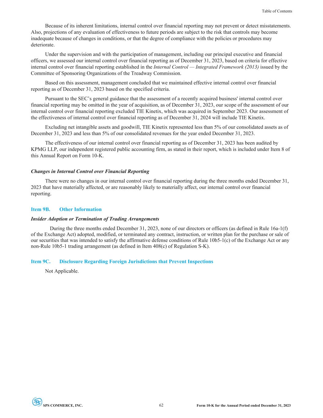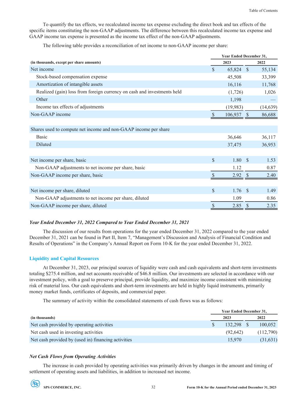 T O O U R S T O C K H O L D E R S In 2023, I joined SPS Commerce knowing the company plays a pivotal role in supply chain automation as retailers and suppliers transition to omnichannel retail. With a full quarter behind me, I can say with conviction that the network SPS has built over the years uniquely positions us to optimize our customers’ supply chain operations. This is demonstrated through our success to date, and I am highly confident our differentiated go-to-market approach will provide an ongoing opportunity for growth. By simplifying the exchange of supply chain data, SPS has become the world’s retail network. By harnessing that data, we can help our customers make their trading partner relationships more collaborative and profitable. As we explore new use cases and adjacencies to leverage the data, we continue to create a strong market position and an undeniable value proposition for trading partners everywhere. Looking back at 2023, the company’s strong performance underscored our ability to execute as macro and retail dynamics continue to evolve. The fourth quarter of 2023 represented our 92nd consecutive quarter of revenue growth and a strong finish to an exciting year. For the full year 2023, revenue grew 19% to $536.9 million. Recurring revenue grew 20% year-over-year led by Fulfillment growth of 20%. Adjusted EBITDA1 grew 19% year-over-year to $157.6 million, resulting in adjusted EBITDA margin1 of 29%. The total number of recurring revenue customers increased 6% year-over-year to approximately 44,800, and wallet share, or average revenue per recurring revenue customer, increased 10% year-over-year to approximately $11,550. Throughout the year we demonstrated ongoing success in expanding our network, helping retailers and suppliers with supply chain automation, and enabling their international expansion. ERP integration is another key component to solving supply chain challenges, and our continued focus on the channel and the strategic partnerships we established over the years play a pivotal role in growing our network. SPS’ ability to deliver world-class solutions includes targeted acquisitions that integrate best in class technology with the SPS platform. In 2023, we continued to expand our portfolio with the acquisition of TIE Kinetix to strengthen our e-invoicing capability and extend our European presence. We also acquired The Order Exchange, one of our technology partners in Australia, who enabled suppliers to link their line of business applications through SPS’ network, unlocking connections to trading partners around the world. In addition, we are advancing our environmental, social and governance endeavors. We are proud of our progress to date and remain committed to effect positive change through environmental stewardship, diversity, equity and inclusion, and giving back to the communities in which we live and work. In closing, I would like to acknowledge all SPS employees around the world for their inherent retail expertise, their commitment to consistent execution, and their drive to deliver the best experience to 120,000 SPS Commerce customers around the globe to date. Combined with our technology roadmap which includes initiatives to further simplify access to the network and continued buildout of trading partner connections, SPS is well positioned to capitalize on growth opportunities today and in the long term, as we continue to execute our vision to be the world’s retail network. Sincerely, Chad Collins CEO 1 Adjusted EBITDA and Adjusted EBITDA Margin are non-GAAP financial measures. We believe that these non-GAAP financial measures provide useful information to our management, board of directors, and investors regarding certain financial and business trends relating to our financial condition and results of operations. Our management uses these non-GAAP financial measures to compare our performance to that of prior periods for trend analyses and planning purposes. Adjusted EBITDA is also used for purposes of determining executive and senior management incentive compensation. These non-GAAP financial measures should not be considered a substitute for, or superior to, financial measures calculated in accordance with GAAP. These non-GAAP financial measures exclude significant expenses and income that are required by GAAP to be recorded in our consolidated financial statements and are subject to inherent limitations. A reconciliation of these non-GAAP measures can be found within the ‘Results of Operations’ section of Part II, Item 7, Management’s Discussion and Analysis of Financial Condition and Results of Operations, within the attached Form 10-K.