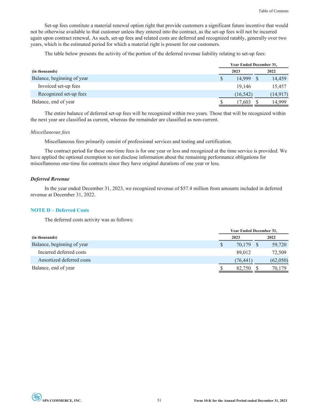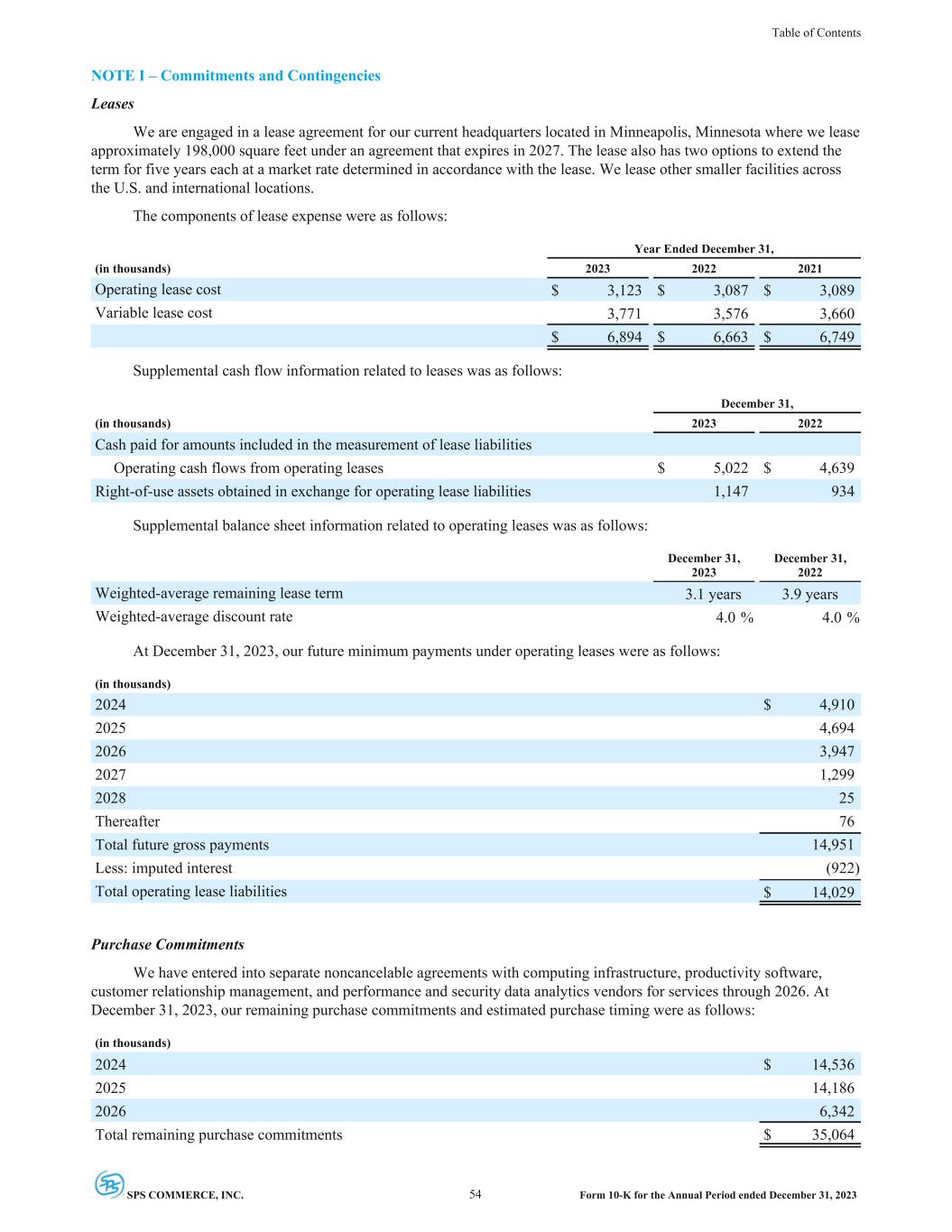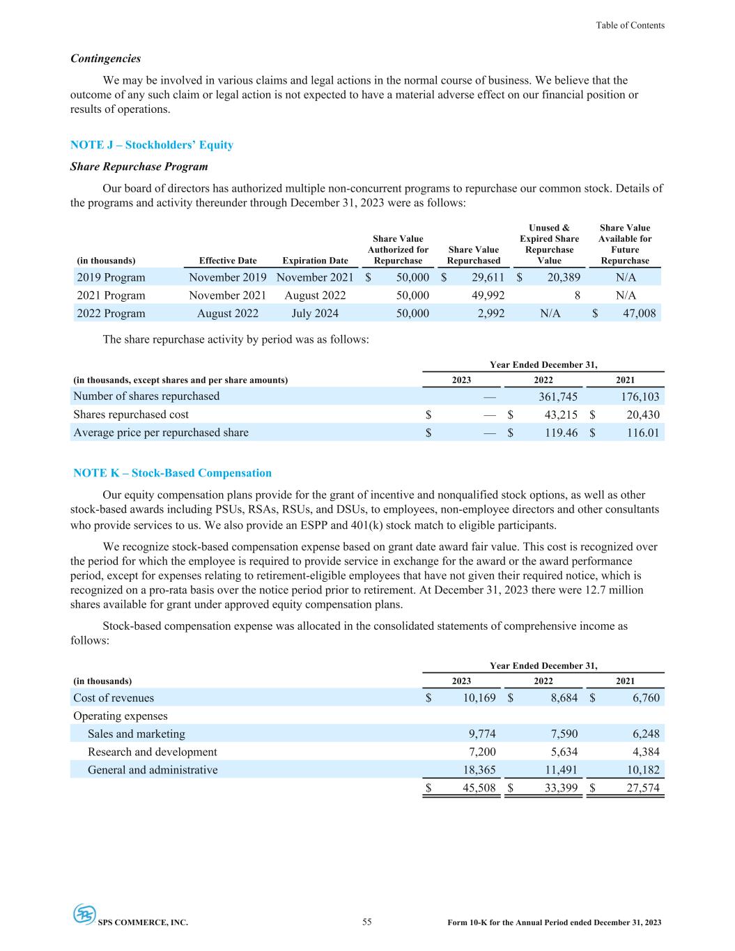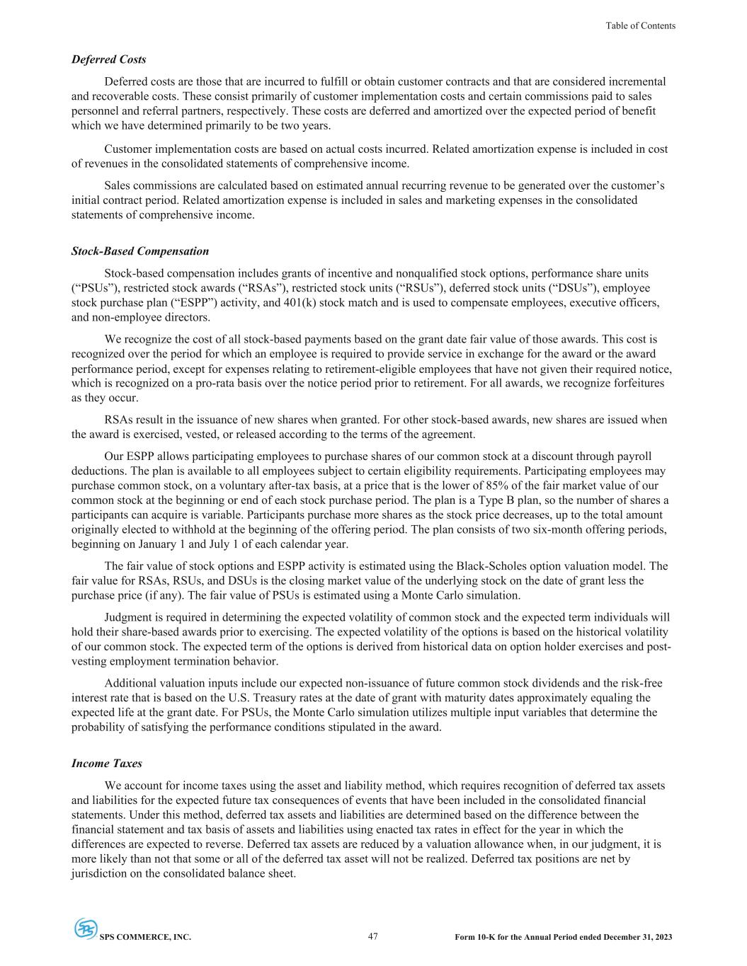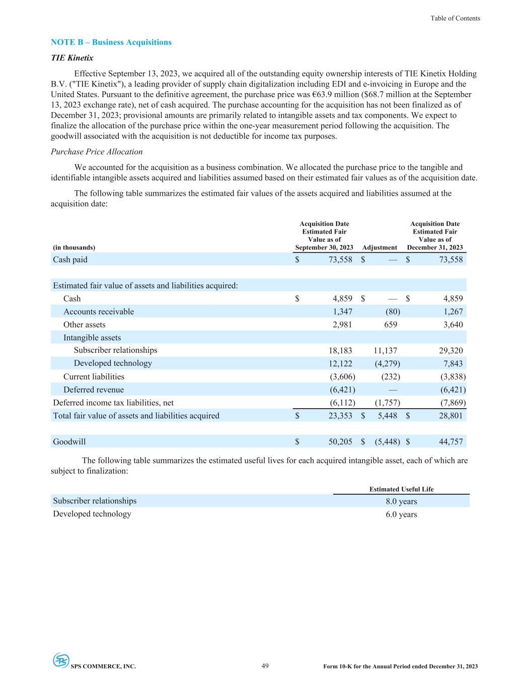 T O O U R S T O C K H O L D E R S In 2023, I joined SPS Commerce knowing the company plays a pivotal role in supply chain automation as retailers and suppliers transition to omnichannel retail. With a full quarter behind me, I can say with conviction that the network SPS has built over the years uniquely positions us to optimize our customers’ supply chain operations. This is demonstrated through our success to date, and I am highly confident our differentiated go-to-market approach will provide an ongoing opportunity for growth. By simplifying the exchange of supply chain data, SPS has become the world’s retail network. By harnessing that data, we can help our customers make their trading partner relationships more collaborative and profitable. As we explore new use cases and adjacencies to leverage the data, we continue to create a strong market position and an undeniable value proposition for trading partners everywhere. Looking back at 2023, the company’s strong performance underscored our ability to execute as macro and retail dynamics continue to evolve. The fourth quarter of 2023 represented our 92nd consecutive quarter of revenue growth and a strong finish to an exciting year. For the full year 2023, revenue grew 19% to $536.9 million. Recurring revenue grew 20% year-over-year led by Fulfillment growth of 20%. Adjusted EBITDA1 grew 19% year-over-year to $157.6 million, resulting in adjusted EBITDA margin1 of 29%. The total number of recurring revenue customers increased 6% year-over-year to approximately 44,800, and wallet share, or average revenue per recurring revenue customer, increased 10% year-over-year to approximately $11,550. Throughout the year we demonstrated ongoing success in expanding our network, helping retailers and suppliers with supply chain automation, and enabling their international expansion. ERP integration is another key component to solving supply chain challenges, and our continued focus on the channel and the strategic partnerships we established over the years play a pivotal role in growing our network. SPS’ ability to deliver world-class solutions includes targeted acquisitions that integrate best in class technology with the SPS platform. In 2023, we continued to expand our portfolio with the acquisition of TIE Kinetix to strengthen our e-invoicing capability and extend our European presence. We also acquired The Order Exchange, one of our technology partners in Australia, who enabled suppliers to link their line of business applications through SPS’ network, unlocking connections to trading partners around the world. In addition, we are advancing our environmental, social and governance endeavors. We are proud of our progress to date and remain committed to effect positive change through environmental stewardship, diversity, equity and inclusion, and giving back to the communities in which we live and work. In closing, I would like to acknowledge all SPS employees around the world for their inherent retail expertise, their commitment to consistent execution, and their drive to deliver the best experience to 120,000 SPS Commerce customers around the globe to date. Combined with our technology roadmap which includes initiatives to further simplify access to the network and continued buildout of trading partner connections, SPS is well positioned to capitalize on growth opportunities today and in the long term, as we continue to execute our vision to be the world’s retail network. Sincerely, Chad Collins CEO 1 Adjusted EBITDA and Adjusted EBITDA Margin are non-GAAP financial measures. We believe that these non-GAAP financial measures provide useful information to our management, board of directors, and investors regarding certain financial and business trends relating to our financial condition and results of operations. Our management uses these non-GAAP financial measures to compare our performance to that of prior periods for trend analyses and planning purposes. Adjusted EBITDA is also used for purposes of determining executive and senior management incentive compensation. These non-GAAP financial measures should not be considered a substitute for, or superior to, financial measures calculated in accordance with GAAP. These non-GAAP financial measures exclude significant expenses and income that are required by GAAP to be recorded in our consolidated financial statements and are subject to inherent limitations. A reconciliation of these non-GAAP measures can be found within the ‘Results of Operations’ section of Part II, Item 7, Management’s Discussion and Analysis of Financial Condition and Results of Operations, within the attached Form 10-K.