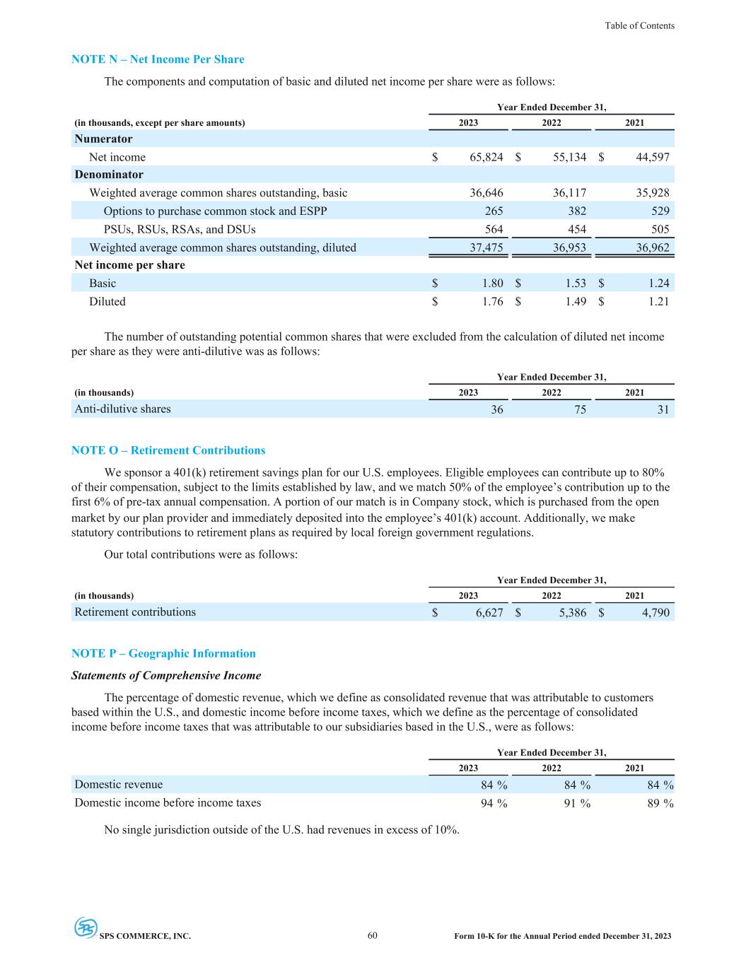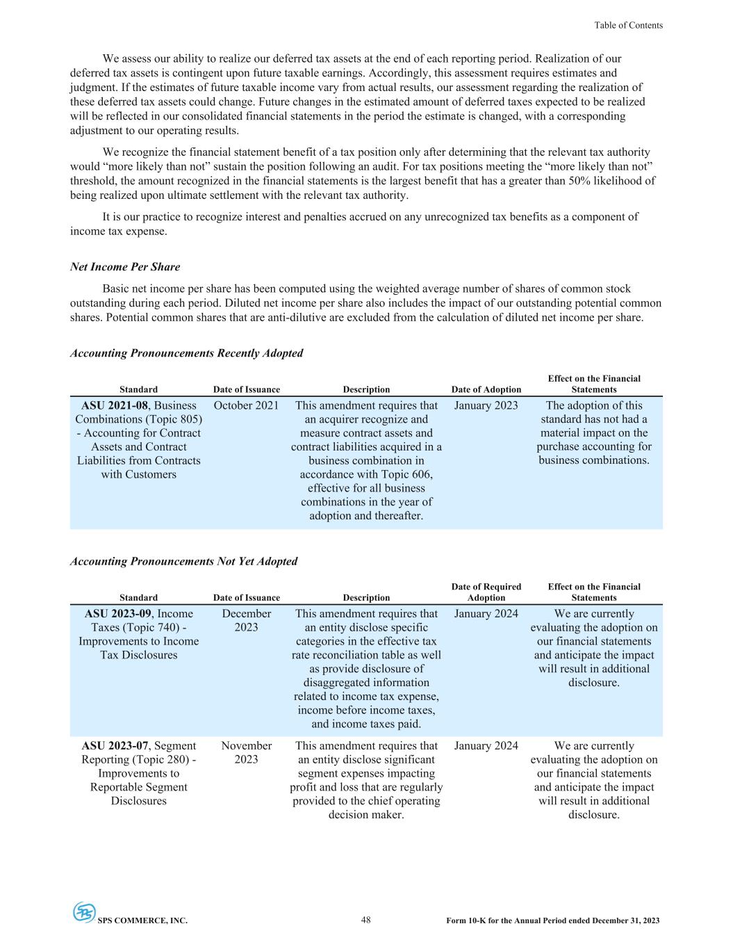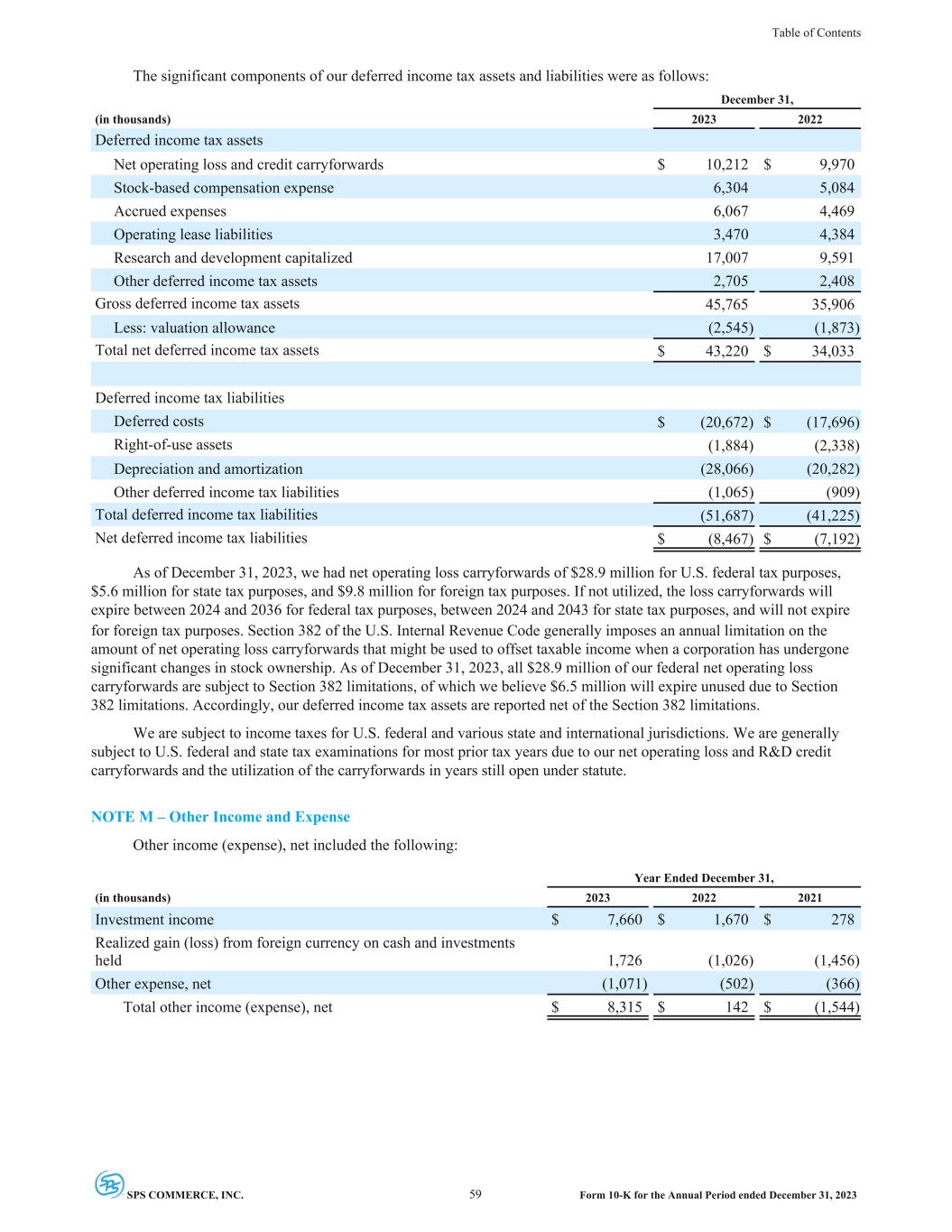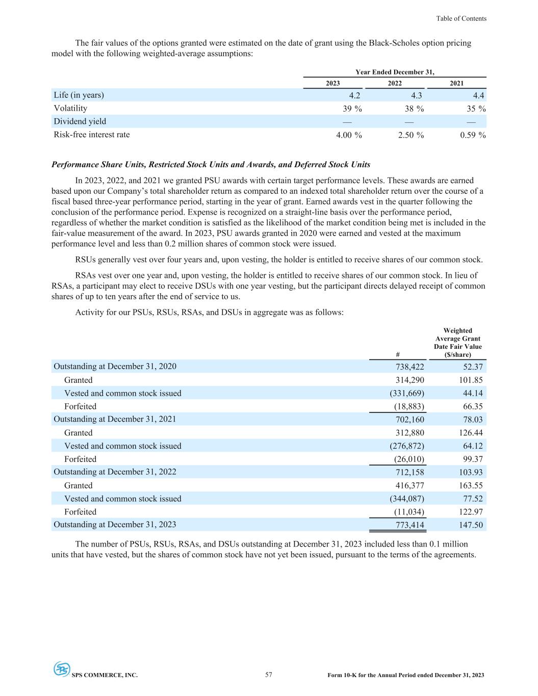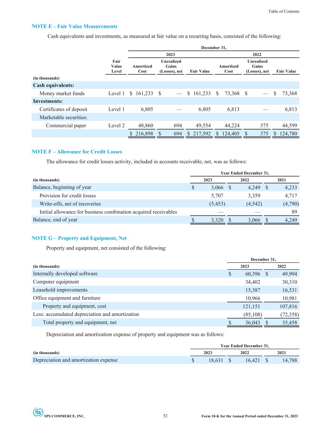 T O O U R S T O C K H O L D E R S In 2023, I joined SPS Commerce knowing the company plays a pivotal role in supply chain automation as retailers and suppliers transition to omnichannel retail. With a full quarter behind me, I can say with conviction that the network SPS has built over the years uniquely positions us to optimize our customers’ supply chain operations. This is demonstrated through our success to date, and I am highly confident our differentiated go-to-market approach will provide an ongoing opportunity for growth. By simplifying the exchange of supply chain data, SPS has become the world’s retail network. By harnessing that data, we can help our customers make their trading partner relationships more collaborative and profitable. As we explore new use cases and adjacencies to leverage the data, we continue to create a strong market position and an undeniable value proposition for trading partners everywhere. Looking back at 2023, the company’s strong performance underscored our ability to execute as macro and retail dynamics continue to evolve. The fourth quarter of 2023 represented our 92nd consecutive quarter of revenue growth and a strong finish to an exciting year. For the full year 2023, revenue grew 19% to $536.9 million. Recurring revenue grew 20% year-over-year led by Fulfillment growth of 20%. Adjusted EBITDA1 grew 19% year-over-year to $157.6 million, resulting in adjusted EBITDA margin1 of 29%. The total number of recurring revenue customers increased 6% year-over-year to approximately 44,800, and wallet share, or average revenue per recurring revenue customer, increased 10% year-over-year to approximately $11,550. Throughout the year we demonstrated ongoing success in expanding our network, helping retailers and suppliers with supply chain automation, and enabling their international expansion. ERP integration is another key component to solving supply chain challenges, and our continued focus on the channel and the strategic partnerships we established over the years play a pivotal role in growing our network. SPS’ ability to deliver world-class solutions includes targeted acquisitions that integrate best in class technology with the SPS platform. In 2023, we continued to expand our portfolio with the acquisition of TIE Kinetix to strengthen our e-invoicing capability and extend our European presence. We also acquired The Order Exchange, one of our technology partners in Australia, who enabled suppliers to link their line of business applications through SPS’ network, unlocking connections to trading partners around the world. In addition, we are advancing our environmental, social and governance endeavors. We are proud of our progress to date and remain committed to effect positive change through environmental stewardship, diversity, equity and inclusion, and giving back to the communities in which we live and work. In closing, I would like to acknowledge all SPS employees around the world for their inherent retail expertise, their commitment to consistent execution, and their drive to deliver the best experience to 120,000 SPS Commerce customers around the globe to date. Combined with our technology roadmap which includes initiatives to further simplify access to the network and continued buildout of trading partner connections, SPS is well positioned to capitalize on growth opportunities today and in the long term, as we continue to execute our vision to be the world’s retail network. Sincerely, Chad Collins CEO 1 Adjusted EBITDA and Adjusted EBITDA Margin are non-GAAP financial measures. We believe that these non-GAAP financial measures provide useful information to our management, board of directors, and investors regarding certain financial and business trends relating to our financial condition and results of operations. Our management uses these non-GAAP financial measures to compare our performance to that of prior periods for trend analyses and planning purposes. Adjusted EBITDA is also used for purposes of determining executive and senior management incentive compensation. These non-GAAP financial measures should not be considered a substitute for, or superior to, financial measures calculated in accordance with GAAP. These non-GAAP financial measures exclude significant expenses and income that are required by GAAP to be recorded in our consolidated financial statements and are subject to inherent limitations. A reconciliation of these non-GAAP measures can be found within the ‘Results of Operations’ section of Part II, Item 7, Management’s Discussion and Analysis of Financial Condition and Results of Operations, within the attached Form 10-K.