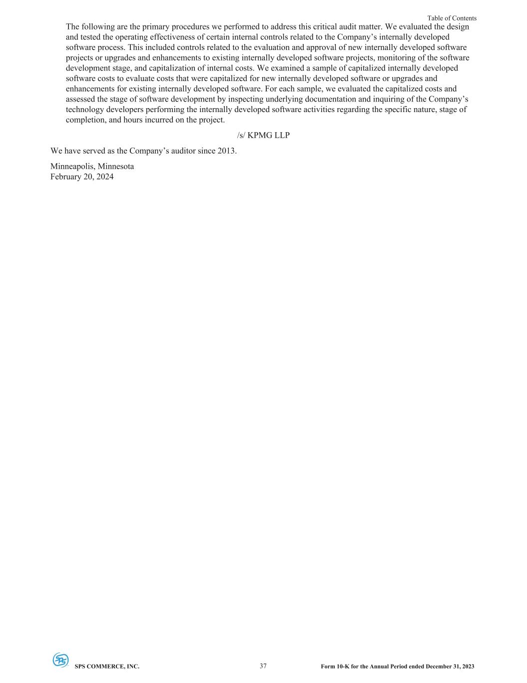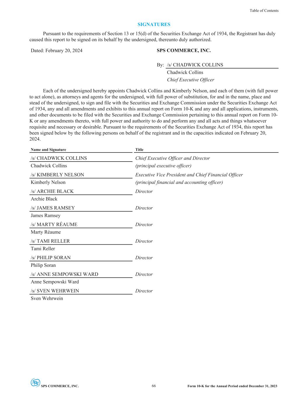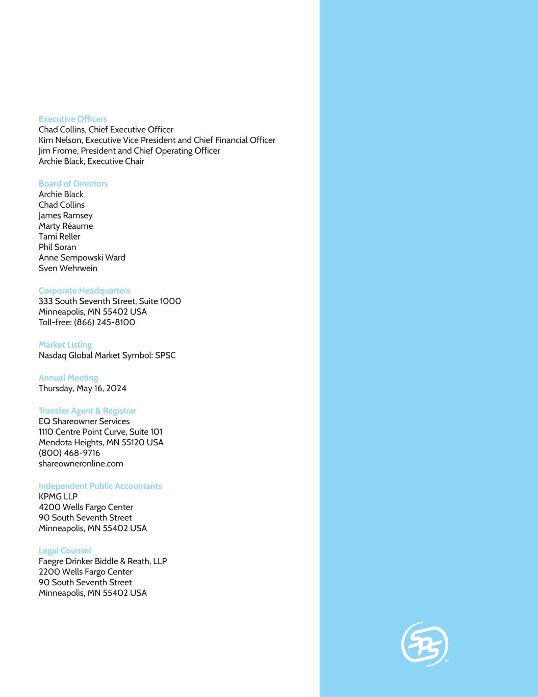 Executive Officers Chad Collins, Chief Executive Officer Kim Nelson, Executive Vice President and Chief Financial Officer Jim Frome, President and Chief Operating Officer Archie Black, Executive Chair Board of Directors Archie Black Chad Collins James Ramsey Marty Réaume Tami Reller Phil Soran Anne Sempowski Ward Sven Wehrwein Corporate Headquarters 333 South Seventh Street, Suite 1000 Minneapolis, MN 55402 USA Toll-free: (866) 245-8100 Market Listing Nasdaq Global Market Symbol: SPSC Annual Meeting Thursday, May 16, 2024 Transfer Agent & Registrar EQ Shareowner Services 1110 Centre Point Curve, Suite 101 Mendota Heights, MN 55120 USA (800) 468-9716 shareowneronline.com Independent Public Accountants KPMG LLP 4200 Wells Fargo Center 90 South Seventh Street Minneapolis, MN 55402 USA Legal Counsel Faegre Drinker Biddle & Reath, LLP 2200 Wells Fargo Center 90 South Seventh Street Minneapolis, MN 55402 USA