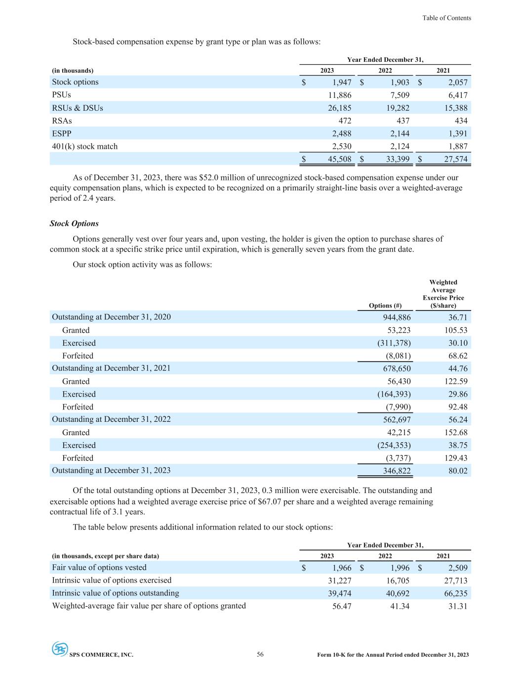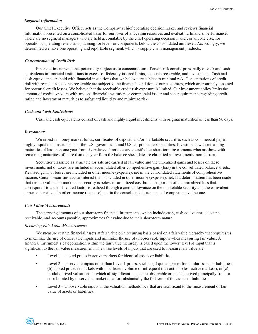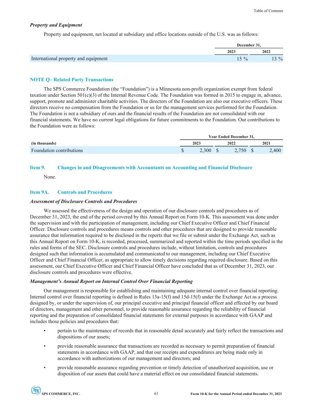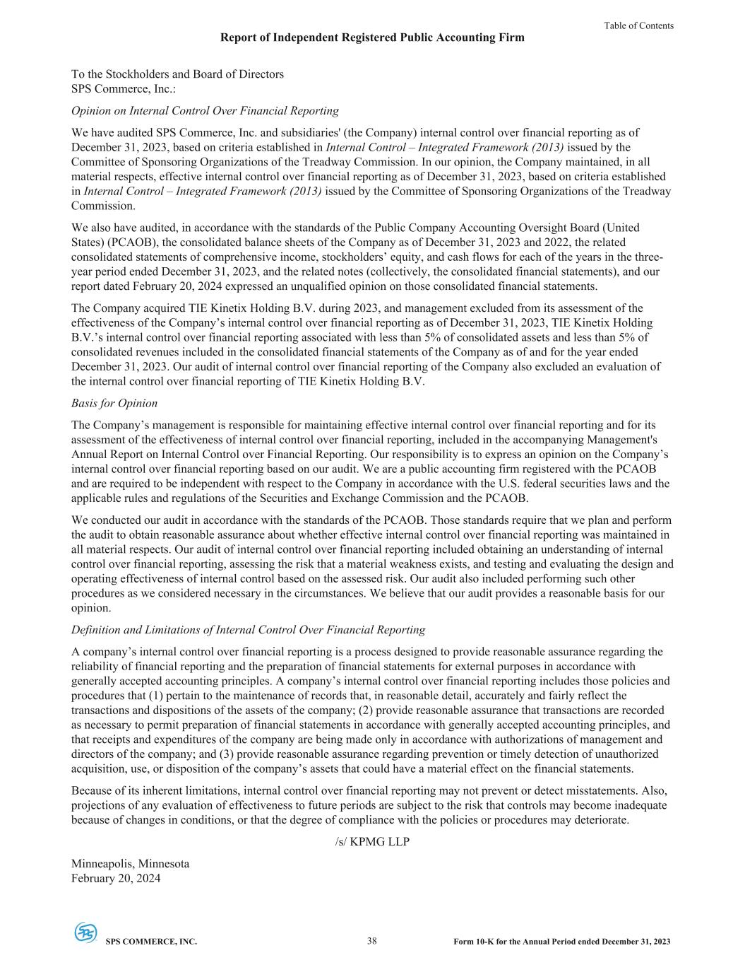Executive Officers Chad Collins, Chief Executive Officer Kim Nelson, Executive Vice President and Chief Financial Officer Jim Frome, President and Chief Operating Officer Archie Black, Executive Chair Board of Directors Archie Black Chad Collins James Ramsey Marty Réaume Tami Reller Phil Soran Anne Sempowski Ward Sven Wehrwein Corporate Headquarters 333 South Seventh Street, Suite 1000 Minneapolis, MN 55402 USA Toll-free: (866) 245-8100 Market Listing Nasdaq Global Market Symbol: SPSC Annual Meeting Thursday, May 16, 2024 Transfer Agent & Registrar EQ Shareowner Services 1110 Centre Point Curve, Suite 101 Mendota Heights, MN 55120 USA (800) 468-9716 shareowneronline.com Independent Public Accountants KPMG LLP 4200 Wells Fargo Center 90 South Seventh Street Minneapolis, MN 55402 USA Legal Counsel Faegre Drinker Biddle & Reath, LLP 2200 Wells Fargo Center 90 South Seventh Street Minneapolis, MN 55402 USA