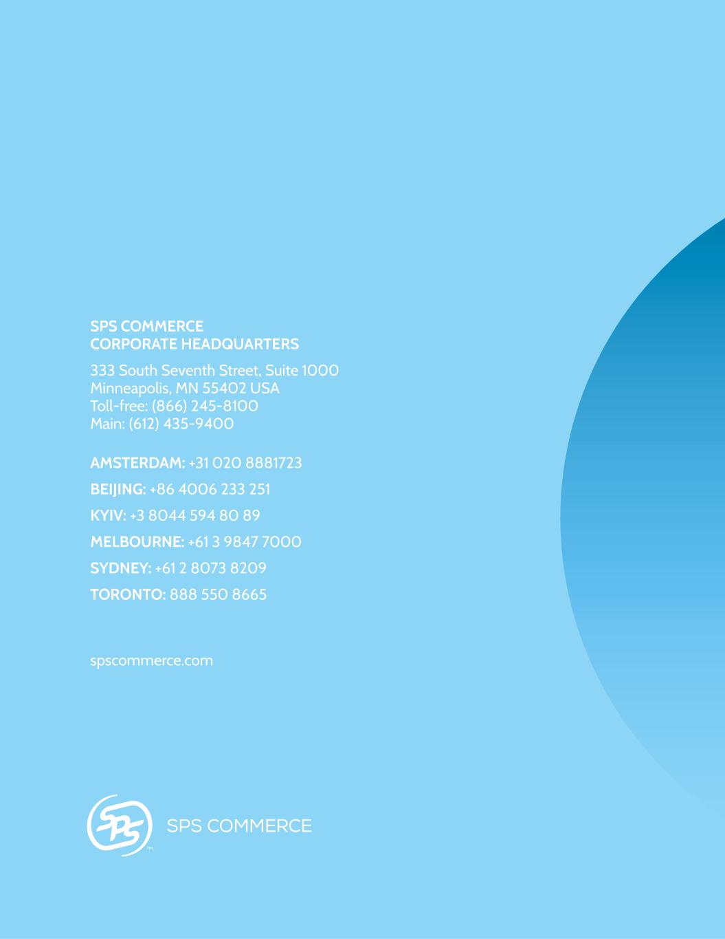 SPS COMMERCE CORPORATE HEADQUARTERS 333 South Seventh Street, Suite 1000 Minneapolis, MN 55402 USA Toll-free: (866) 245-8100 Main: (612) 435-9400 AMSTERDAM: +31 020 8881723 BEIJING: +86 4006 233 251 KYIV: +3 8044 594 80 89 MELBOURNE: +61 3 9847 7000 SYDNEY: +61 2 8073 8209 TORONTO: 888 550 8665 spscommerce.com