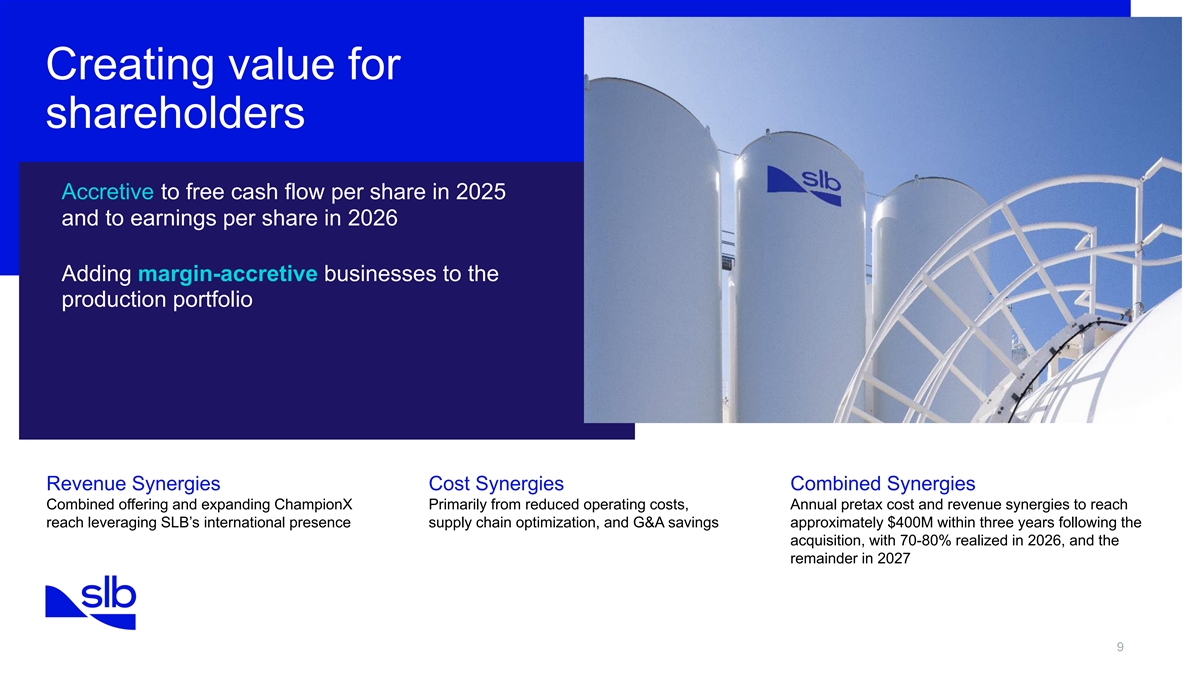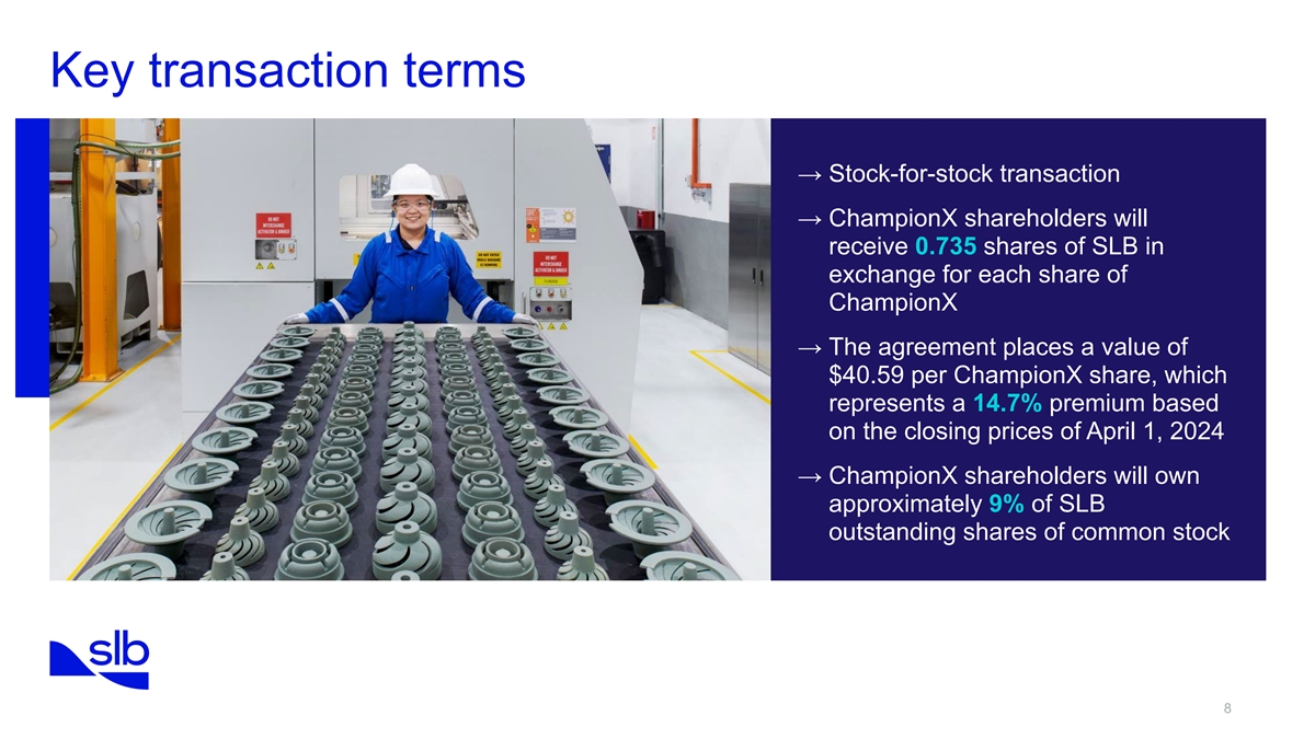 Key transaction terms → Stock-for-stock transaction → ChampionX shareholders will receive 0.735 shares of SLB in exchange for each share of ChampionX → The agreement places a value of $40.59 per ChampionX share, which represents a 14.7% premium based on the closing prices of April 1, 2024 → ChampionX shareholders will own approximately 9% of SLB outstanding shares of common stock 8
