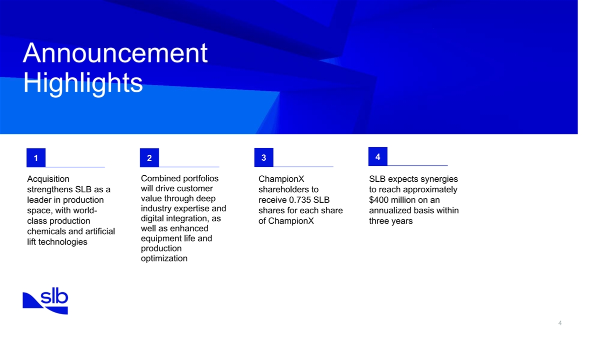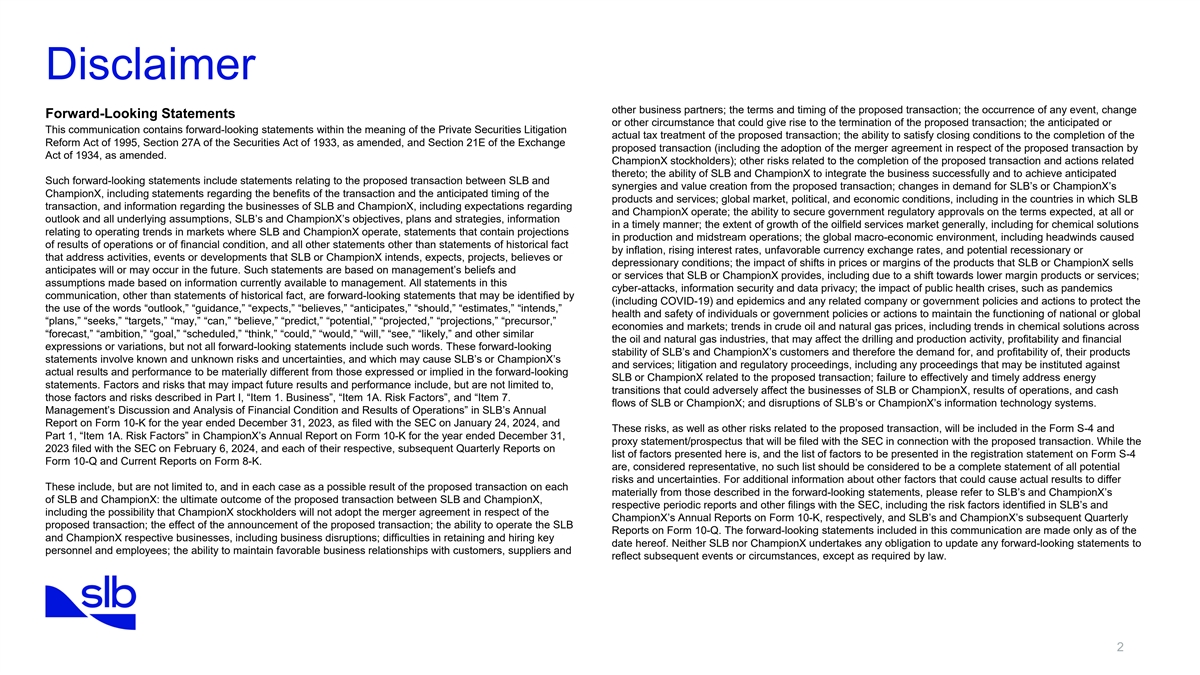 Disclaimer other business partners; the terms and timing of the proposed transaction; the occurrence of any event, change Forward-Looking Statements or other circumstance that could give rise to the termination of the proposed transaction; the anticipated or This communication contains forward-looking statements within the meaning of the Private Securities Litigation actual tax treatment of the proposed transaction; the ability to satisfy closing conditions to the completion of the Reform Act of 1995, Section 27A of the Securities Act of 1933, as amended, and Section 21E of the Exchange proposed transaction (including the adoption of the merger agreement in respect of the proposed transaction by Act of 1934, as amended. ChampionX stockholders); other risks related to the completion of the proposed transaction and actions related thereto; the ability of SLB and ChampionX to integrate the business successfully and to achieve anticipated Such forward-looking statements include statements relating to the proposed transaction between SLB and synergies and value creation from the proposed transaction; changes in demand for SLB’s or ChampionX’s ChampionX, including statements regarding the benefits of the transaction and the anticipated timing of the products and services; global market, political, and economic conditions, including in the countries in which SLB transaction, and information regarding the businesses of SLB and ChampionX, including expectations regarding and ChampionX operate; the ability to secure government regulatory approvals on the terms expected, at all or outlook and all underlying assumptions, SLB’s and ChampionX’s objectives, plans and strategies, information in a timely manner; the extent of growth of the oilfield services market generally, including for chemical solutions relating to operating trends in markets where SLB and ChampionX operate, statements that contain projections in production and midstream operations; the global macro-economic environment, including headwinds caused of results of operations or of financial condition, and all other statements other than statements of historical fact by inflation, rising interest rates, unfavorable currency exchange rates, and potential recessionary or that address activities, events or developments that SLB or ChampionX intends, expects, projects, believes or depressionary conditions; the impact of shifts in prices or margins of the products that SLB or ChampionX sells anticipates will or may occur in the future. Such statements are based on management’s beliefs and or services that SLB or ChampionX provides, including due to a shift towards lower margin products or services; assumptions made based on information currently available to management. All statements in this cyber-attacks, information security and data privacy; the impact of public health crises, such as pandemics communication, other than statements of historical fact, are forward-looking statements that may be identified by (including COVID-19) and epidemics and any related company or government policies and actions to protect the the use of the words “outlook,” “guidance,” “expects,” “believes,” “anticipates,” “should,” “estimates,” “intends,” health and safety of individuals or government policies or actions to maintain the functioning of national or global “plans,” “seeks,” “targets,” “may,” “can,” “believe,” “predict,” “potential,” “projected,” “projections,” “precursor,” economies and markets; trends in crude oil and natural gas prices, including trends in chemical solutions across “forecast,” “ambition,” “goal,” “scheduled,” “think,” “could,” “would,” “will,” “see,” “likely,” and other similar the oil and natural gas industries, that may affect the drilling and production activity, profitability and financial expressions or variations, but not all forward-looking statements include such words. These forward-looking stability of SLB’s and ChampionX’s customers and therefore the demand for, and profitability of, their products statements involve known and unknown risks and uncertainties, and which may cause SLB’s or ChampionX’s and services; litigation and regulatory proceedings, including any proceedings that may be instituted against actual results and performance to be materially different from those expressed or implied in the forward-looking SLB or ChampionX related to the proposed transaction; failure to effectively and timely address energy statements. Factors and risks that may impact future results and performance include, but are not limited to, transitions that could adversely affect the businesses of SLB or ChampionX, results of operations, and cash those factors and risks described in Part I, “Item 1. Business”, “Item 1A. Risk Factors”, and “Item 7. flows of SLB or ChampionX; and disruptions of SLB’s or ChampionX’s information technology systems. Management’s Discussion and Analysis of Financial Condition and Results of Operations” in SLB’s Annual Report on Form 10-K for the year ended December 31, 2023, as filed with the SEC on January 24, 2024, and These risks, as well as other risks related to the proposed transaction, will be included in the Form S-4 and Part 1, “Item 1A. Risk Factors” in ChampionX’s Annual Report on Form 10-K for the year ended December 31, proxy statement/prospectus that will be filed with the SEC in connection with the proposed transaction. While the 2023 filed with the SEC on February 6, 2024, and each of their respective, subsequent Quarterly Reports on list of factors presented here is, and the list of factors to be presented in the registration statement on Form S-4 Form 10-Q and Current Reports on Form 8-K. are, considered representative, no such list should be considered to be a complete statement of all potential risks and uncertainties. For additional