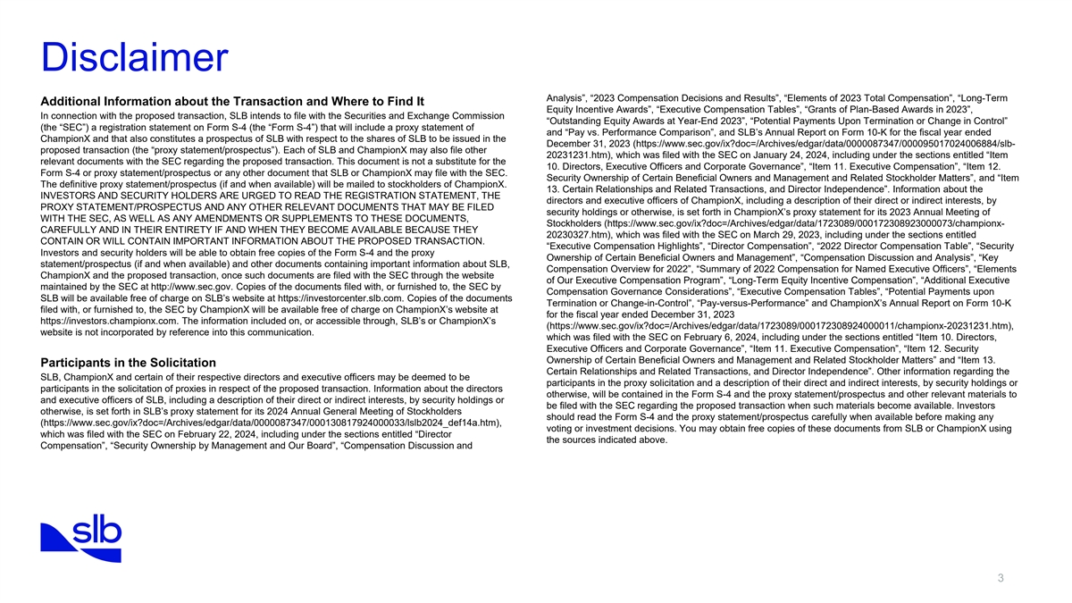 Disclaimer Analysis”, “2023 Compensation Decisions and Results”, “Elements of 2023 Total Compensation”, “Long-Term Additional Information about the Transaction and Where to Find It Equity Incentive Awards”, “Executive Compensation Tables”, “Grants of Plan-Based Awards in 2023”, In connection with the proposed transaction, SLB intends to file with the Securities and Exchange Commission “Outstanding Equity Awards at Year-End 2023”, “Potential Payments Upon Termination or Change in Control” (the “SEC”) a registration statement on Form S-4 (the “Form S-4”) that will include a proxy statement of and “Pay vs. Performance Comparison”, and SLB’s Annual Report on Form 10-K for the fiscal year ended ChampionX and that also constitutes a prospectus of SLB with respect to the shares of SLB to be issued in the December 31, 2023 (https://www.sec.gov/ix?doc=/Archives/edgar/data/0000087347/000095017024006884/slb- proposed transaction (the “proxy statement/prospectus”). Each of SLB and ChampionX may also file other 20231231.htm), which was filed with the SEC on January 24, 2024, including under the sections entitled “Item relevant documents with the SEC regarding the proposed transaction. This document is not a substitute for the 10. Directors, Executive Officers and Corporate Governance”, “Item 11. Executive Compensation”, “Item 12. Form S-4 or proxy statement/prospectus or any other document that SLB or ChampionX may file with the SEC. Security Ownership of Certain Beneficial Owners and Management and Related Stockholder Matters”, and “Item The definitive proxy statement/prospectus (if and when available) will be mailed to stockholders of ChampionX. 13. Certain Relationships and Related Transactions, and Director Independence”. Information about the INVESTORS AND SECURITY HOLDERS ARE URGED TO READ THE REGISTRATION STATEMENT, THE directors and executive officers of ChampionX, including a description of their direct or indirect interests, by PROXY STATEMENT/PROSPECTUS AND ANY OTHER RELEVANT DOCUMENTS THAT MAY BE FILED security holdings or otherwise, is set forth in ChampionX’s proxy statement for its 2023 Annual Meeting of WITH THE SEC, AS WELL AS ANY AMENDMENTS OR SUPPLEMENTS TO THESE DOCUMENTS, Stockholders (https://www.sec.gov/ix?doc=/Archives/edgar/data/1723089/000172308923000073/championx- CAREFULLY AND IN THEIR ENTIRETY IF AND WHEN THEY BECOME AVAILABLE BECAUSE THEY 20230327.htm), which was filed with the SEC on March 29, 2023, including under the sections entitled CONTAIN OR WILL CONTAIN IMPORTANT INFORMATION ABOUT THE PROPOSED TRANSACTION. “Executive Compensation Highlights”, “Director Compensation”, “2022 Director Compensation Table”, “Security Investors and security holders will be able to obtain free copies of the Form S-4 and the proxy Ownership of Certain Beneficial Owners and Management”, “Compensation Discussion and Analysis”, “Key statement/prospectus (if and when available) and other documents containing important information about SLB, Compensation Overview for 2022”, “Summary of 2022 Compensation for Named Executive Officers”, “Elements ChampionX and the proposed transaction, once such documents are filed with the SEC through the website of Our Executive Compensation Program”, “Long-Term Equity Incentive Compensation”, “Additional Executive maintained by the SEC at http://www.sec.gov. Copies of the documents filed with, or furnished to, the SEC by Compensation Governance Considerations”, “Executive Compensation Tables”, “Potential Payments upon SLB will be available free of charge on SLB’s website at https://investorcenter.slb.com. Copies of the documents Termination or Change-in-Control”, “Pay-versus-Performance” and ChampionX’s Annual Report on Form 10-K filed with, or furnished to, the SEC by ChampionX will be available free of charge on ChampionX’s website at for the fiscal year ended December 31, 2023 https://investors.championx.com. The information included on, or accessible through, SLB’s or ChampionX’s (https://www.sec.gov/ix?doc=/Archives/edgar/data/1723089/000172308924000011/championx-20231231.htm), website is not incorporated by reference into this communication. which was filed with the SEC on February 6, 2024, including under the sections entitled “Item 10. Directors, Executive Officers and Corporate Governance”, “Item 11. Executive Compensation”, “Item 12. Security Ownership of Certain Beneficial Owners and Management and Related Stockholder Matters” and “Item 13. Participants in the Solicitation Certain Relationships and Related Transactions, and Director Independence”. Other information regarding the SLB, ChampionX and certain of their respective directors and executive officers may be deemed to be participants in the proxy solicitation and a description of their direct and indirect interests, by security holdings or participants in the solicitation of proxies in respect of the proposed transaction. Information about the directors otherwise, will be contained in the Form S-4 and the proxy statement/prospectus and other relevant materials to and executive officers of SLB, including a description of their direct or indirect interests, by security holdings or be filed with the SEC regarding the proposed transaction when such materials become available. Investors otherwise, is set forth in SLB’s proxy statement for its 2024 Annual General Meeting of Stockholders should read the Form S-4 and the proxy statement/prospectus carefully when available before making any (https://www.sec.gov/ix?doc=/Archives/edgar/data/0000087347/000130817924000033/lslb2024_def14a.htm), voting or investment decisions. You may obtain free copies of these documents from SLB or ChampionX using which was filed with the SEC on February 22, 2024, including under the sections entitled “Director the sources indicated above. Compensation”, “Security Ownershi