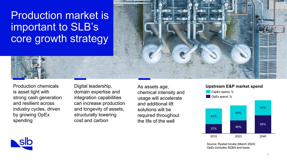 Announcement Highlights 4 1 2 3 Combined portfolios Acquisition ChampionX SLB expects synergies will drive customer strengthens SLB as a shareholders to to reach approximately value through deep leader in production receive 0.735 SLB $400 million on an industry expertise and space, with world- shares for each share annualized basis within digital integration, as class production of ChampionX three years well as enhanced chemicals and artificial equipment life and lift technologies production optimization 4