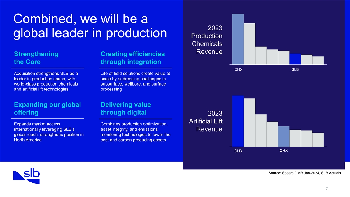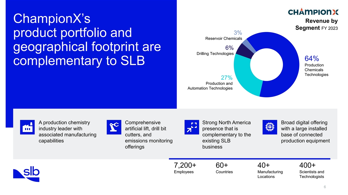 Revenue by ChampionX’s Segment FY 2023 3% product portfolio and Reservoir Chemicals 6% geographical footprint are Drilling Technologies 64% complementary to SLB Production Chemicals Technologies 27% Production and Automation Technologies A production chemistry Comprehensive Strong North America Broad digital offering industry leader with artificial lift, drill bit presence that is with a large installed associated manufacturing cutters, and complementary to the base of connected capabilities emissions monitoring existing SLB production equipment offerings business 7,200+ 60+ 40+ 400+ Employees Countries Manufacturing Scientists and Locations Technologists 6