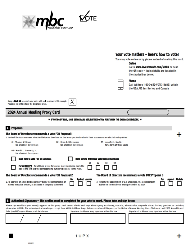 Your vote matters – here’s how to vote! You may vote online or by phone instead of mailing this card. Online Go to www.investorvote.com/MBCN or scan the QR code — login details are located in the shaded bar below. Phone Call toll free 1-800-652-VOTE (8683) within the USA, US territories and Canada Using a black ink pen, mark your votes with an X as shown in this example. Please do not write outside the designated areas. 2024 Annual Meeting Proxy Card q IF VOTING BY MAIL, SIGN, DETACH AND RETURN THE BOTTOM PORTION IN THE ENCLOSED ENVELOPE. q A Proposals The Board of Directors recommends a vote FOR Proposal 1 1. To elect the four nominees identified below as directors for the term specified and until their successors are elected and qualified 01 - Thomas W. Bevan 02 - Kevin A. DiGeronimo 03 - Jennifer L. Moeller for a term of three years for a term of three years for a term of three years 04 - Ronald L. Zimmerly, Jr. for a term of three years Mark here to vote FOR all nominees Mark here to WITHHOLD vote from all nominees For All EXCEPT - To withhold a vote for one or more nominees, mark the box to the left and the corresponding numbered box(es) to the right. 01 02 03 04 The Board of Directors recommends a vote FOR Proposal 2 The Board of Directors recommends a vote FOR Proposal 3 For Against Abstain For Against Abstain 2. To approve, on a non-binding advisory basis, the compensation of named executive officers, as disclosed in the proxy statement 3. To ratify the appointment of S.R. Snodgrass, P.C. as independent auditor for the fiscal year ending December 31, 2024 B Authorized Signatures — This section must be completed for your vote to count. Please date and sign below. Please sign exactly as your name(s) appears on this proxy. Joint owners should each sign. When signing as attorney, executor, administrator, corporate officer, trustee, guardian, or custodian, please give full title. The undersigned acknowledges receipt from Middlefield Banc Corp., before execution of this proxy, of the Notice of Annual Meeting, Proxy Statement, and 2023 Annual Report. Date (mm/dd/yyyy) — Please print date below. Signature 1 — Please keep signature within the box. Signature 2 — Please keep signature within the box. 03Y5PC 1 U P X +
