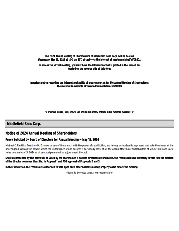 The 2024 Annual Meeting of Shareholders of Middlefield Banc Corp. will be held on Wednesday, May 15, 2024 at 1:00 pm EDT, virtually via the internet at meetnow.global/MFDL4CJ. To access the virtual meeting, you must have the information that is printed in the shaded bar located on the reverse side of this form. Important notice regarding the Internet availability of proxy materials for the Annual Meeting of Shareholders. The material is available at: www.edocumentview.com/MBCN q IF VOTING BY MAIL, SIGN, DETACH AND RETURN THE BOTTOM PORTION IN THE ENCLOSED ENVELOPE. q Middlefield Banc Corp. Notice of 2024 Annual Meeting of Shareholders Proxy Solicited by Board of Directors for Annual Meeting — May 15, 2024 Michael C. Ranttila, Courtney M. Erminio, or any of them, each with the power of substitution, are hereby authorized to represent and vote the shares of the undersigned, with all the powers which the undersigned would possess if personally present, at the Annual Meeting of Shareholders of Middlefield Banc Corp. to be held on May 15, 2024 or at any postponement or adjournment thereof. Shares represented by this proxy will be voted by the shareholder. If no such directions are indicated, the Proxies will have authority to vote FOR the election of the director nominees identified in Proposal 1 and FOR approval of Proposals 2 and 3. In their discretion, the Proxies are authorized to vote upon such other business as may properly come before the meeting. (Items to be voted appear on reverse side)