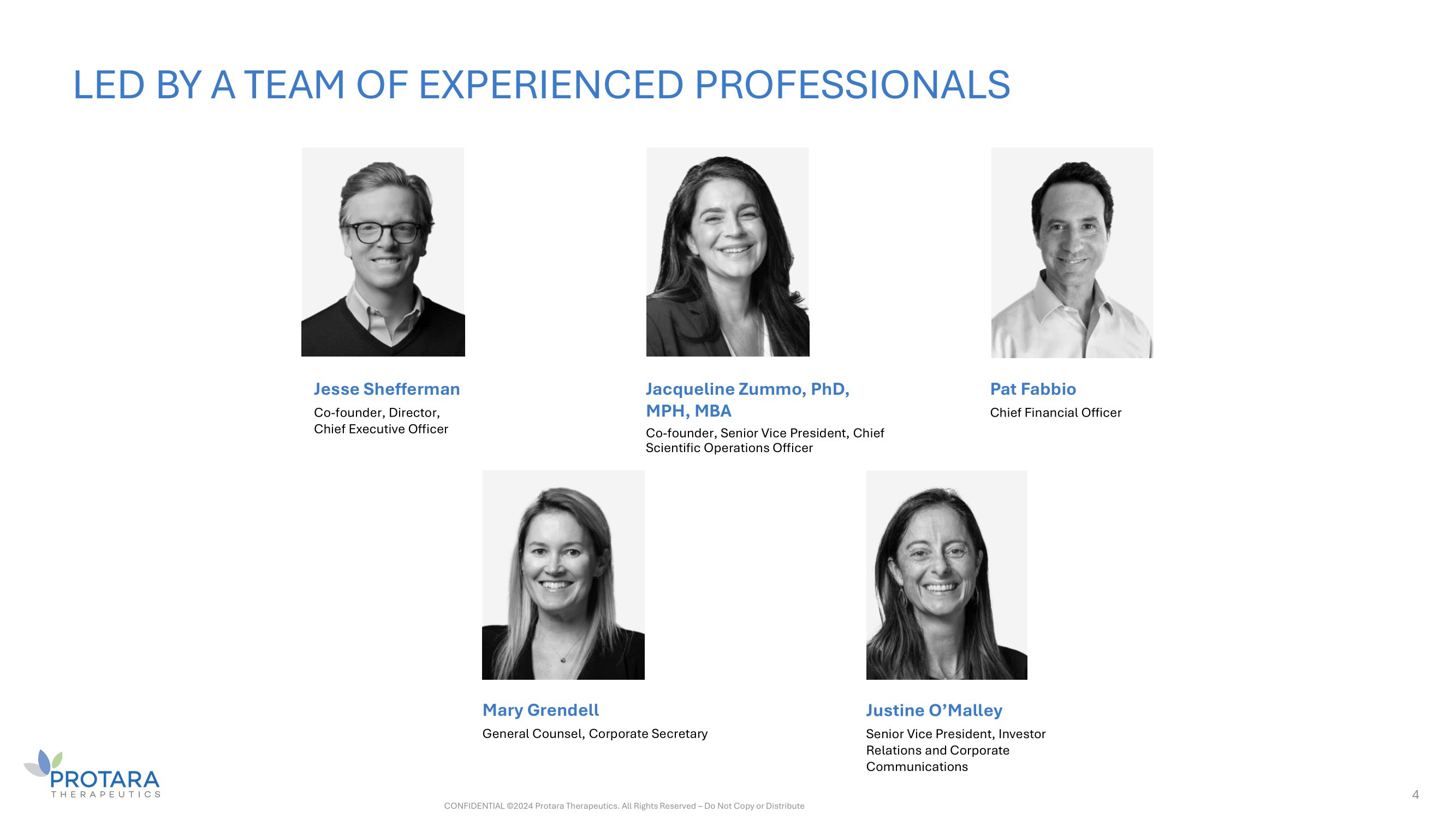 FORWARD LOOKING STATEMENTS Statements contained in this presentation regarding matters that are not historical facts are "forward looking statements" within the meaning of the Private Securities Litigation Reform Act of 1995 . Protara may, in some cases, use terms such as “predicts,” “believes,” “potential,” “proposed,” “continue,” “designed,” “estimates,” “anticipates,” “expects,” “plans,” “intends,” “may,” “could,” “might,” “will,” “should” or other words or expressions referencing future events, conditions or circumstances that convey uncertainty of future events or outcomes to identify these forward - looking statements . Although Protara believes that it has a reasonable basis for each forward - looking statement contained in this presentation, Protara cautions you that forward - looking statements are not guarantees of future performance and that its actual results of operations, financial condition and liquidity, and the development of the industry in which Protara operates may differ materially from the forward - looking statements contained in this presentation . Such forward - looking statements include but are not limited to, statements regarding Protara’s intentions, beliefs, projections, outlook, analyses or current expectations concerning, among other things : Protara’s business strategy, including its development plans for its product candidates and plans regarding the timing or outcome of existing or future clinical trials ; statements related to expectations regarding interactions with the U . S . Food and Drug Administration (FDA) , Protara’s financial footing ; statements regarding the anticipated safety or efficacy of Protara’s product candidates ; and Protara’s outlook for the remainder of the year . Because such statements are subject to risks and uncertainties, actual results may differ materially from those expressed or implied by such forward - looking statements . Factors that contribute to the uncertain nature of the forward - looking statements include : risks that Protara’s financial guidance may not be as expected, as well as risks and uncertainties associated with : Protara’s development programs, including the initiation and completion of non - clinical studies and clinical trials and the timing of required filings with the FDA and other regulatory agencies ; general market conditions ; changes in the competitive landscape ; changes in Protara’s strategic and commercial plans ; Protara’s ability to obtain sufficient financing to fund its strategic plans and commercialization efforts ; having to use cash in ways or on timing other than expected ; the impact of market volatility on cash reserves ; the loss of key members of management ; the impact of general U . S . and foreign, economic, industry, market, regulatory, political or public health conditions ; and the risks and uncertainties associated with Protara’s business and financial condition in general, including the risks and uncertainties described more fully under the caption “Risk Factors” and elsewhere in Protara's filings and reports with the United States Securities and Exchange Commission . All forward - looking statements contained in this presentation speak only as of the date on which they were made and are based on management's assumptions and estimates as of such date . Protara undertakes no obligation to update any forward - looking statements, whether as a result of the receipt of new information, the occurrence of future events or otherwise, except as required by law . This presentation shall not constitute an offer to sell or the solicitation of an offer to buy any securities, nor shall there be any sale of any securities in any state or jurisdiction in which such offer, solicitation or sale would be unlawful prior to registration or qualification under the securities laws of any such state or jurisdiction . The information provided in this presentation is strictly confidential . You must keep any information we provide to you at this meeting confidential unless and until we make such information public . 2 CONFIDENTIAL ©2024 Protara Therapeutics. All Rights Reserved – Do Not Copy or Distribute