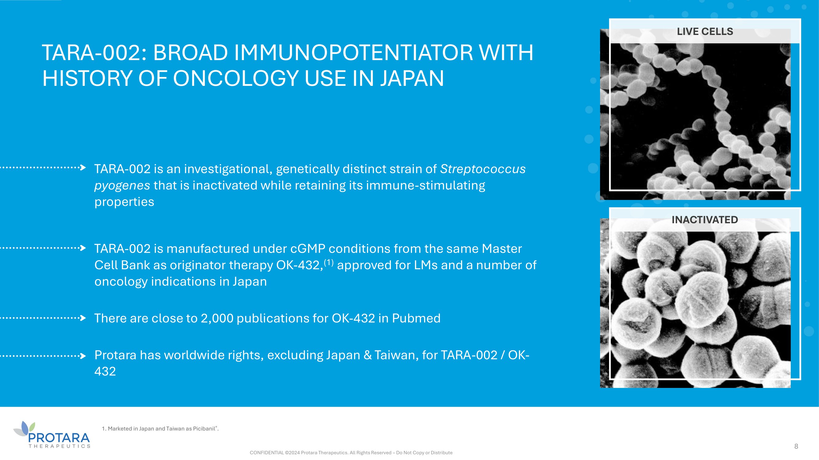 TARA-002 is an investigational cell therapy in development for the treatment of NMIBC and of lymphatic malformations (LMs), for which it has been granted Rare Pediatric Disease Designation by the U.S. Food and Drug Administration. TARA-002 was developed from the same master cell bank of genetically distinct group A Streptococcus pyogenes as OK-432, a broad immunopotentiator marketed as Picibanil® in Japan and approved in Taiwan by Chugai Pharmaceutical Co., Ltd. Protara has successfully shown manufacturing comparability between TARA-002 and OK-432.