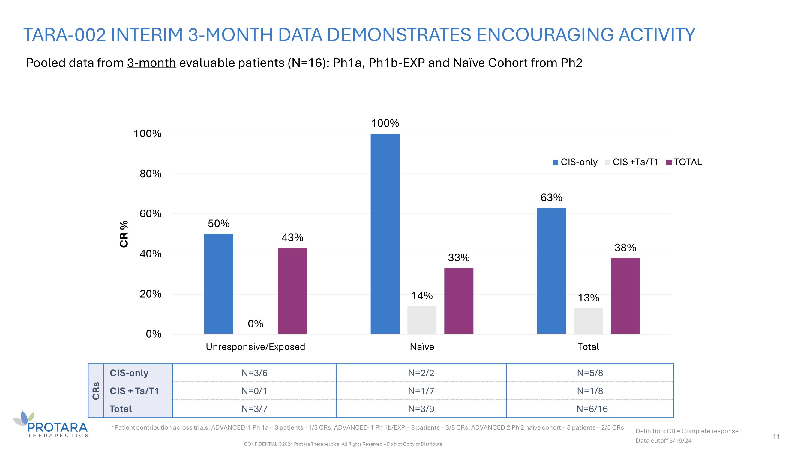 “We are highly encouraged by these early results observed in these three-month evaluable patients across our ADVANCED-1 and ADVANCED-2 clinical trials, which clearly demonstrate TARA-002’s activity in both BCG-Unresponsive and BCG-Naïve patients. We look forward to sharing data from post-reinduction, six-month evaluable patients in our ADVANCED-2 trial in the second half of 2024,” said Jesse Shefferman, Chief Executive Officer of Protara Therapeutics.