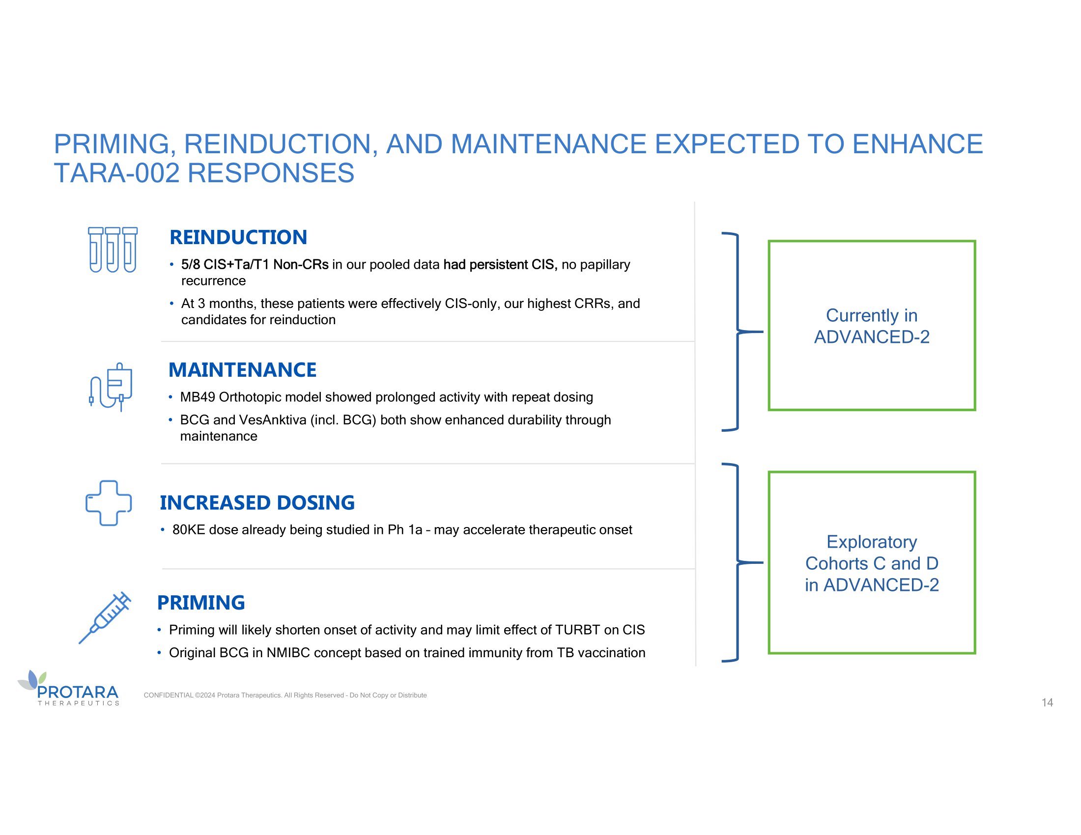 Enrollment continues in the Company’s ADVANCED-2 Phase 2 clinical trial of TARA-002 in patients with high-grade NMIBC with BCG-Unresponsive CIS and BCG-Naïve CIS. The ADVANCED-2 Phase 2 trial design incorporates both reinduction and maintenance dosing. The Company expects to share preliminary results from a pre-planned risk-benefit analysis of the ADVANCED-2 Phase 2 trial in ten patients, who are six-month evaluable in the second half of 2024.