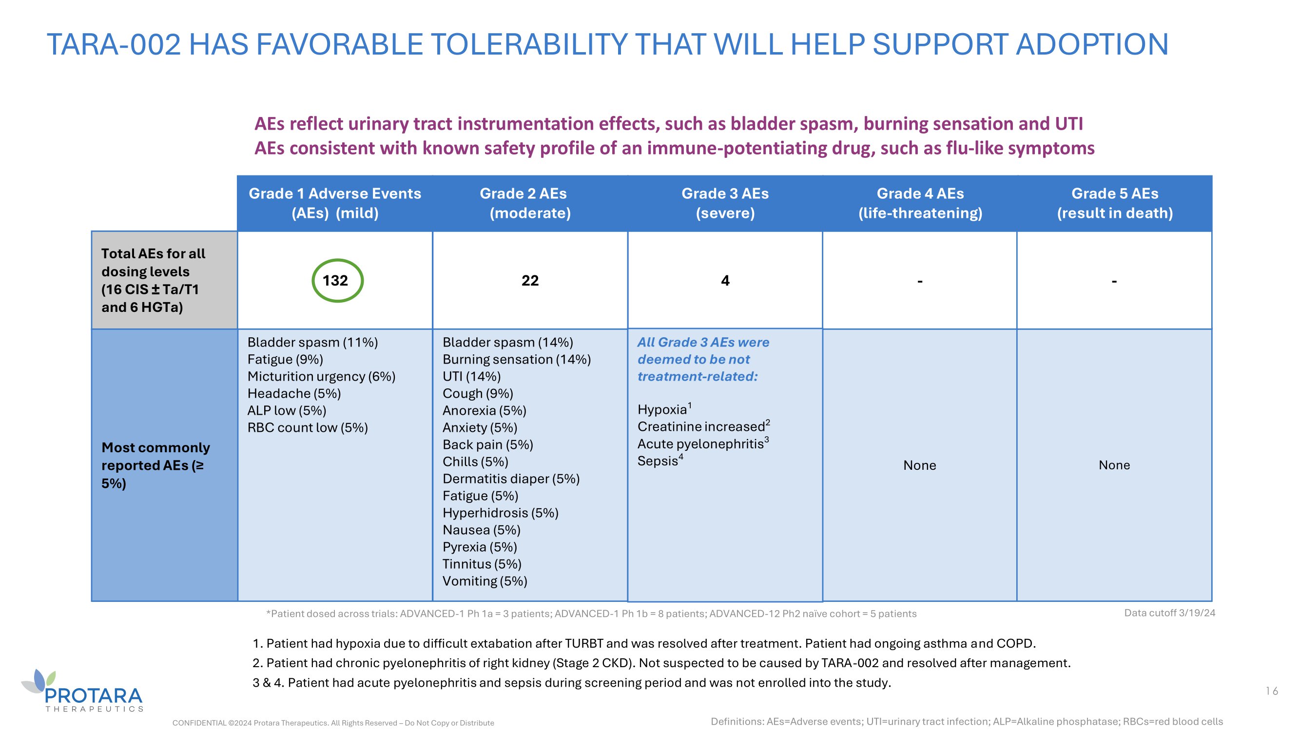16 Grade 5 AEs (result in death) Grade 4 AEs (life - threatening) Grade 3 AEs (severe) Grade 2 AEs (moderate) Grade 1 Adverse Events (AEs) (mild) - - 4 22 132 Total AEs for all dosing levels (16 CIS Ta/T1 and 6 HGTa) None None All Grade 3 AEs were deemed to be not treatment - related: Hypoxia 1 Creatinine increased 2 Acute pyelonephritis 3 Sepsis 4 Bladder spasm (14%) Burning sensation (14%) UTI (14%) Cough (9%) Anorexia (5%) Anxiety (5%) Back pain (5%) Chills (5%) Dermatitis diaper (5%) Fatigue (5%) Hyperhidrosis (5%) Nausea (5%) Pyrexia (5%) Tinnitus (5%) Vomiting (5%) Bladder spasm (11%) Fatigue (9%) Micturition urgency (6%) Headache (5%) ALP low (5%) RBC count low (5%) Most commonly reported AEs (≥ 5%) AEs reflect urinary tract instrumentation effects, such as bladder spasm, burning sensation and UTI AEs consistent with known safety profile of an immune - potentiating drug, such as flu - like symptoms TARA - 002 HAS FAVORABLE TOLERABILITY THAT WILL HELP SUPPORT ADOPTION 1. Patient had hypoxia due to difficult extabation after TURBT and was resolved after treatment. Patient had ongoing asthma and COPD. 2. Patient had chronic pyelonephritis of right kidney (Stage 2 CKD). Not suspected to be caused by TARA - 002 and resolved after management. 3 & 4. Patient had acute pyelonephritis and sepsis during screening period and was not enrolled into the study. CONFIDENTIAL ©2024 Protara Therapeutics. All Rights Reserved – Do Not Copy or Distribute *Patient dosed across trials: ADVANCED - 1 Ph 1a = 3 patients; ADVANCED - 1 Ph 1b = 8 patients; ADVANCED - 12 Ph2 naïve cohort = 5 patients Data cutoff 3/19/24 Definitions: AEs=Adverse events; UTI=urinary tract infection; ALP=Alkaline phosphatase; RBCs=red blood cells