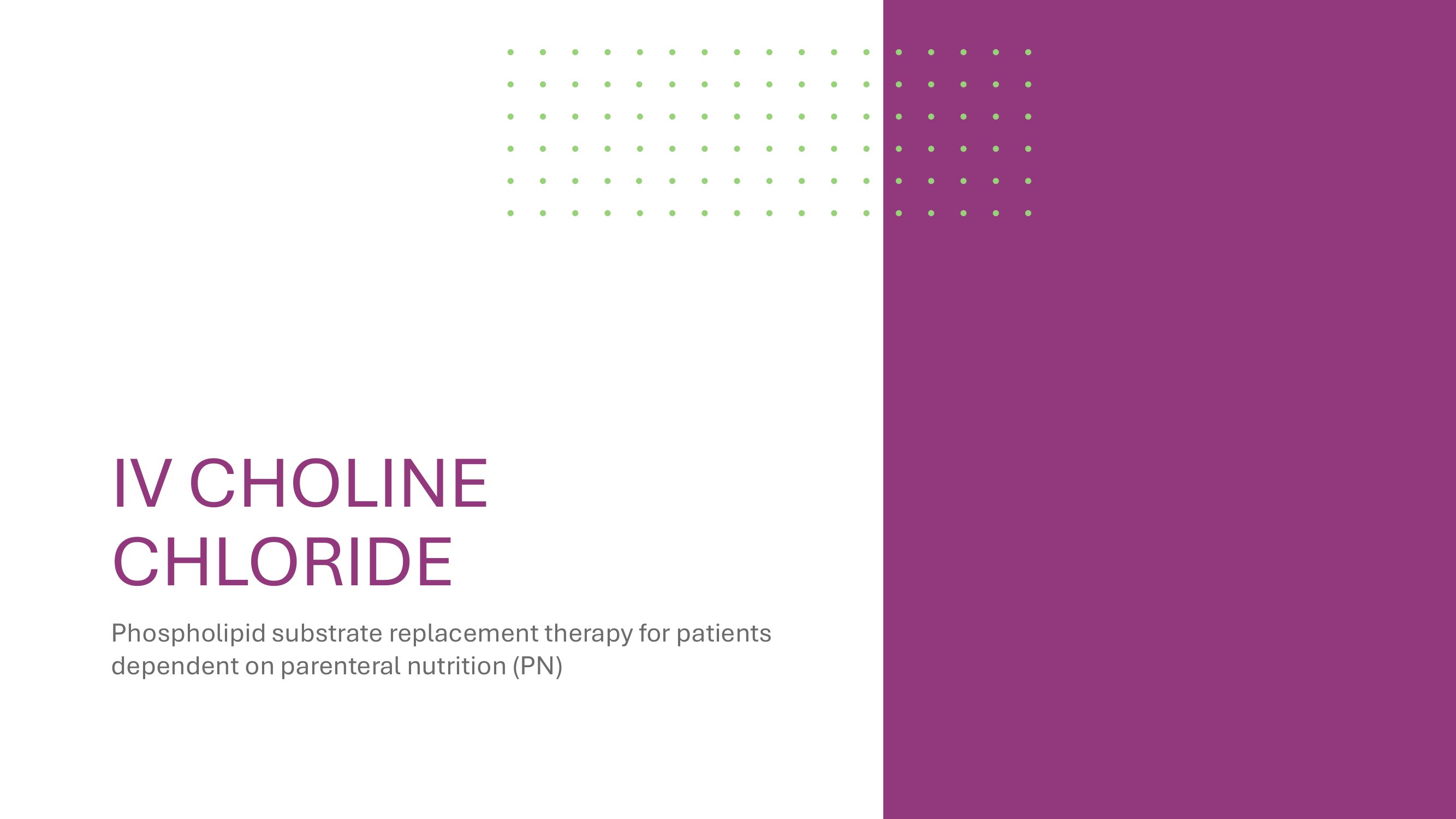 IV Choline Chloride is an investigational, intravenous (IV) phospholipid substrate replacement therapy initially in development for patients receiving parenteral nutrition (PN). Choline is a known important substrate for phospholipids that are critical for healthy liver function and also plays an important role in modulating gene expression, cell membrane signaling, brain development and neurotransmission, muscle function, and bone health. PN patients are unable to synthesize choline from enteral nutrition sources, and there are currently no available PN formulations containing choline. Approximately 80 percent of PN-dependent patients are choline-deficient and have some degree of liver damage, which can lead to hepatic failure. There are currently no available PN formulations containing choline. In the U.S. alone, there are approximately 40,000 patients on long-term parenteral nutrition who would benefit from an IV formulation of choline. IV Choline Chloride has the potential to become the first FDA approved IV choline formulation for PN patients. IV Choline Chloride has been granted Orphan Drug Designation by the FDA for the prevention of choline deficiency in PN patients. The Company was issued a U.S. patent claiming a choline composition with a term expiring in 2041.
