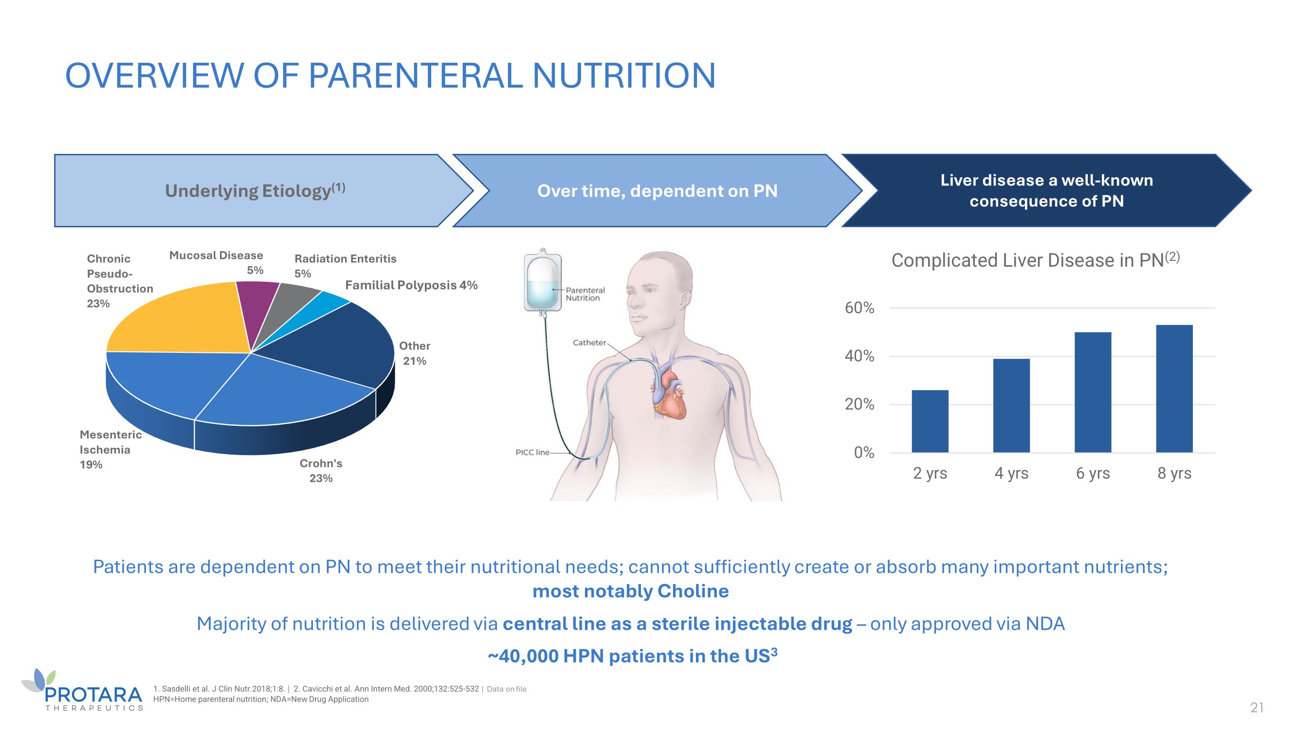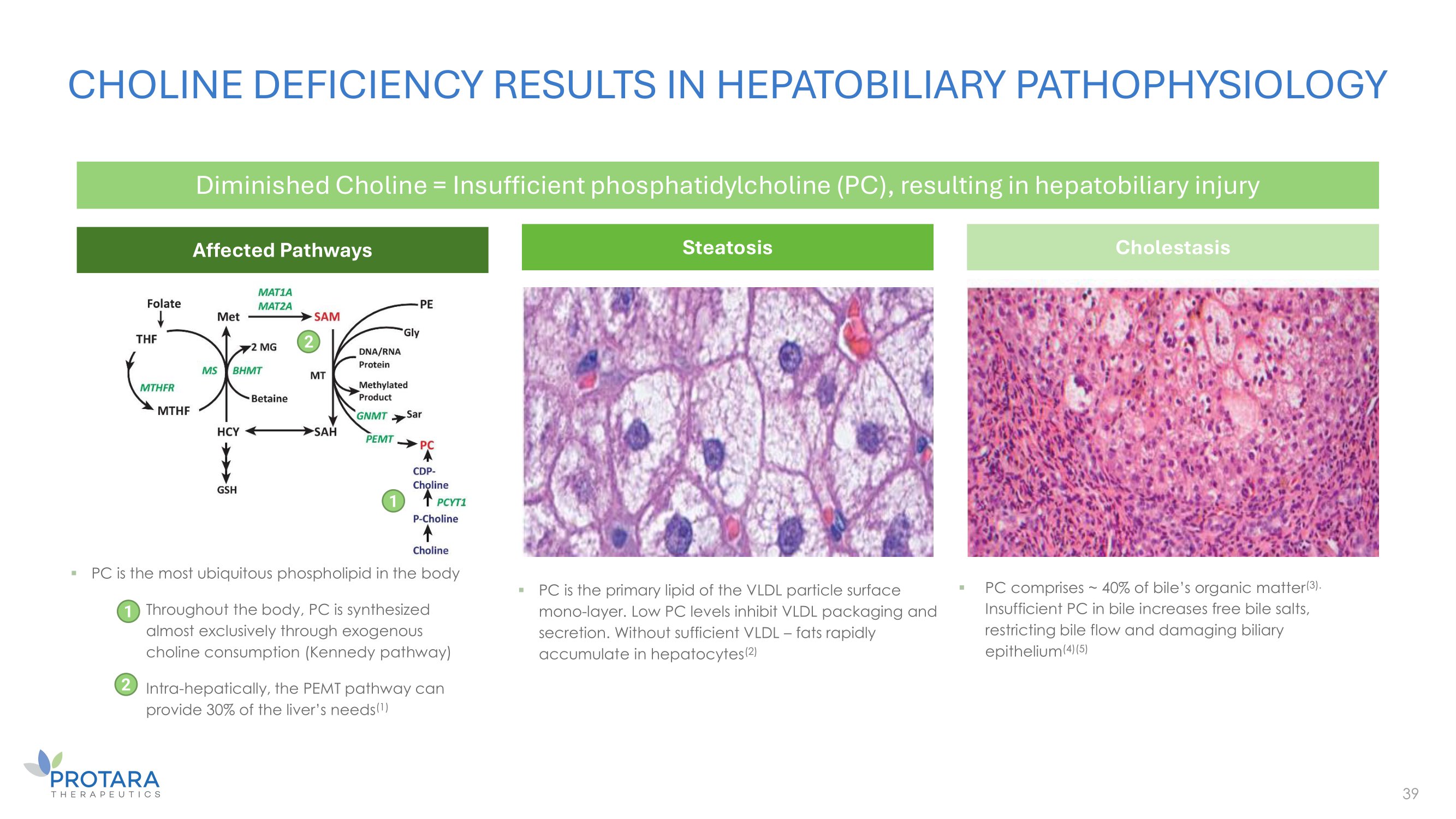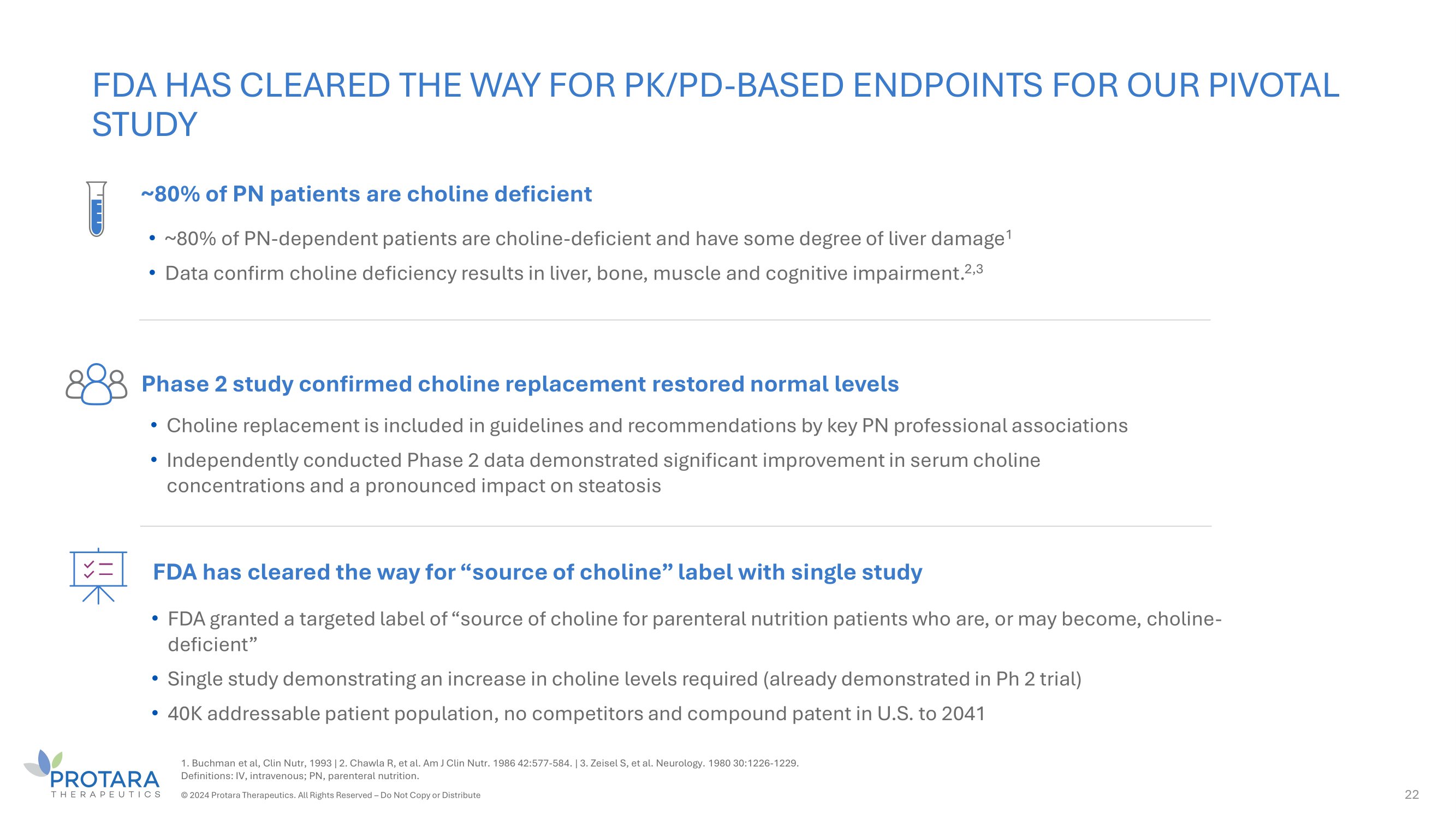 INDEPENDENT STUDIES DEMONSTRATE THAT TREATMENT WITH IV CHOLINE RAPIDLY RESTORES CHOLINE LEVELS AND IMPROVES STEATOSIS 23 CONFIDENTIAL ©2024 Protara Therapeutics. All Rights Reserved – Do Not Copy or Distribute PLASMA FREE CHOLINE LEVELS: ALL PATIENTS (1) Choline supplementation was discontinued at week 24. Data are presented for all subjects up until time of withdrawal from the study. PLASMA FREE CHOLINE Nmol/ml Choline D/C’d 0 2 4 6 20 24 34 P=0.225 P=0.043 P=0.034 P=0.025 P=0.011 P=0.021 P=0.074 45 40 35 30 25 20 15 10 5 0 Choline 12 16 Assessment Week Placebo // // CLINICALLY MEANINGFUL IMPROVEMENT IN STEATOSIS (1) P=0.385 Studies conducted by independent academic institution 1. Buchman et al. JPEN, 2002 - Protara Therapeutics re - analysis of patient CRFs, data on file. Choline D/C'd Assessment Week S Means tderr) ange f aseli L (+/ - s of ch rom B ne of MRI - p= 0.4770 p= 0.0197 p= 0.0312 p= 0.0180 p= 0.0014 p= 0.0091 p= 0.0021 p= 0.1823 // // - 15 - 12 - 9 - 6 - 3 0 3 2 4 6 12 16 20 24 34 Placebo Choline Chloride * * * ** ** ** - 3 3 0 - 6 - 9 - 2 1 - 15 Assessment Week *p<0.02 **p<0.05 2 4 6 12 16 20 Choline D/C’d 34 24 Significant differences in the LS mean change from baseline in MRI - PDFF observed in Choline group vs. placebo at Weeks 4 - 24, demonstrating a clinically meaningful and statistically significant reduction in steatosis (range 31% - 54%) * CT converted to MRI - PDFF: *MRI - PDFF (%) = - 0.572*Liver CT(HU) + 37.264 LS Mean ( std err) of Change from Baseline in M PD R F I - F PDFF Primary endpoint to replicate in registrational trial Secondary endpoint to replicate in registrational trial to support clinical benefit