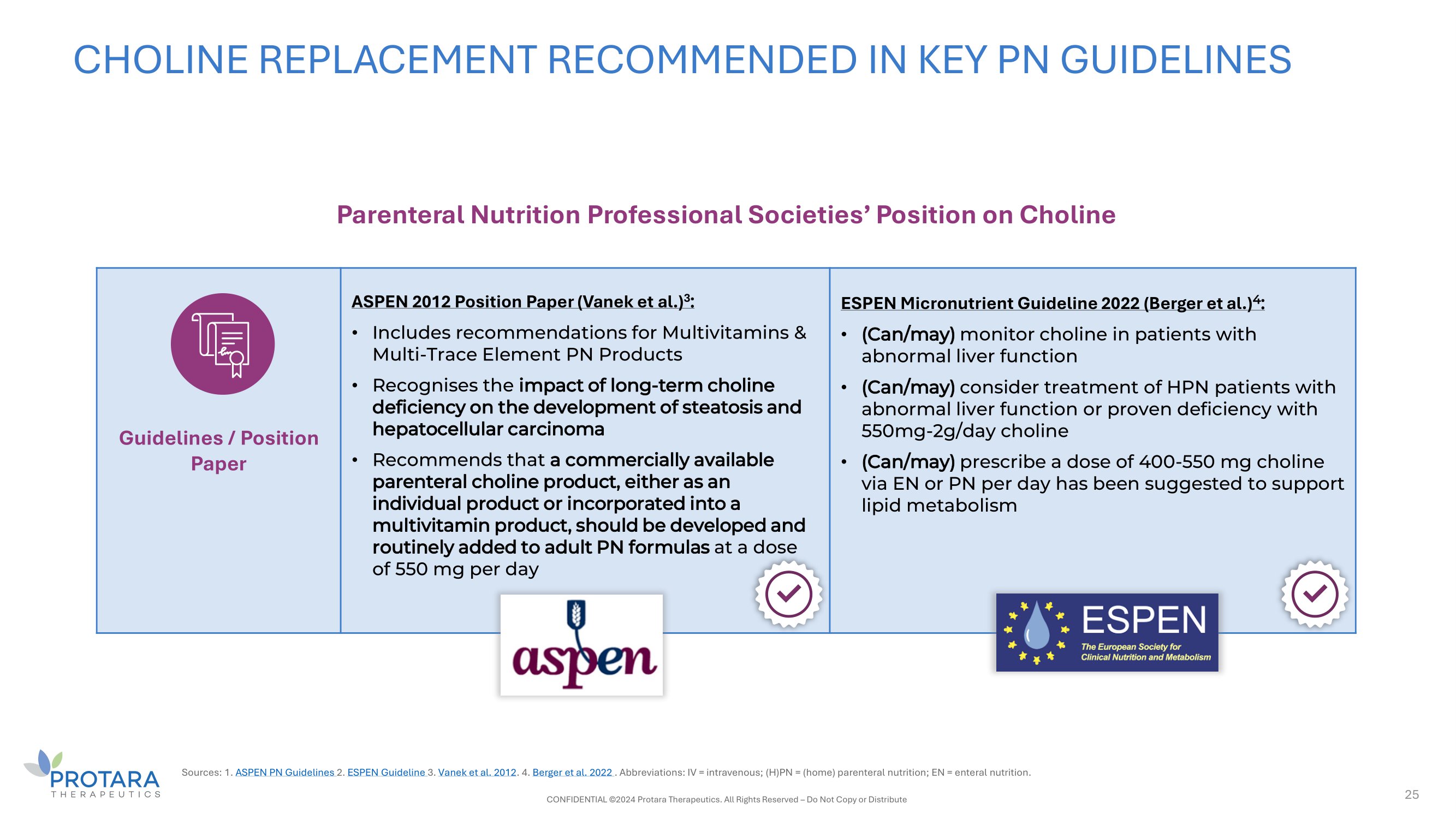 CHOLINE REPLACEMENT RECOMMENDED IN KEY PN GUIDELINES 25 Parenteral Nutrition Professional Societies’ Position on Choline Guidelines / Position Paper ASPEN 2012 Position Paper (Vanek et al.) 3 : • Includes recommendations for Multivitamins & Multi - Trace Element PN Products • Recognises the impact of long - term choline deficiency on the development of steatosis and hepatocellular carcinoma • Recommends that a commercially available parenteral choline product, either as an individual product or incorporated into a multivitamin product, should be developed and routinely added to adult PN formulas at a dose of 550 mg per day ESPEN Micronutrient Guideline 2022 (Berger et al.) 4 : • (Can/may) monitor choline in patients with abnormal liver function • (Can/may) consider treatment of HPN patients with abnormal liver function or proven deficiency with 550mg - 2g/day choline • (Can/may) prescribe a dose of 400 - 550 mg choline via EN or PN per day has been suggested to support lipid metabolism Sources: 1. ASPEN PN Guidelines 2. ESPEN Guideline 3. Vanek et al. 2012 . 4. Berger et al. 2022 . Abbreviations: IV = intravenous; (H)PN = (home) parenteral nutrition; EN = enteral nutrition. CONFIDENTIAL ©2024 Protara Therapeutics. All Rights Reserved – Do Not Copy or Distribute