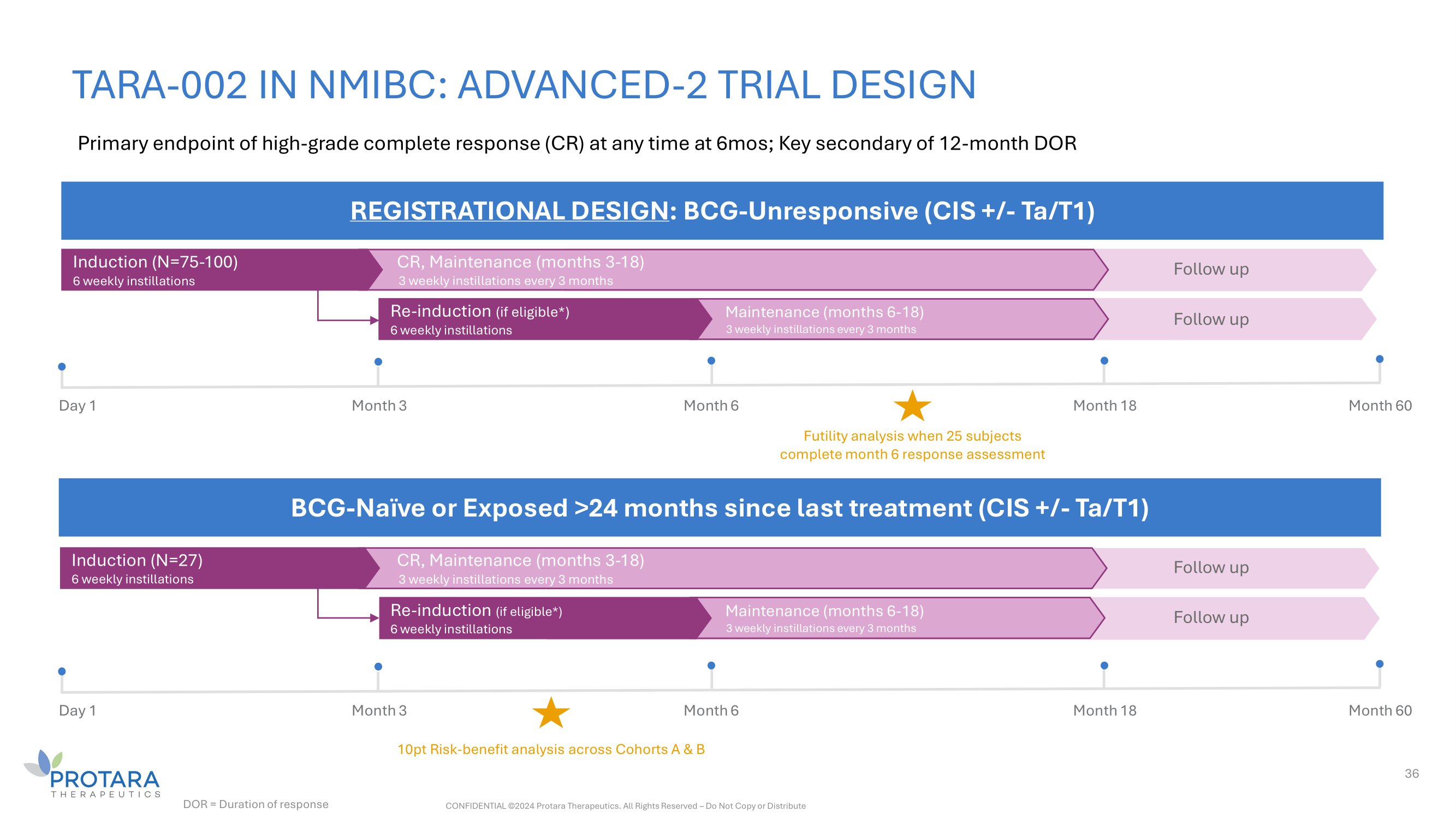 Expansion TARA - 002 IN NMIBC: PHASE 1 CLINICAL TRIAL DESIGN PHASE 1 Dose finding, open - label trial with expansion evaluating intravesical TARA - 002 in adults with high - grade NMIBC Phase 1a: Dose Escalation 1 Phase 1b: Expansion Cohort 1 3+3 Dose Esc alation Design Enroll 10 KE 20 KE 40 KE NMIBC HGCIS or HGTa in patients previously treated or unable to access BCG (BCG - naïve 2 ) N = 9 – 18 patients • Evaluate safety, tolerability and preliminary signs of anti - tumor activity of TARA - 002 and establish MTD and RP2D for Phase 2 study Enroll RP2D (40KE) NMIBC HGCIS active disease 3 N = up to 12 patients* *Subjects enrolled in the dose expansion phase will not include subjects previously enrolled and treated in the dose escalation phase • Further assess safety and preliminary signs of anti - tumor activity of TARA - 002 at the established RP2D 1. Subjects will receive weekly intravesical doses of TARA - 002 instillation for 6 weeks. | 2. Defined as not previously treated with or unable to access BCG. | 3. Defined as disease present at last cystoscopic evaluation during the dose expansion phase. Definitions: BCG, bacillus Calmette - Guérin; HGCIS, high - grade carcinoma in situ; HGTa, high - grade Ta; KE, Klinische Einheit; MTD, maximum tolerated dose; RP2D, recommended phase 2 dose; TURBT, trans urethral resection of bladder tumor. 35 CONFIDENTIAL ©2024 Protara Therapeutics. All Rights Reserved – Do Not Copy or Distribute 80 KE
