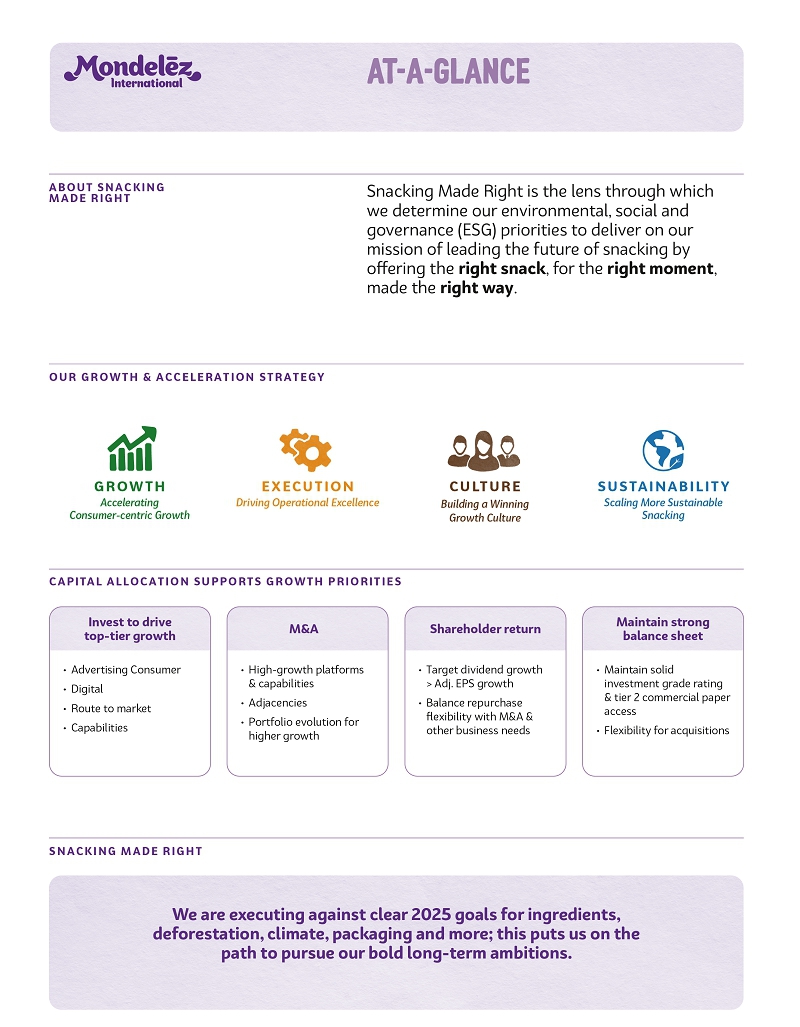 | • | Growth: Accelerating growth and focusing our portfolio to generate about 90% of revenue in the attractive, resilient core categories of chocolate, biscuits, and baked snacks with a focus on mindful snacking. |