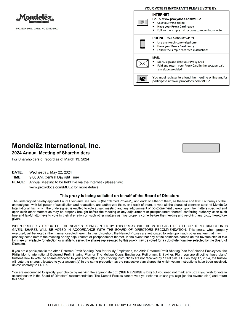 On or about April 5, 2024, we distributed the Notice of Internet Availability of Proxy Materials and made available electronically the Proxy Statement, Proxy Card and Annual Report on Form 10-K for the year ended December 31, 2023 (the “2023 Form 10-K”) online at www.proxydocs.com/MDLZ. On or about April 5, 2024, we expect to mail the Proxy Statement, Proxy Card and Annual Report on Form 10-K for the year ended December 31, 2023 to shareholders who previously elected to receive a paper copy of the Proxy Materials.