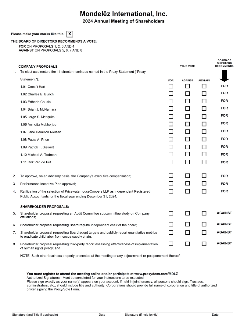 Shareholders of record of Mondelēz International Class A Common Stock at the close of business on March 13, 2024 are entitled to vote at the 2024 Annual Meeting of Shareholders (the “Annual Meeting”).