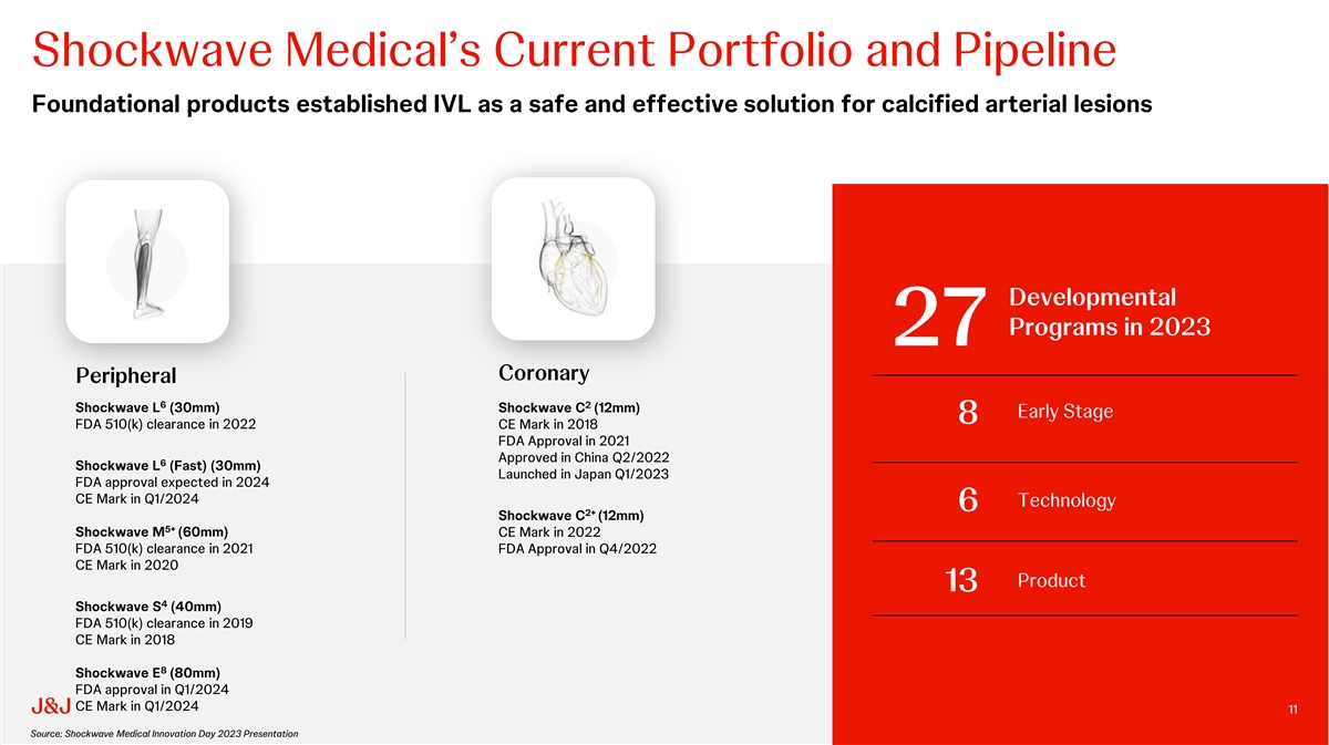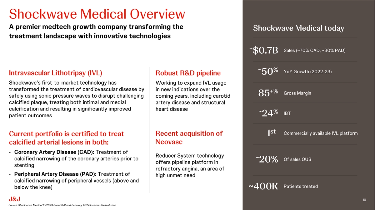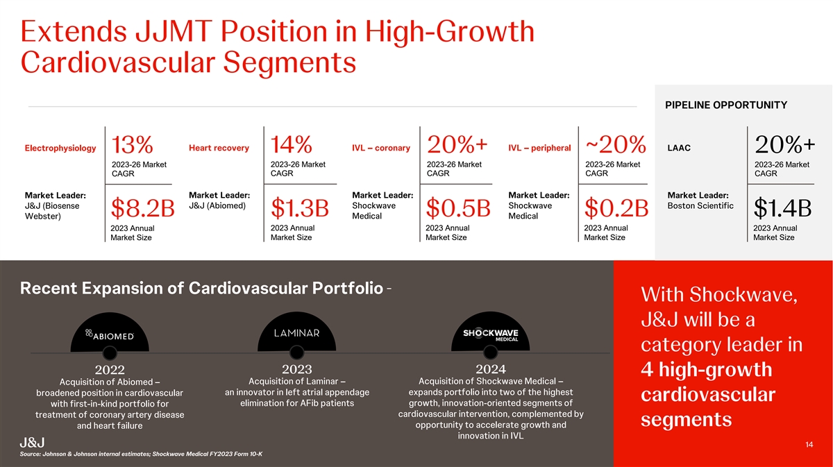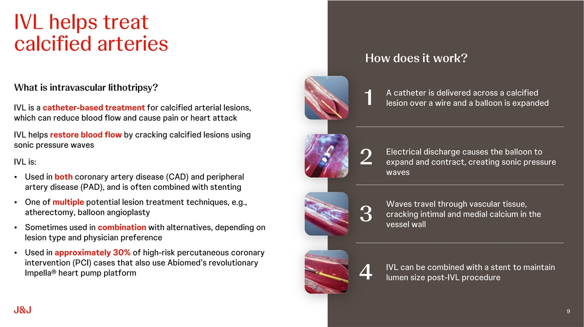 | | Solidifies Johnson & Johnson MedTechs leadership in cardiovascular intervention: IVL is the only technology that can treat both intimal and medial calcification, and Shockwave offers the first and only commercially available IVL platform for CAD and PAD. This acquisition will complement Johnson & Johnson MedTechs leadership positions in heart recovery (Abiomed) and electrophysiology (Biosense Webster) to make it a category leader in four of the largest and highest-growth medtech markets within cardiovascular intervention. |