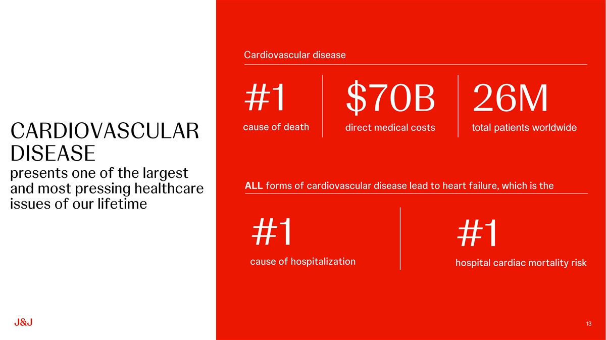 Cardiovascular disease #1 $70B 26M cause of death direct medical costs total patients worldwide CARDIOVASCULAR DISEASE presents one of the largest ALL forms of cardiovascular disease lead to heart failure, which is the and most pressing healthcare issues of our lifetime #1 #1 cause of hospitalization hospital cardiac mortality risk 13