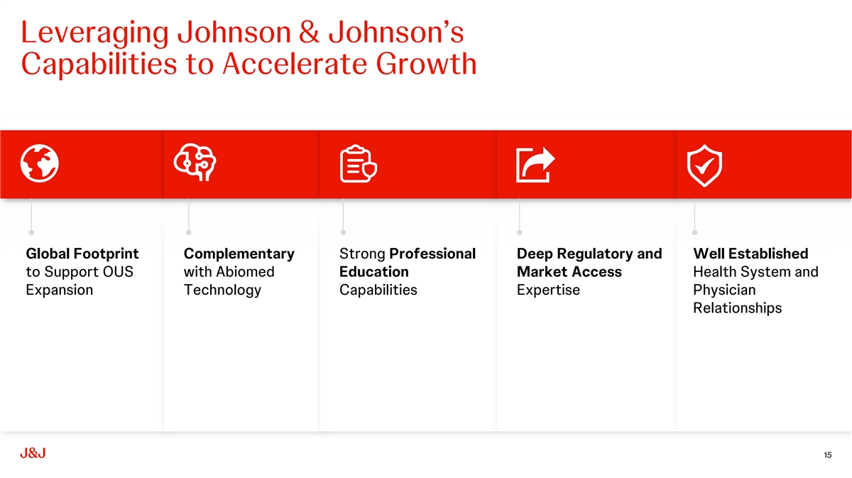 Extends JJMT Position in High-Growth Cardiovascular Segments PIPELINE OPPORTUNITY Electrophysiology Heart recovery IVL – coronary IVL – peripheral LAAC 14% 20%+ ~20% 13% 20%+ 2023-26 Market 2023-26 Market 2023-26 Market 2023-26 Market 2023-26 Market CAGR CAGR CAGR CAGR CAGR Market Leader: Market Leader: Market Leader: Market Leader: Market Leader: J&J (Biosense J&J (Abiomed) Shockwave Shockwave Boston Scientific $8.2B $1.3B $0.5B $0.2B $1.4B Webster) Medical Medical 2023 Annual 2023 Annual 2023 Annual 2023 Annual 2023 Annual Market Size Market Size Market Size Market Size Market Size Recent Expansion of Cardiovascular Portfolio With Shockwave, J&J will be a category leader in 2023 2024 2022 4 high-growth Acquisition of Abiomed – Acquisition of Laminar – Acquisition of Shockwave Medical – an innovator in left atrial appendage expands portfolio into two of the highest broadened position in cardiovascular cardiovascular elimination for AFib patients growth, innovation-oriented segments of with first-in-kind portfolio for cardiovascular intervention, complemented by treatment of coronary artery disease segments opportunity to accelerate growth and and heart failure innovation in IVL 14 Source: Johnson & Johnson internal estimates; Shockwave Medical FY2023 Form 10-K