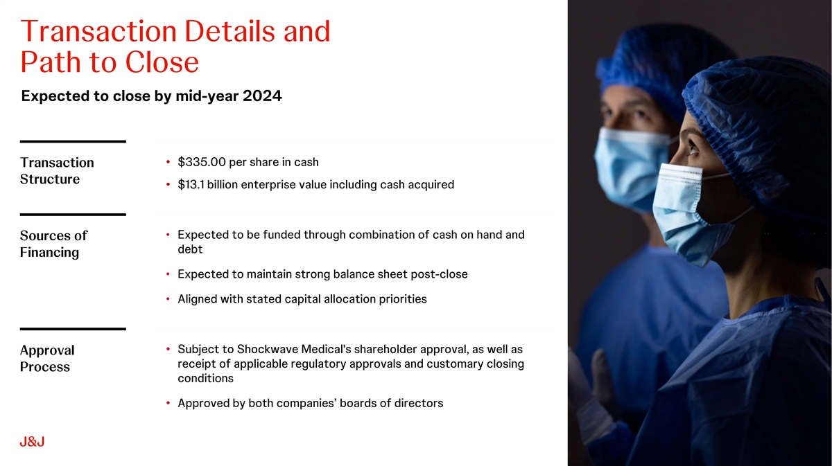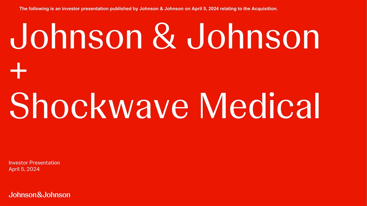 Additional Information and Where to Find It This communication may be deemed to be solicitation material in respect of the proposed acquisition of Shockwave Medical by Johnson & Johnson. In connection with the proposed transaction, Shockwave intends to file relevant materials with the U.S. Securities and Exchange Commission (“SEC”), including Shockwave’s proxy statement in preliminary and definitive form. Promptly after filing the definitive proxy statement, Shockwave will mail the definitive proxy statement and a proxy card to the security holders of Shockwave. INVESTORS AND SECURITY HOLDERS OF SHOCKWAVE ARE URGED TO READ ALL RELEVANT DOCUMENTS FILED WITH THE SEC, INCLUDING SHOCKWAVE’S PROXY STATEMENT (WHEN THEY ARE AVAILABLE), BECAUSE THEY CONTAIN OR WILL CONTAIN IMPORTANT INFORMATION ABOUT THE PROPOSED TRANSACTION AND THE PARTIES TO THE PROPOSED TRANSACTION. Investors and security holders of Shockwave are or will be able to obtain these documents (when they are available) free of charge from the SEC’s website at www.sec.gov or free of charge from Shockwave on Shockwave’s website at www.ir.shockwavemedical.com/. Participants in the Solicitation Johnson & Johnson and Shockwave and certain of their respective directors and executive officers, under SEC rules, may be deemed to be “participants” in the solicitation of proxies from security holders of Shockwave in connection with the proposed transaction. Information about Johnson & Johnson’s directors and executive officers is set forth in Johnson & Johnson’s Proxy Statement on Schedule 14A for its 2024 Annual Meeting of Shareholders, which was filed with the SEC on March 13, 2024, and Johnson & Johnson’s Annual Report on Form 10-K for the fiscal year ended December 31, 2023, which was filed with the SEC on February 16, 2024. Information about Shockwave’s directors and executive officers is set forth in Shockwave’s Proxy Statement on Schedule 14A for its 2023 Annual Meeting of Stockholders, which was filed with the SEC on April 21, 2023, and Shockwave’s Current Report on Form 8-K filed with the SEC on January 29, 2024. To the extent holdings of Johnson & Johnson’s or Shockwave’s securities by their respective directors or executive officers have changed since the amounts set forth in such 2024 or 2023 proxy statements, such changes have been or will be reflected on Initial Statements of Beneficial Ownership on Form 3 or Statements of Change in Ownership on Form 4 filed with the SEC. Investors and security holders of Shockwave are or will be able to obtain these documents free of charge from the SEC’s website at www.sec.gov, from Johnson & Johnson on Johnson & Johnson’s website at www.jnj.com, from Shockwave on Shockwave’s website at www.shockwavemedical.com/ or on request from Johnson & Johnson or Shockwave. Additional information concerning the interests of Shockwave’s participants in the solicitation, which may, in some cases, be different than those of Shockwave’s security holders generally, will be set forth in Shockwave’s proxy statement relating to the proposed transaction when it becomes available. 3