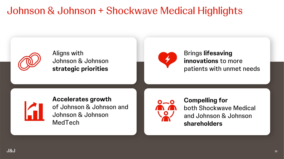 | | Accelerates sales growth: The acquisition of Shockwave accelerates Johnson & Johnson MedTechs ongoing efforts to increase its presence in high-growth markets with unmet need, while expanding its reach and scale globally. The proposed transaction adds a high-performing business in an underpenetrated category with a strong pipeline and an attractive growth and margin profile. The transaction is expected to accelerate revenue growth for both Johnson & Johnson and Johnson & Johnson MedTech. Shockwave is ultimately expected to become Johnson & Johnson MedTechs thirteenth priority platform, as defined by annual sales of at least $1 billion. |