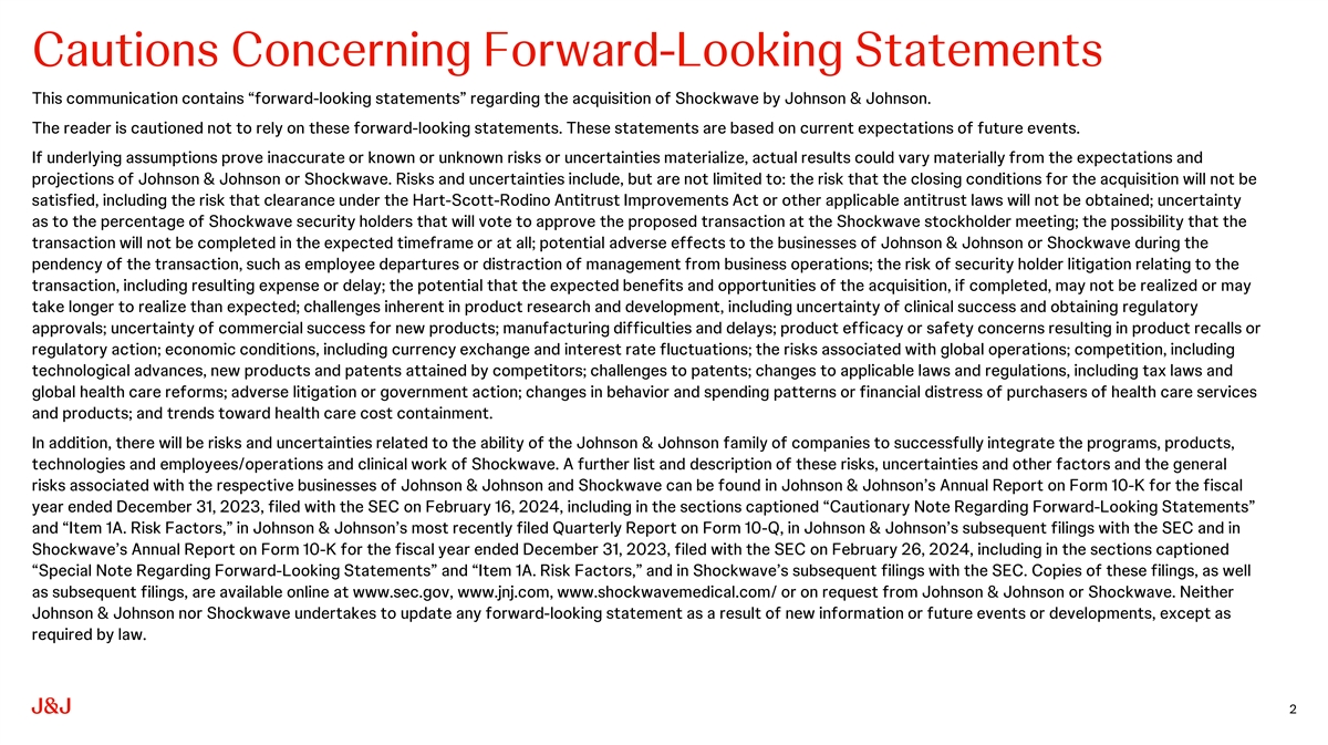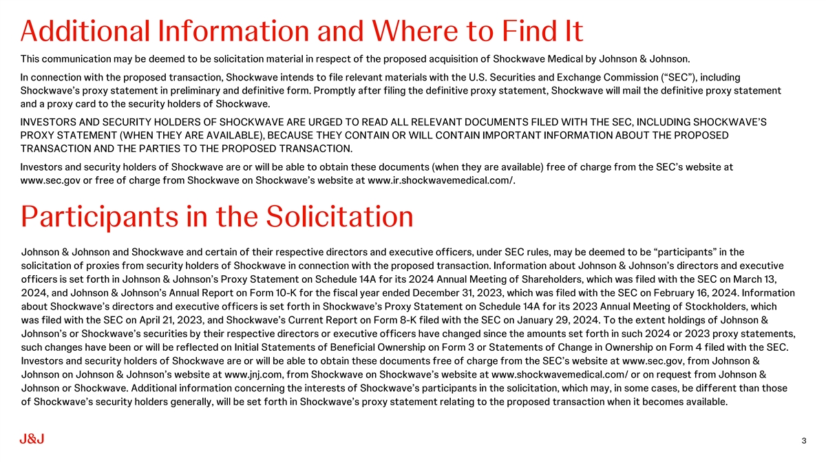 Cautions Concerning Forward-Looking Statements This communication contains “forward-looking statements” regarding the acquisition of Shockwave by Johnson & Johnson. The reader is cautioned not to rely on these forward-looking statements. These statements are based on current expectations of future events. If underlying assumptions prove inaccurate or known or unknown risks or uncertainties materialize, actual results could vary materially from the expectations and projections of Johnson & Johnson or Shockwave. Risks and uncertainties include, but are not limited to: the risk that the closing conditions for the acquisition will not be satisfied, including the risk that clearance under the Hart-Scott-Rodino Antitrust Improvements Act or other applicable antitrust laws will not be obtained; uncertainty as to the percentage of Shockwave security holders that will vote to approve the proposed transaction at the Shockwave stockholder meeting; the possibility that the transaction will not be completed in the expected timeframe or at all; potential adverse effects to the businesses of Johnson & Johnson or Shockwave during the pendency of the transaction, such as employee departures or distraction of management from business operations; the risk of security holder litigation relating to the transaction, including resulting expense or delay; the potential that the expected benefits and opportunities of the acquisition, if completed, may not be realized or may take longer to realize than expected; challenges inherent in product research and development, including uncertainty of clinical success and obtaining regulatory approvals; uncertainty of commercial success for new products; manufacturing difficulties and delays; product efficacy or safety concerns resulting in product recalls or regulatory action; economic conditions, including currency exchange and interest rate fluctuations; the risks associated with global operations; competition, including technological advances, new products and patents attained by competitors; challenges to patents; changes to applicable laws and regulations, including tax laws and global health care reforms; adverse litigation or government action; changes in behavior and spending patterns or financial distress of purchasers of health care services and products; and trends toward health care cost containment. In addition, there will be risks and uncertainties related to the ability of the Johnson & Johnson family of companies to successfully integrate the programs, products, technologies and employees/operations and clinical work of Shockwave. A further list and description of these risks, uncertainties and other factors and the general risks associated with the respective businesses of Johnson & Johnson and Shockwave can be found in Johnson & Johnson’s Annual Report on Form 10-K for the fiscal year ended December 31, 2023, filed with the SEC on February 16, 2024, including in the sections captioned “Cautionary Note Regarding Forward-Looking Statements” and “Item 1A. Risk Factors,” in Johnson & Johnson’s most recently filed Quarterly Report on Form 10-Q, in Johnson & Johnson’s subsequent filings with the SEC and in Shockwave’s Annual Report on Form 10-K for the fiscal year ended December 31, 2023, filed with the SEC on February 26, 2024, including in the sections captioned “Special Note Regarding Forward-Looking Statements” and “Item 1A. Risk Factors,” and in Shockwave’s subsequent filings with the SEC. Copies of these filings, as well as subsequent filings, are available online at www.sec.gov, www.jnj.com, www.shockwavemedical.com/ or on request from Johnson & Johnson or Shockwave. Neither Johnson & Johnson nor Shockwave undertakes to update any forward-looking statement as a result of new information or future events or developments, except as required by law. 2