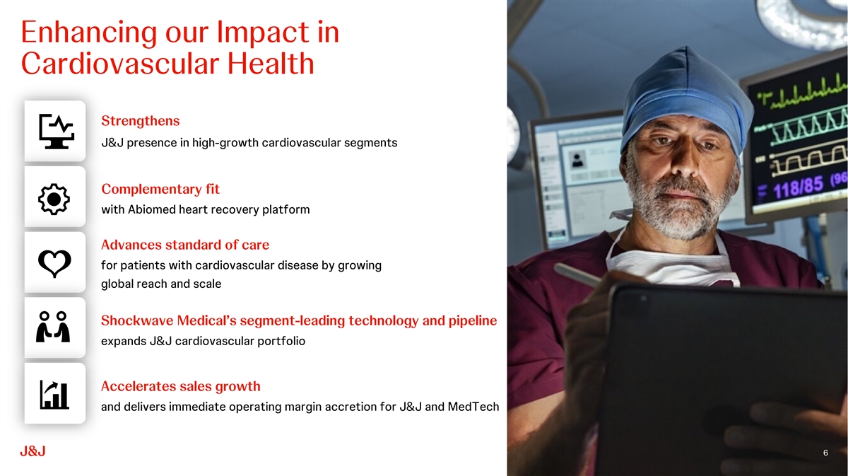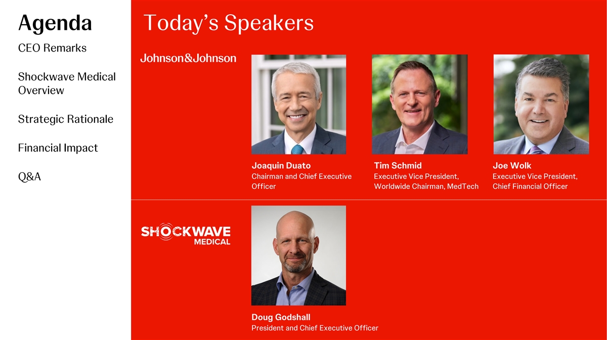 Agenda Today’s Speakers CEO Remarks Shockwave Medical Overview Strategic Rationale Financial Impact Joaquin Duato Tim Schmid Joe Wolk Chairman and Chief Executive Executive Vice President, Executive Vice President, Q&A Officer Worldwide Chairman, MedTech Chief Financial Officer Doug Godshall President and Chief Executive Officer
