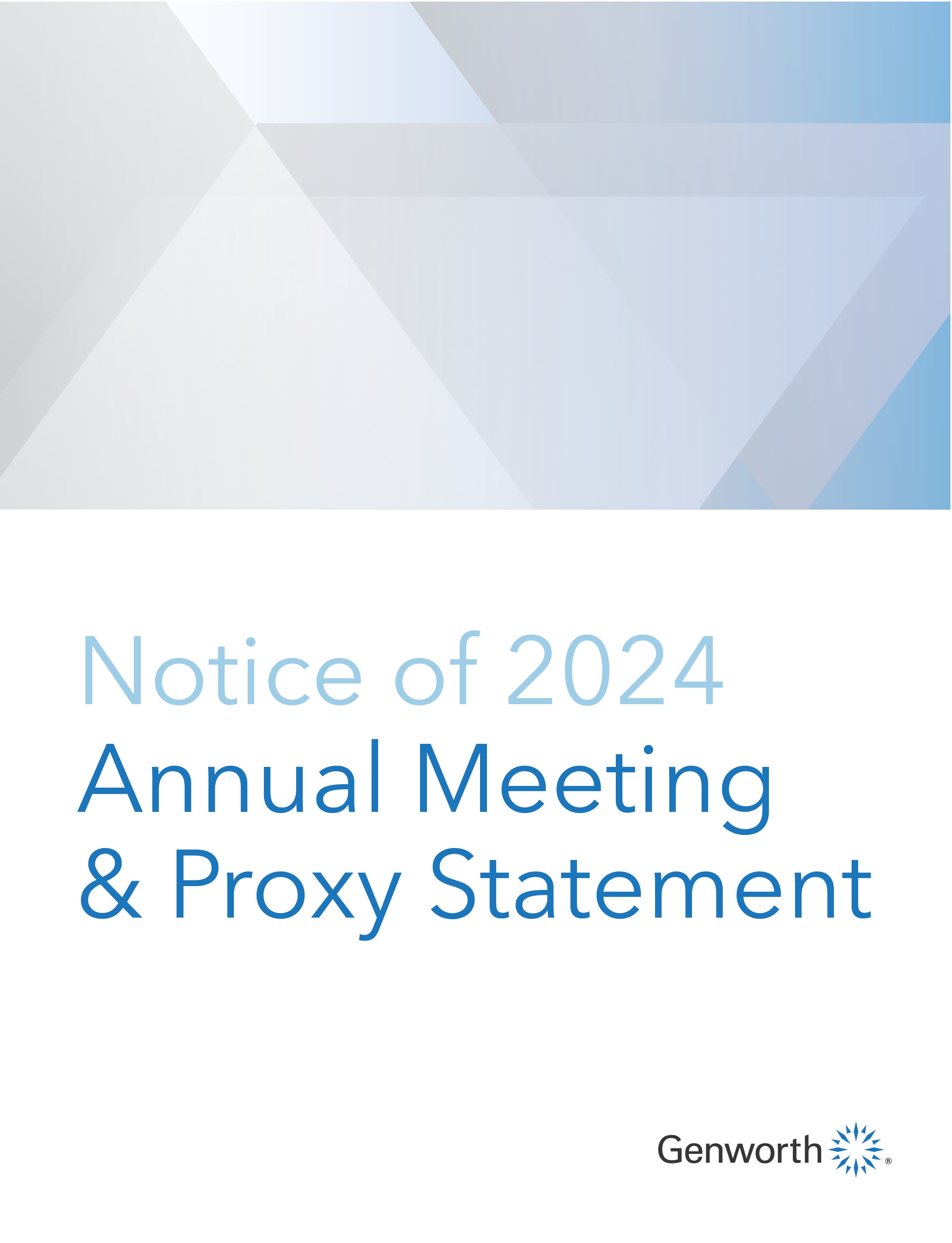 The Board of Directors invites you to attend the 2024 Annual Meeting of Stockholders of Genworth Financial, Inc. (the 2024 Annual Meeting), to be held virtually at 9 a.m. E.T. on May 23, 2024. You will be able to attend the meeting online, vote your shares electronically, and submit questions before or during the meeting via www.virtualshareholdermeeting.com/GNW2024. The 2024 Annual Meeting will include a report on our