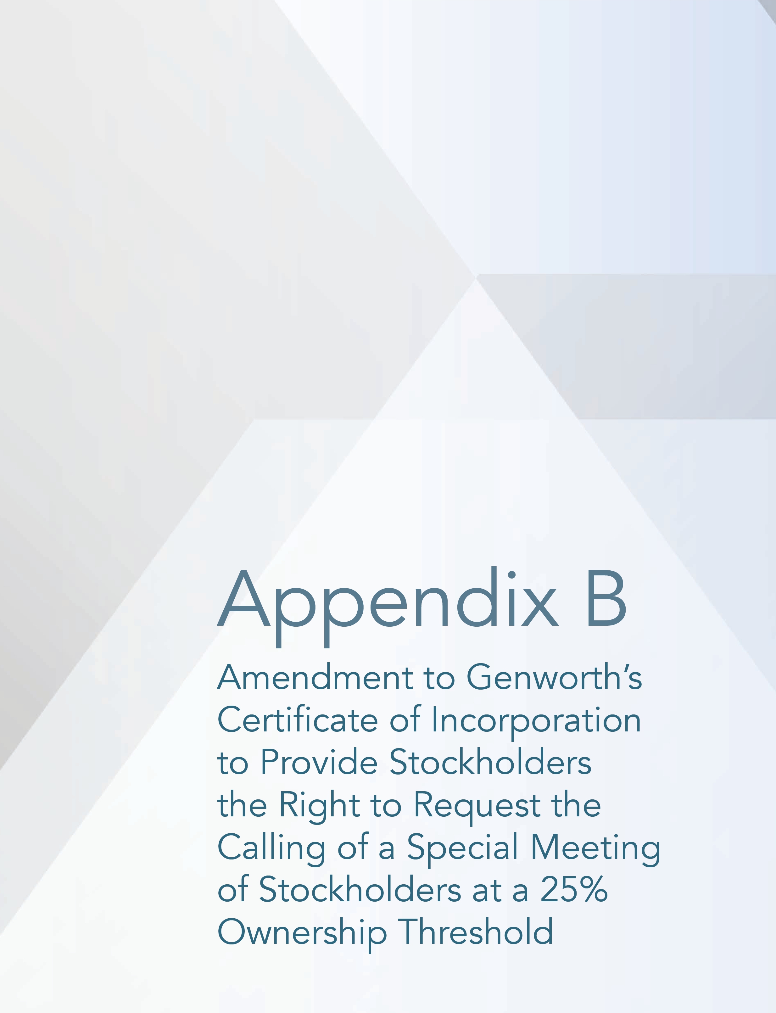 | 5. | Approval of an Amendment to Genworth's Certificate of Incorporation to Provide Stockholders the Right to Request the Calling of a Special Meeting of Stockholders at a 25% Ownership Threshold. | ☐ | ☐ | ☐ | |||