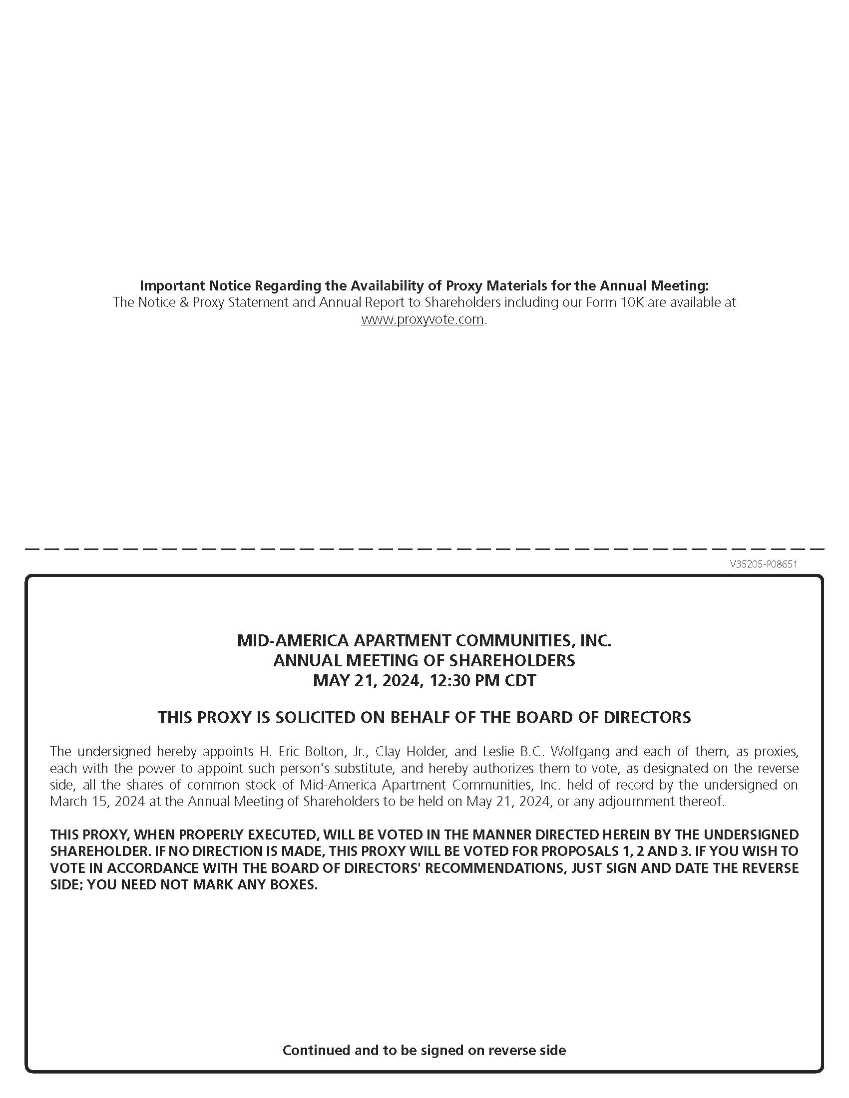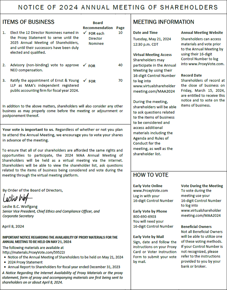 As we celebrate 30 years as a public company, I am pleased to invite you to attend the 2024 Annual Meeting of Shareholders of Mid-America Apartment Communities, Inc. The meeting will be held at 12:30 p.m., Central Daylight Time, on Tuesday, May 21, 2024. We will be conducting the meeting online in order to provide all of our shareholders the same opportunity to participate as they would have at an in-person meeting, including the right to vote and the ability to ask questions through the virtual meeting platform. We believe a virtual-only format allows equal access to our shareholders as it eliminates both the time and cost associated with physically attending the meeting for our geographically dispersed shareholders and any health concerns or other limitations of our shareholders, associates and Directors.