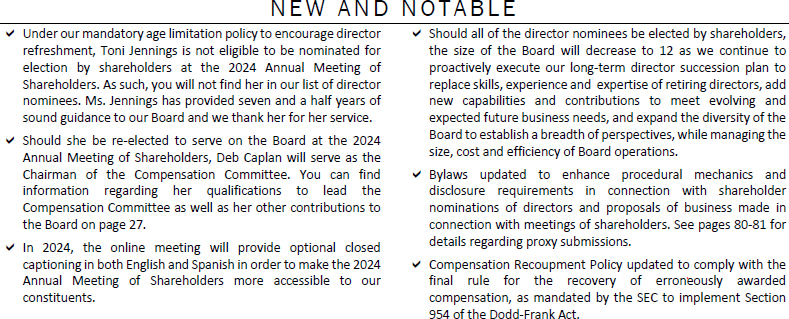 In anticipation of Ms. Jenning’s departure, as well as future planned retirements, we asked shareholders to appoint three new directors at our 2023 Annual Meeting of Shareholders as part of our long-term proactive director succession efforts, and shareholders elected Deborah Caplan, John Case and Tamara Fischer to our Board of Directors. This temporarily increased the size of our Board of Directors to thirteen members. Mses. Caplan and Fischer and Mr. Case have all been re-nominated for election by shareholders at the 2024 Annual Meeting of Shareholders. Should all director nominees be elected at the 2024 Annual Meeting of Shareholders, the size of the Board of Directors will reduce to twelve members. As we continue to execute our long-term succession plans, we anticipate the size of the Board of Directors will further reduce.