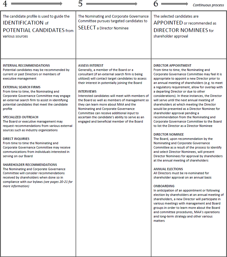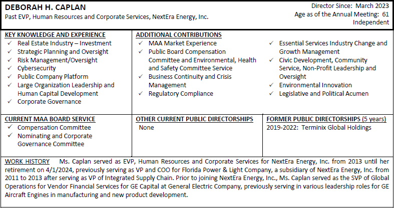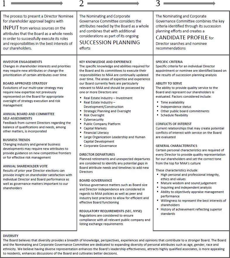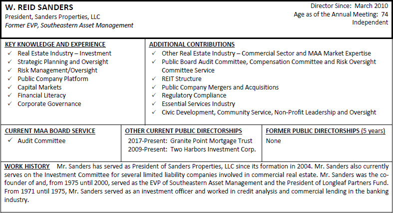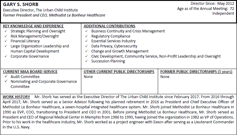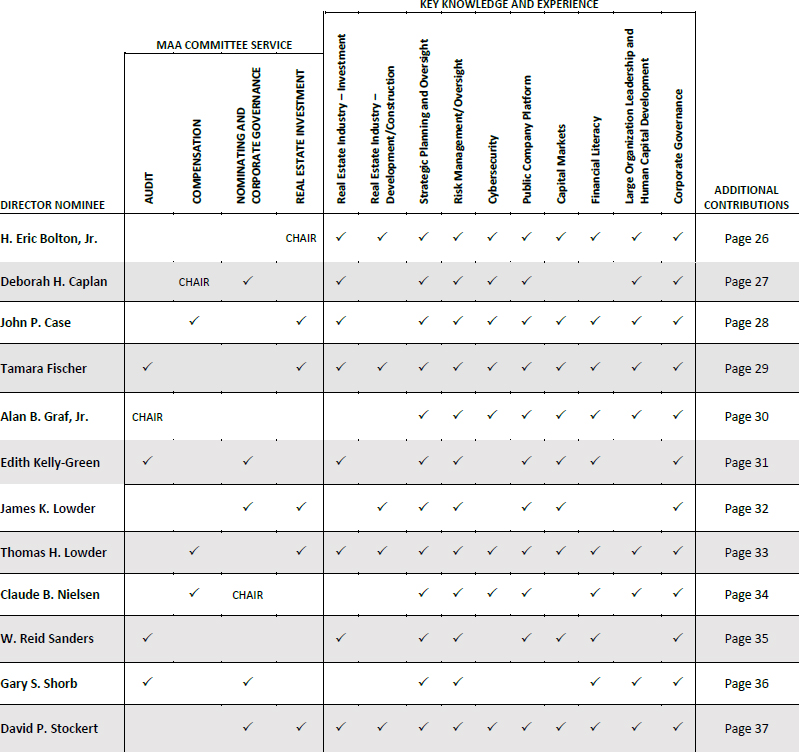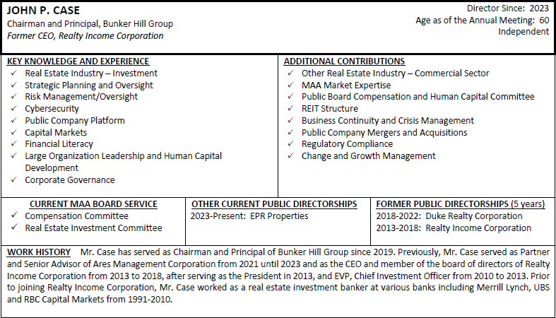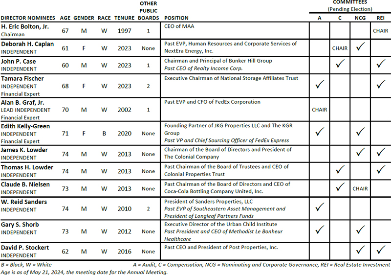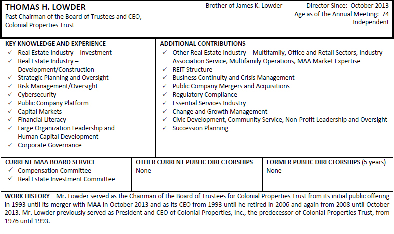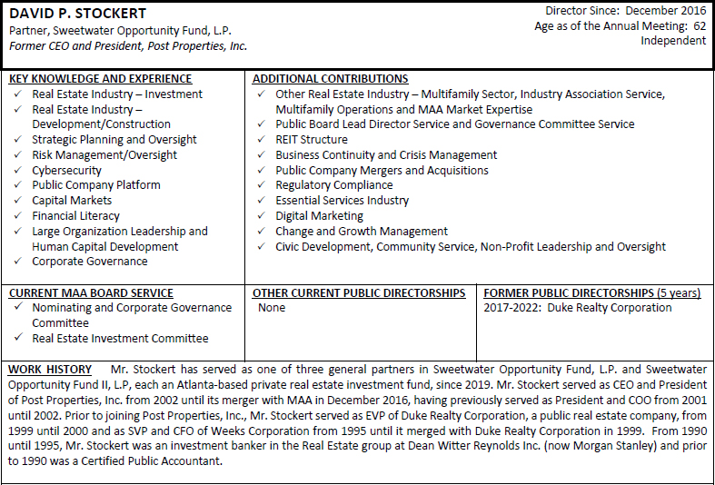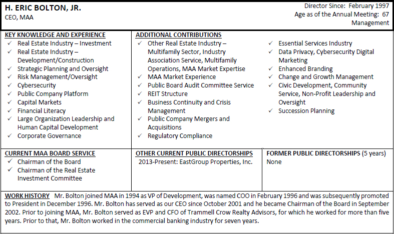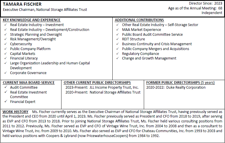 On behalf of the Board of Directors and my fellow associates, I would like to recognize Toni Jennings for her nearly seven and a half years of service to MAA as a member of our Board of Directors. Ms. Jennings is ineligible to be nominated for re-election at the 2024 Annual Meeting of Shareholders under our mandatory retirement policy. Ms. Jennings joined the MAA Board of Directors as part of our merger with Post Properties, Inc. in December 2016, after having served on the Post Properties, Inc. board of directors for five years. Her prior service to Post Properties, Inc. helped ensure a smooth and successful integration of our companies and her knowledge, experience and dedicated service continued to provide valuable guidance to MAA after the merger. We are grateful for Ms. Jennings’ years of enthusiastic representation of our shareholders and wish her the best with her future endeavors.
