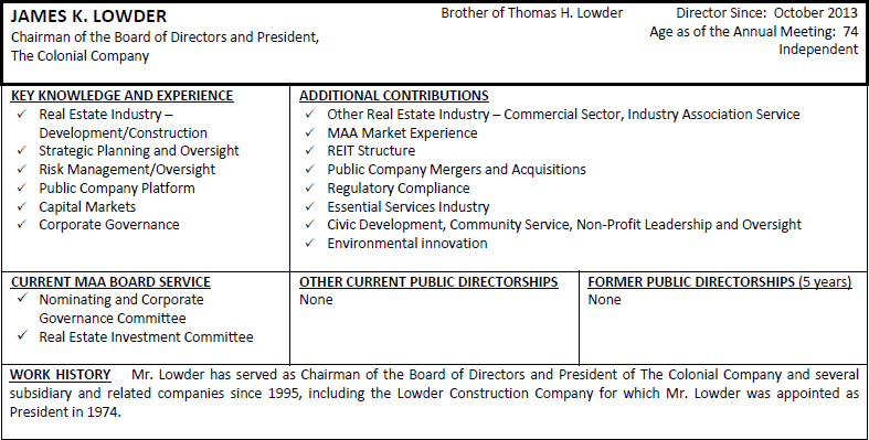 | Director | A current member of the Board Board of Directors of Mid-America Apartment Communities, Inc. |