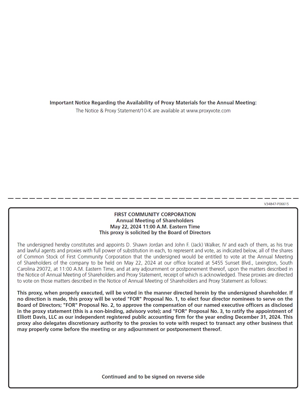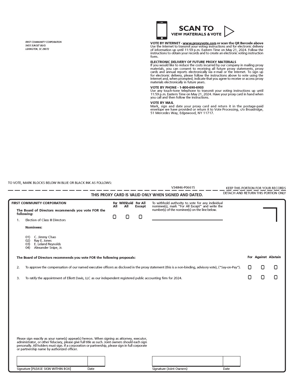 Important Notice Regarding the Availability of Proxy Materials for the Annual Meeting: The Notice & Proxy Statement/10-K are available at www.proxyvote.com V34847-P06615 FIRST COMMUNITY CORPORATION Annual Meeting of Shareholders May 22, 2024 11:00 A.M. Eastern Time This proxy is solicited by the Board of Directors The undersigned hereby constitutes and appoints D. Shawn Jordan and John F. (Jack) Walker, IV and each of them, as his true and lawful agents and proxies with full power of substitution in each, to represent and vote, as indicated below, all of the shares of Common Stock of First Community Corporation that the undersigned would be entitled to vote at the Annual Meeting of Shareholders of the company to be held on May 22, 2024 at our office located at 5455 Sunset Blvd., Lexington, South Carolina 29072, at 11:00 A.M. Eastern Time, and at any adjournment or postponement thereof, upon the matters described in the Notice of Annual Meeting of Shareholders and Proxy Statement, receipt of which is acknowledged. These proxies are directed to vote on those matters described in the Notice of Annual Meeting of Shareholders and Proxy Statement as follows: This proxy, when properly executed, will be voted in the manner directed herein by the undersigned shareholder. If no direction is made, this proxy will be voted "FOR" Proposal No. 1, to elect four director nominees to serve on the Board of Directors; "FOR" Proposal No. 2, to approve the compensation of our named executive officers as disclosed in the proxy statement (this is a non-binding, advisory vote); and "FOR" Proposal No. 3, to ratify the appointment of Elliott Davis, LLC as our independent registered public accounting firm for the year ending December 31, 2024. This proxy also delegates discretionary authority to the proxies to vote with respect to transact any other business that may properly come before the meeting or any adjournment or postponement thereof. Continued and to be signed on reverse side
