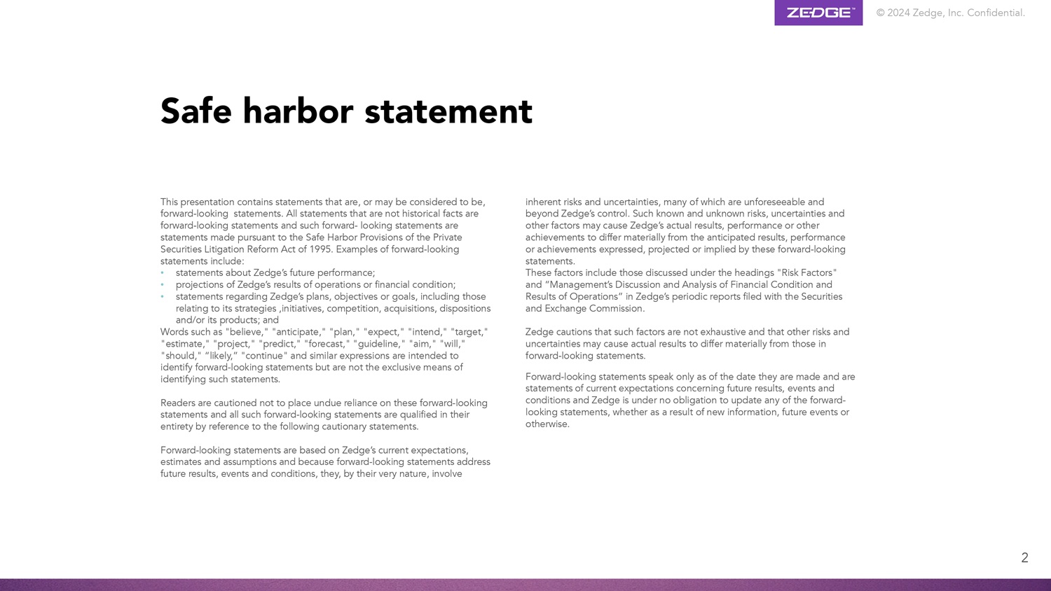 © 2024 Zedge, Inc. Confidential. 2 This presentation contains statements that are, or may be considered to be, forward - looking statements. All statements that are not historical facts are forward - looking statements and such forward - looking statements are statements made pursuant to the Safe Harbor Provisions of the Private Securities Litigation Reform Act of 1995. Examples of forward - looking statements include: • statements about Zedge’s future performance; • projections of Zedge’s results of operations or financial condition; • statements regarding Zedge’s plans, objectives or goals, including those relating to its strategies ,initiatives, competition, acquisitions, dispositions and/or its products; and Words such as "believe," "anticipate," "plan," "expect," "intend," "target," "estimate," "project," "predict," "forecast," "guideline," "aim," "will," "should," “likely,” "continue" and similar expressions are intended to identify forward - looking statements but are not the exclusive means of identifying such statements. Readers are cautioned not to place undue reliance on these forward - looking statements and all such forward - looking statements are qualified in their entirety by reference to the following cautionary statements. Forward - looking statements are based on Zedge’s current expectations, estimates and assumptions and because forward - looking statements address future results, events and conditions, they, by their very nature, involve inherent risks and uncertainties, many of which are unforeseeable and beyond Zedge’s control. Such known and unknown risks, uncertainties and other factors may cause Zedge’s actual results, performance or other achievements to differ materially from the anticipated results, performance or achievements expressed, projected or implied by these forward - looking statements. These factors include those discussed under the headings "Risk Factors" and “Management’s Discussion and Analysis of Financial Condition and Results of Operations” in Zedge’s periodic reports filed with the Securities and Exchange Commission. Zedge cautions that such factors are not exhaustive and that other risks and uncertainties may cause actual results to differ materially from those in forward - looking statements. Forward - looking statements speak only as of the date they are made and are statements of current expectations concerning future results, events and conditions and Zedge is under no obligation to update any of the forward - looking statements, whether as a result of new information, future events or otherwise. Safe harbor statement