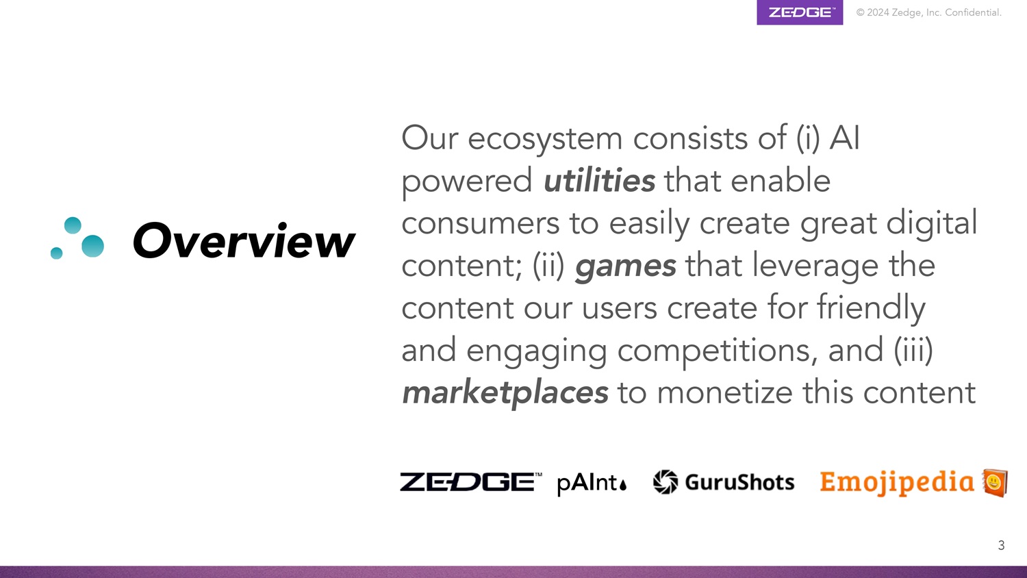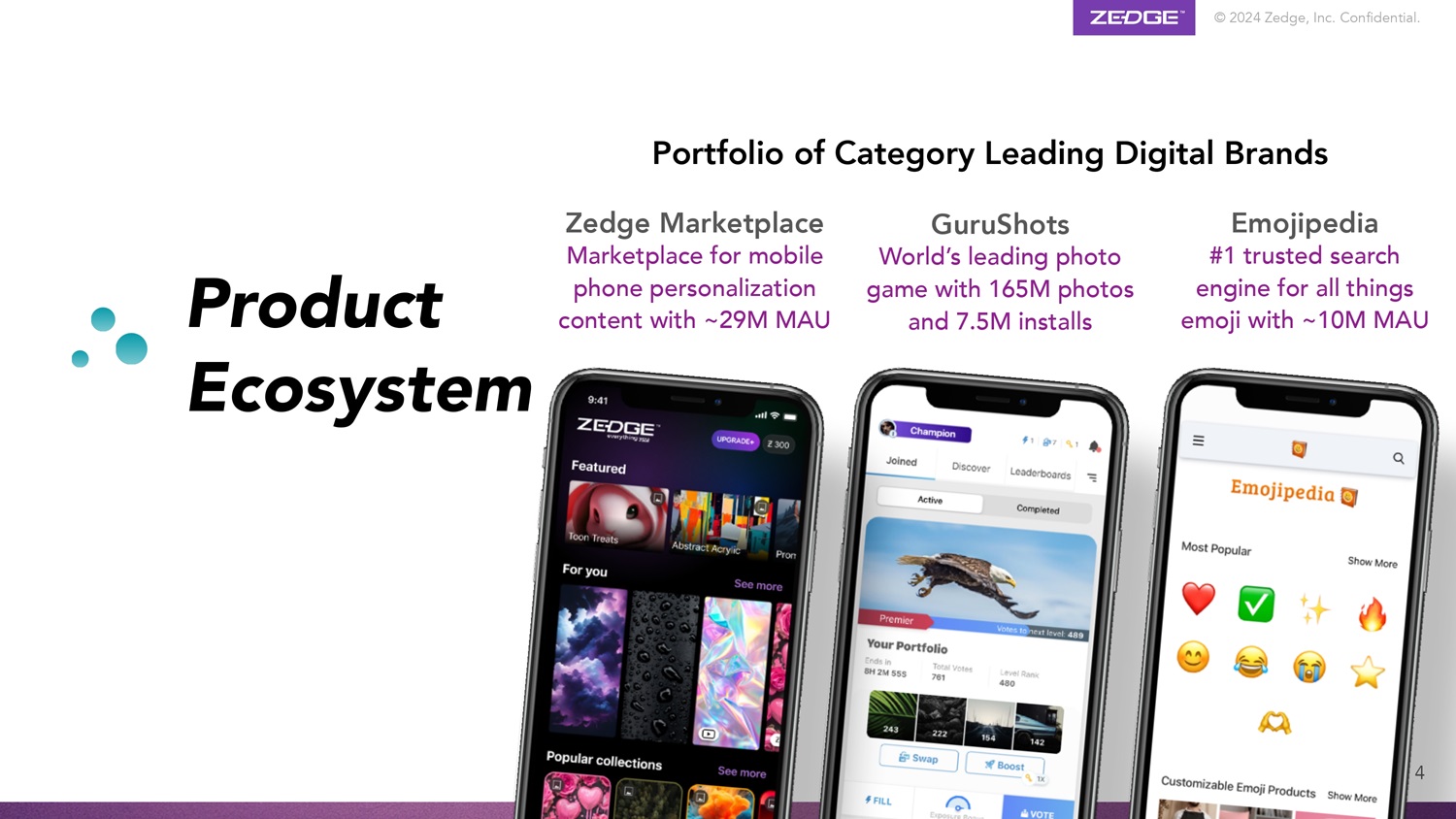 © 2024 Zedge, Inc. Confidential. Overview Our ecosystem consists of (i) AI powered utilities that enable consumers to easily create great digital content; (ii) games that leverage the content our users create for friendly and engaging competitions, and (iii) marketplaces to monetize this content p AI nt 3